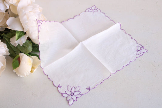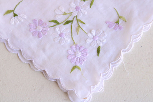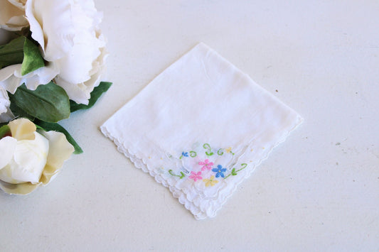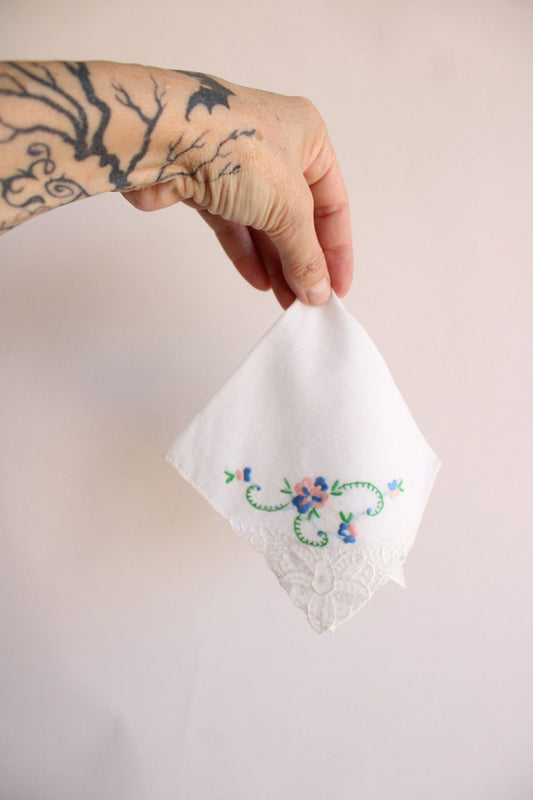 Vintage 1950s White Cotton With Pink And Blue Embroidered Flowers Hanky