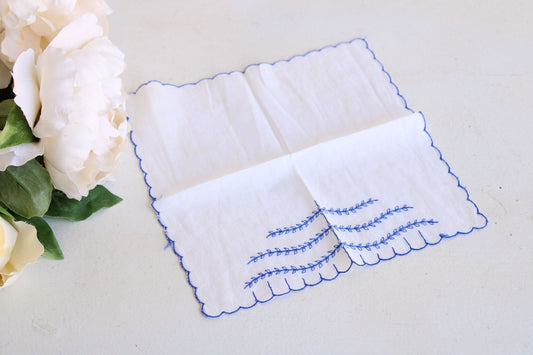 Vintage White Cotton With Blue Embroidered Roses Hanky