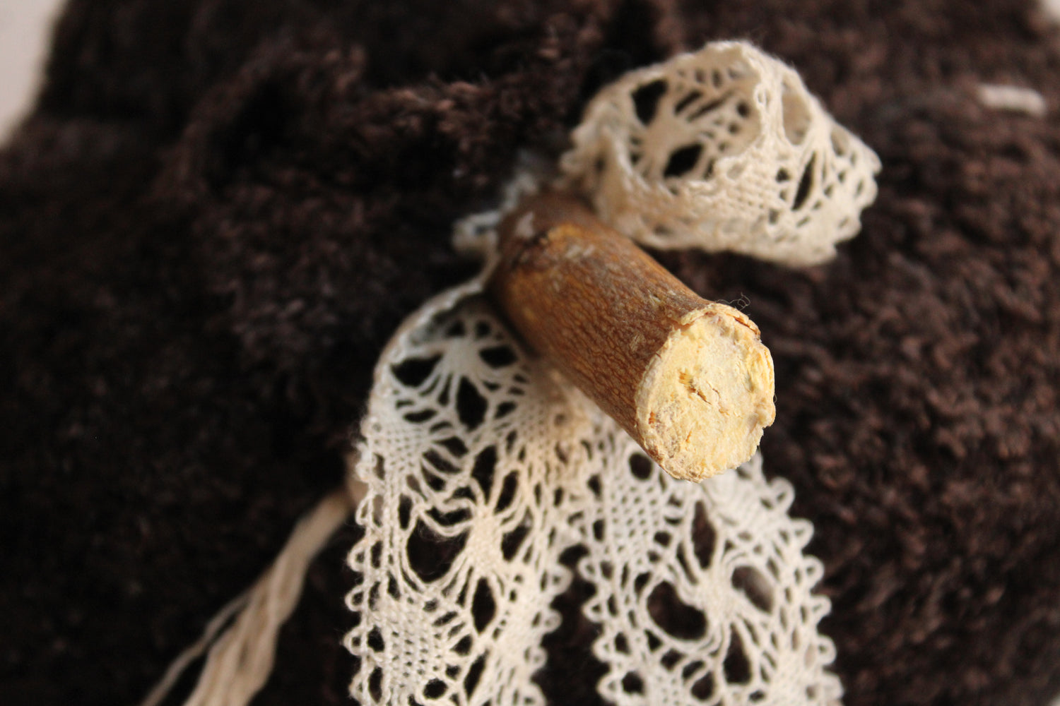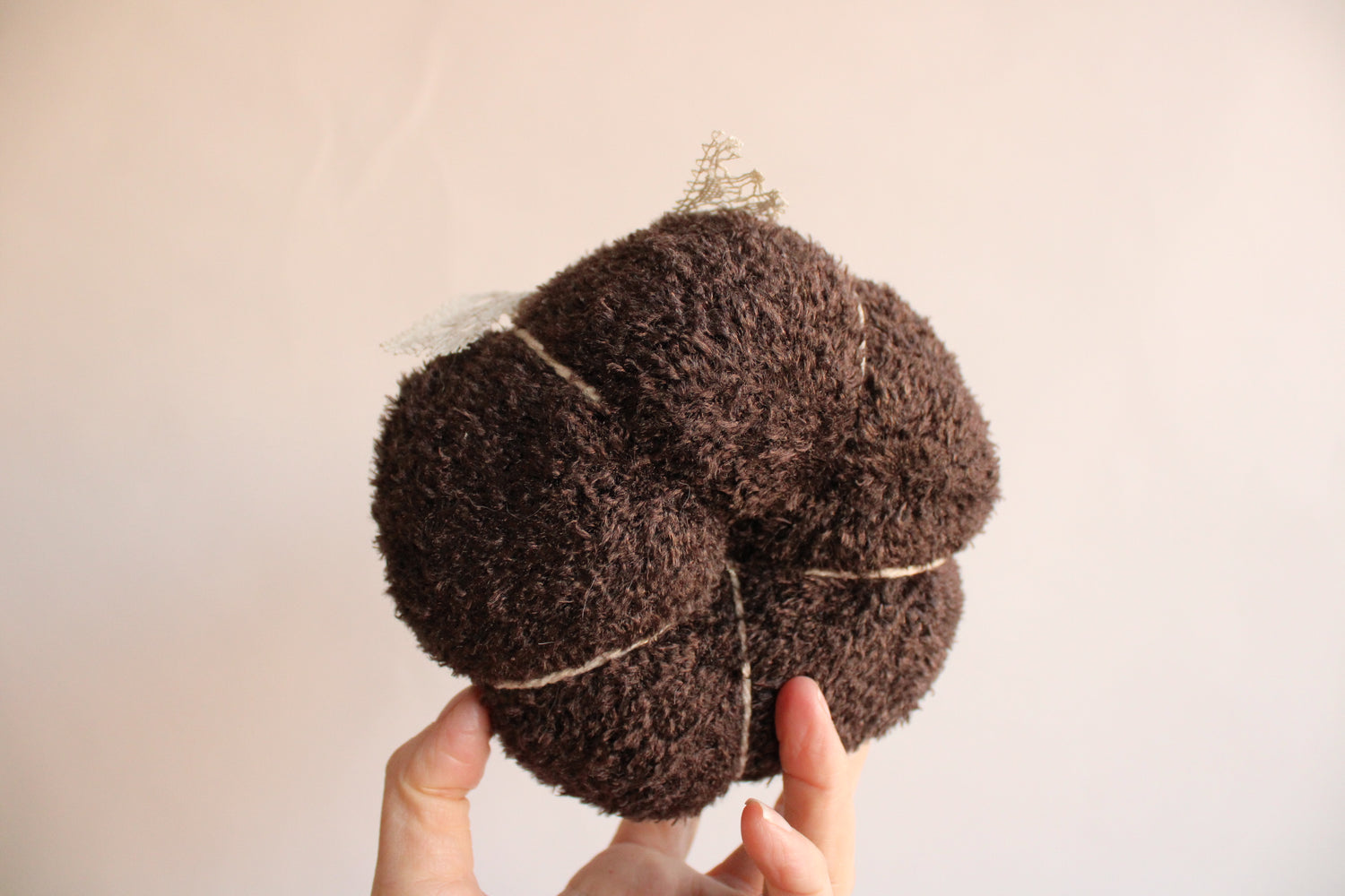 Cozy knit pumpkin pillow pouf in brown chenille with antique airy lace, and a hand foraged wood stick stem. With all these warm browns and creams we've named this one the Cafe Au Chocolat. Perfect for any farmhouse, Halloween, Christmas or cottage décor. One of a kind, measures about 6" in diameter and 3" high not including stem. No two are ever exactly alike. The knitted fabrics are sourced sustainably or knit by hand.