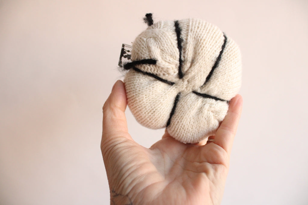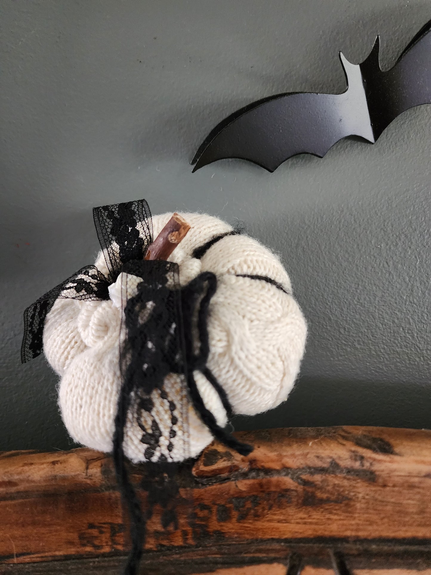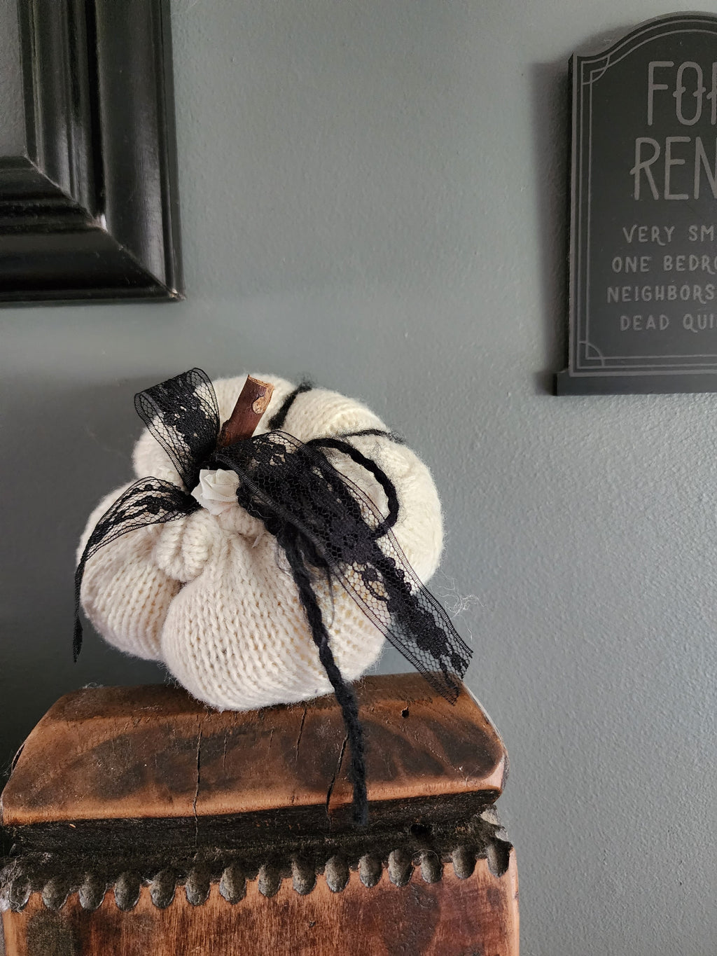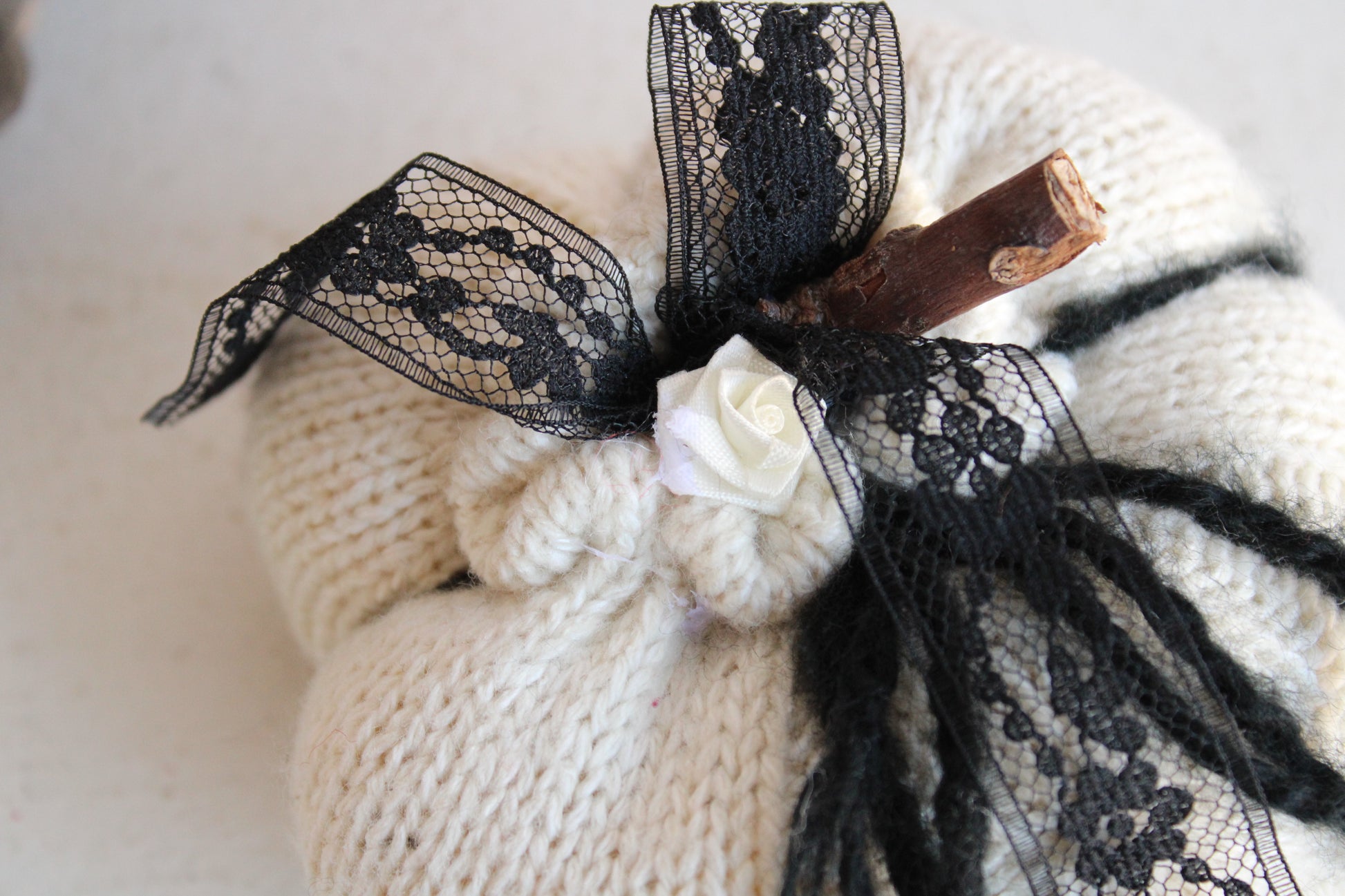 A mini pumpkin in a creay winter white cable knit. Embellished with black vintage lace and a wooden stem. One of a kind, measures about 4" in diameter and 2" high not including stem.