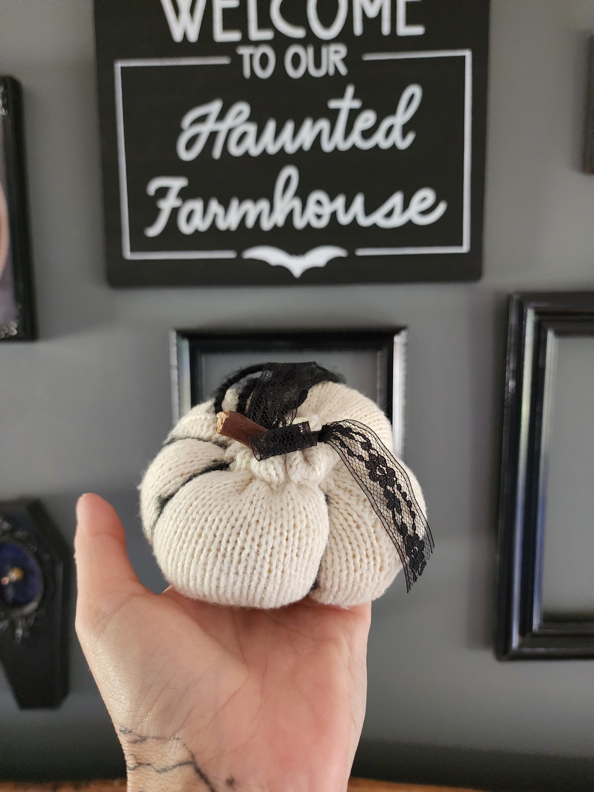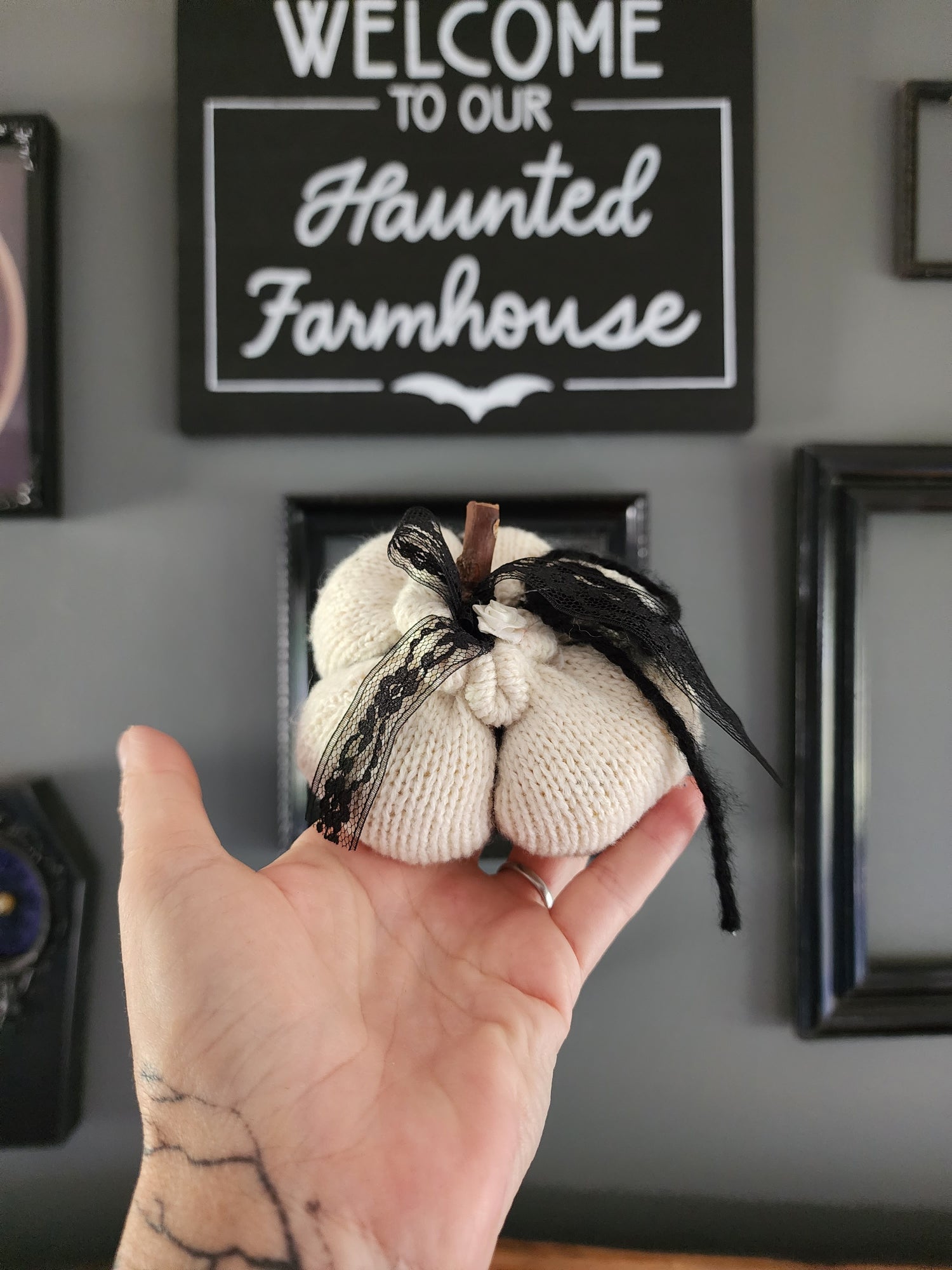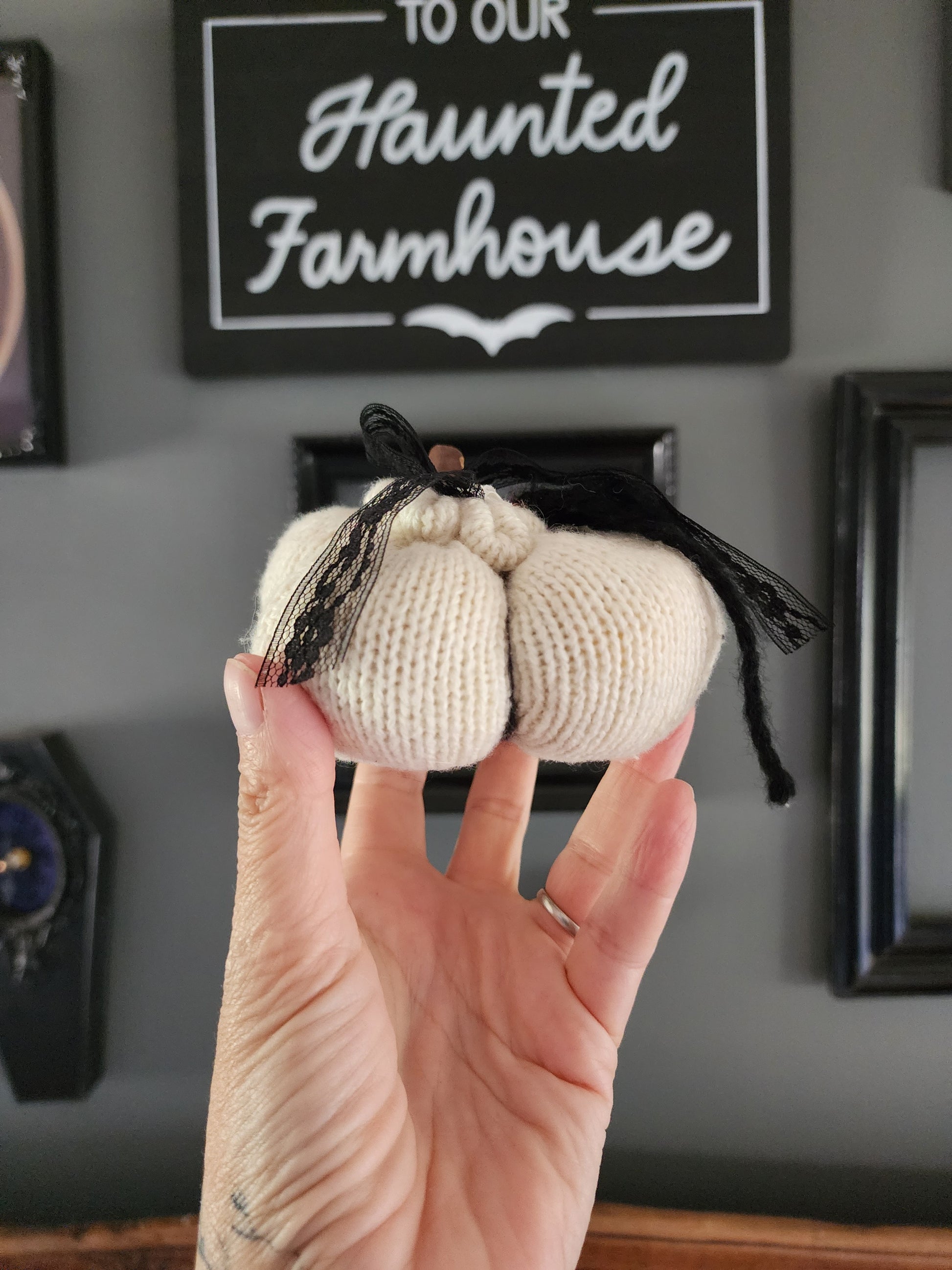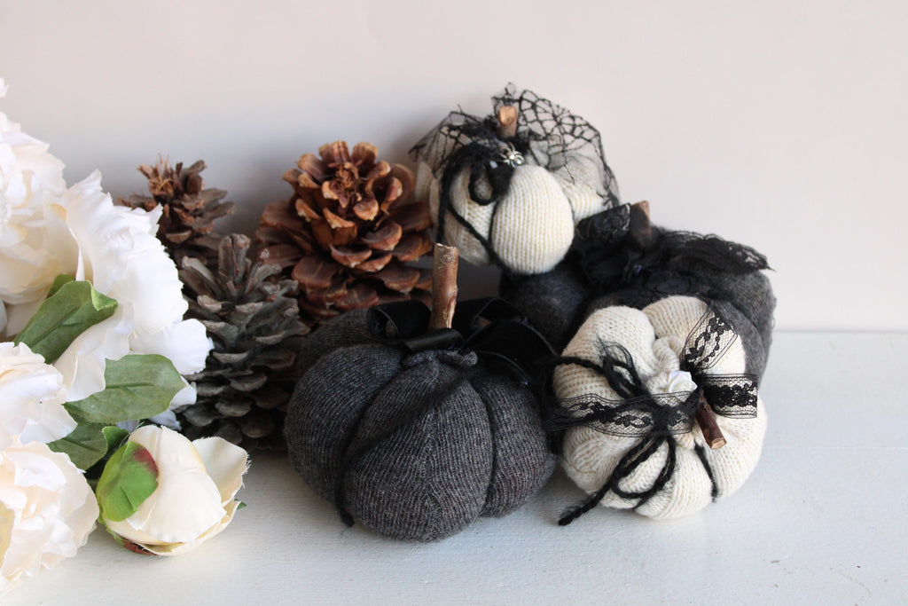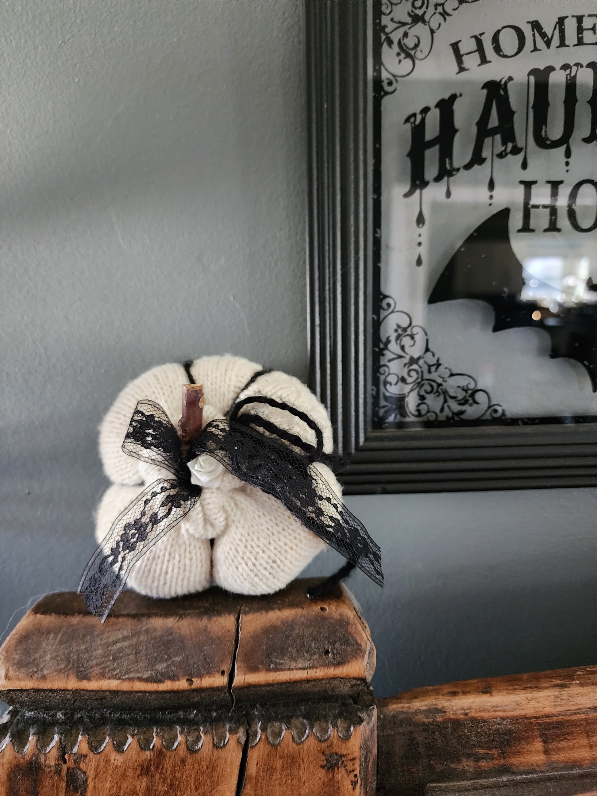 A mini pumpkin in a creay winter white cable knit. Embellished with black vintage lace and a wooden stem. One of a kind, measures about 4" in diameter and 2" high not including stem.