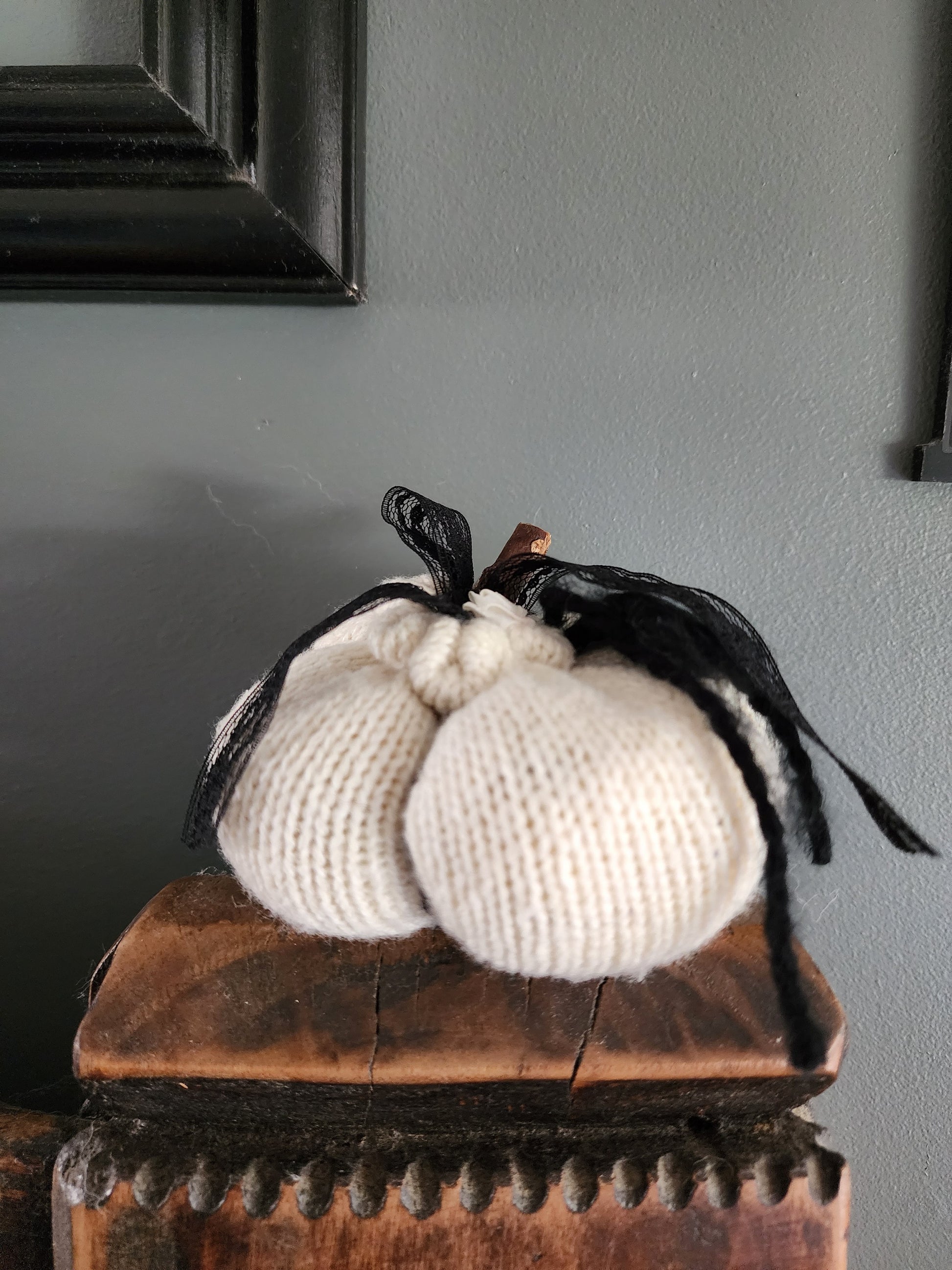 No two are ever exactly alike. The knitted fabrics are sourced sustainably or knit by hand. Embellishments are generally vintage or antique. Everything is sewn by hand, I don't even own a sewing machine, so slight irregularities in stitching and shape are to be expected and all part of their unique charm. Perfect for any farmhouse, Halloween or cottage décor.