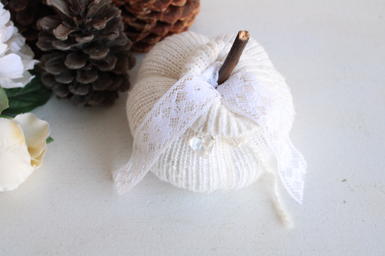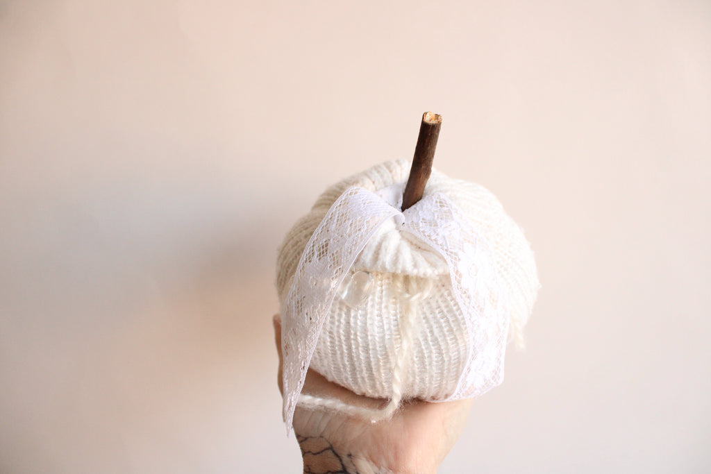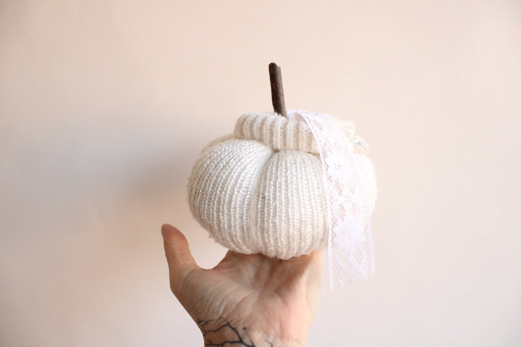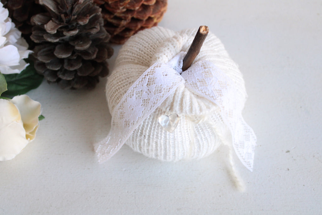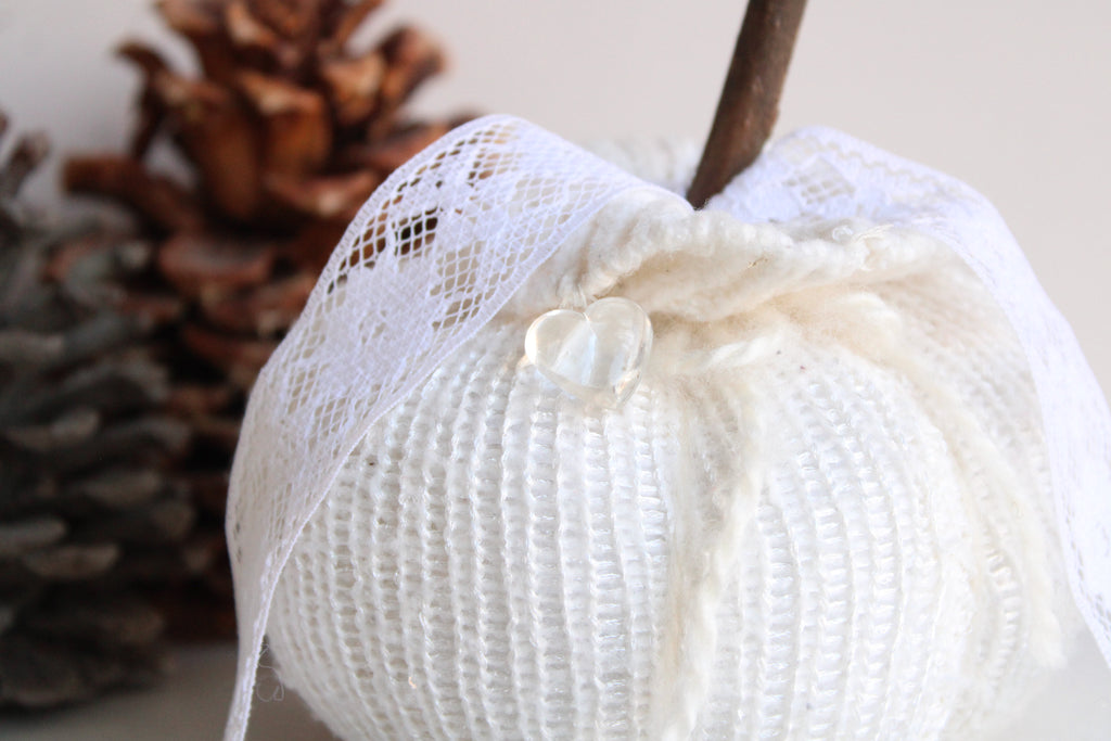 Cozy knit pumpkin pillow in creamy winter white with a small faux crystal heart. Perfect for any farmhouse, Halloween, Holiday or cottage décor. Embellished with vintage white lace "leaves" and a hand foraged wood stem. One of a kind, measures about 5.5" in diameter and 4" high not including stem. No two are ever exactly alike. The knitted fabrics are sourced sustainably or knit by hand.