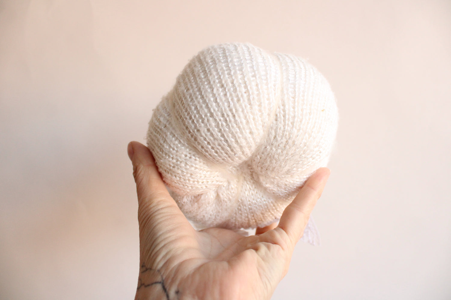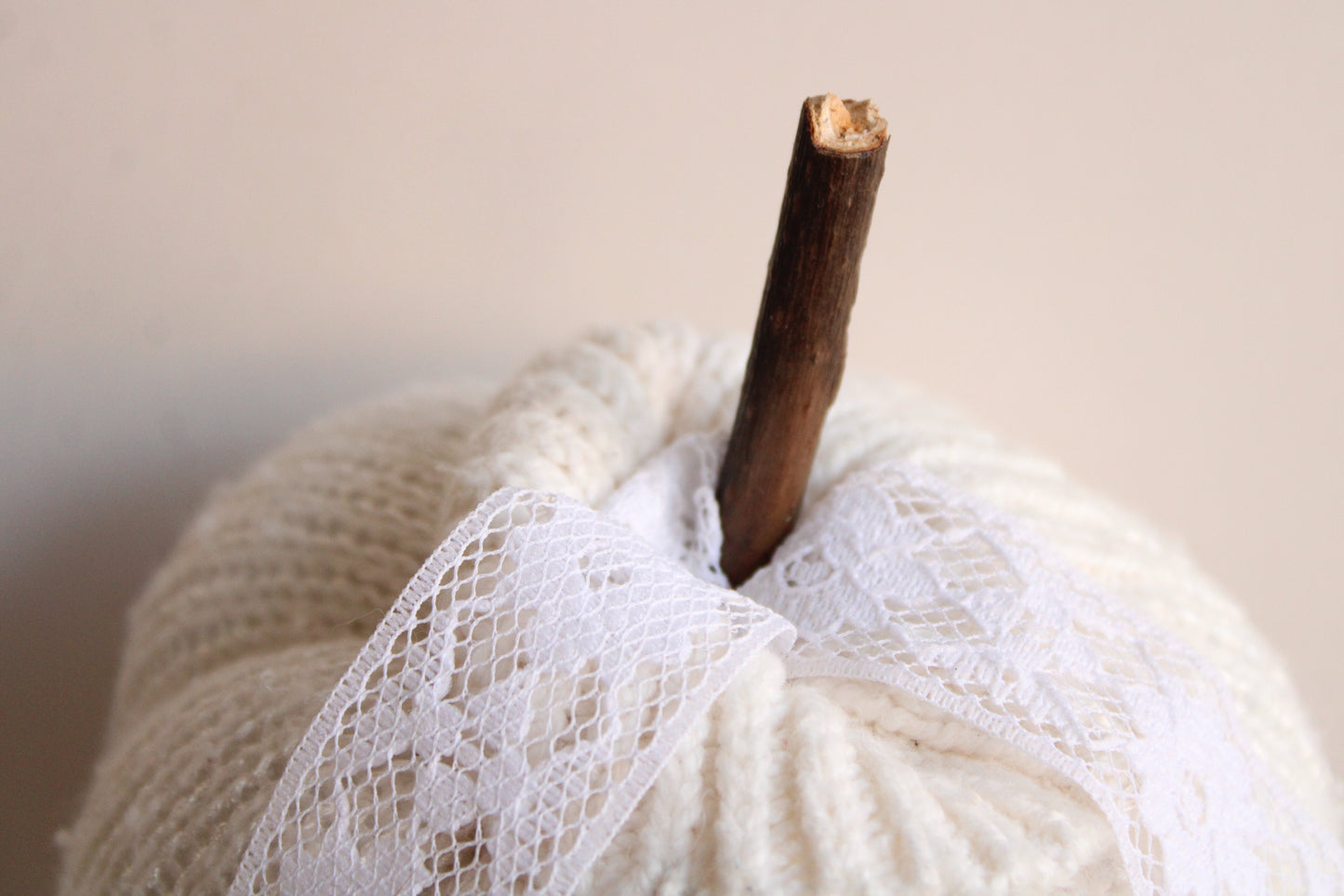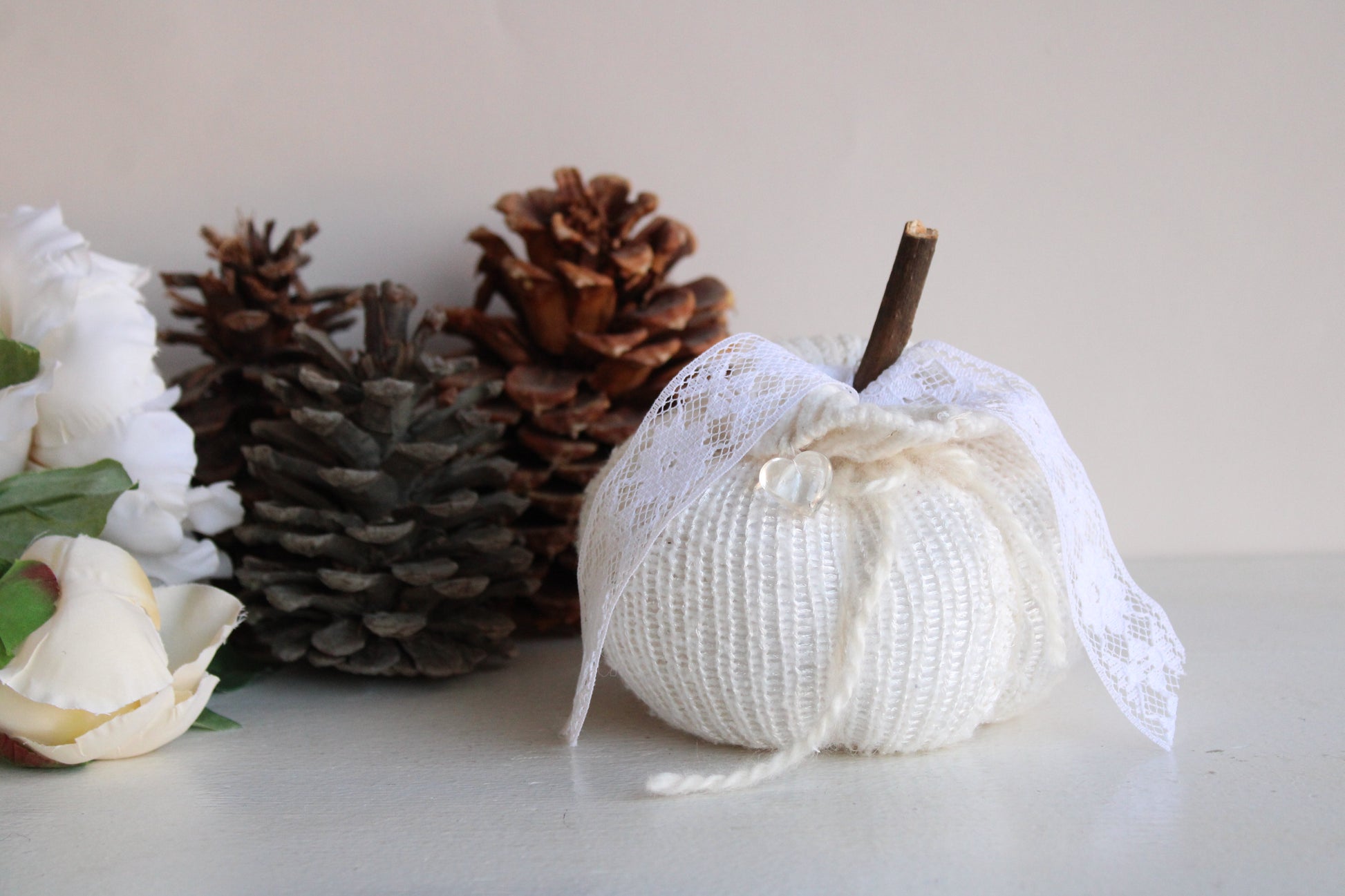 Cozy knit pumpkin pillow in creamy winter white with a small faux crystal heart. Perfect for any farmhouse, Halloween, Holiday or cottage décor. Embellished with vintage white lace "leaves" and a hand foraged wood stem. One of a kind, measures about 5.5" in diameter and 4" high not including stem. No two are ever exactly alike. The knitted fabrics are sourced sustainably or knit by hand.
