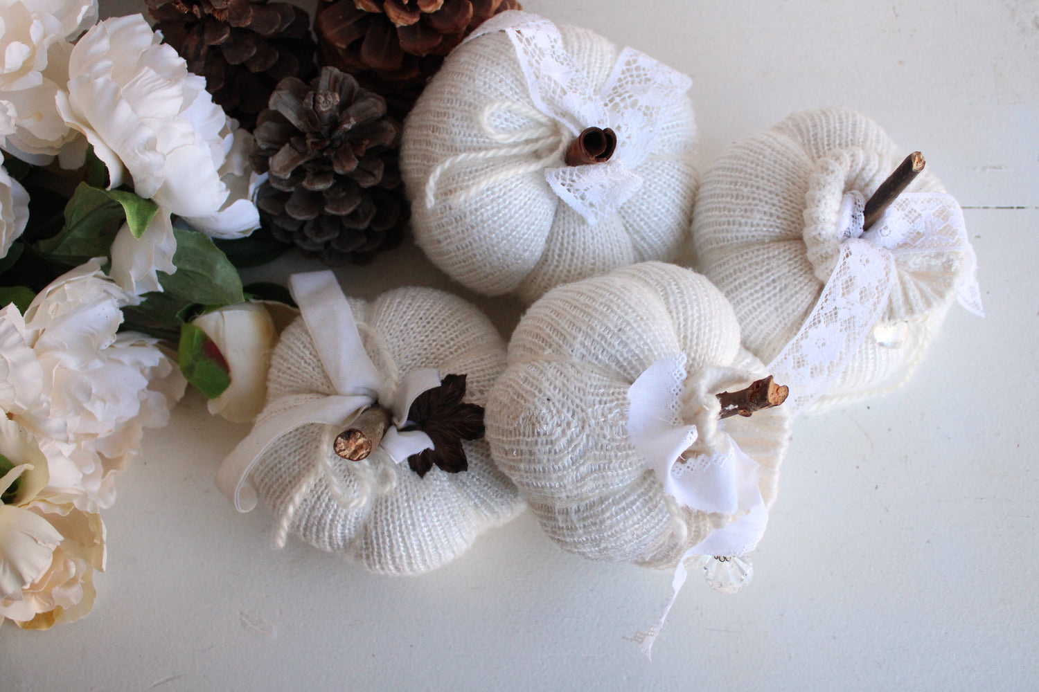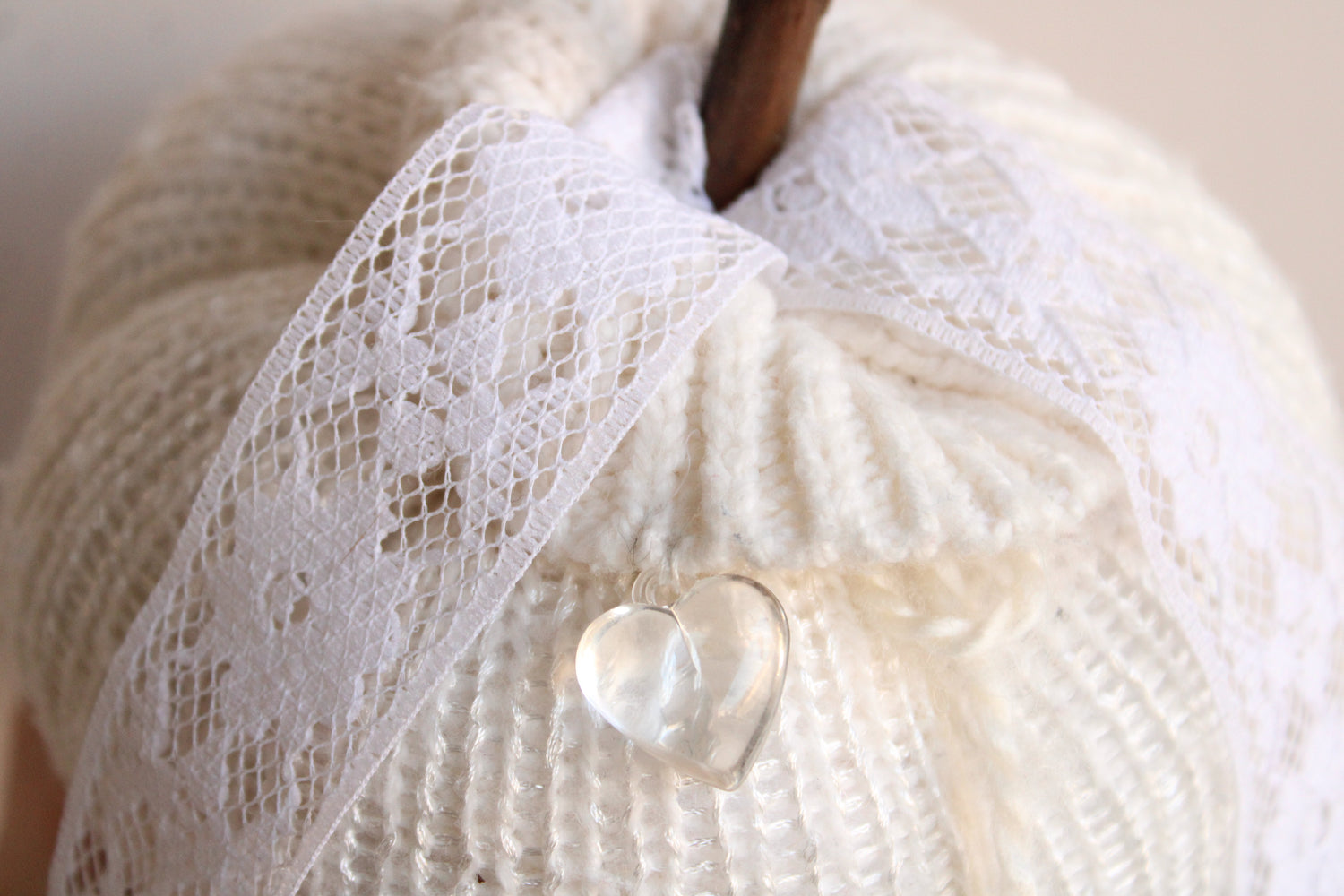Creamy White Knit Pumpkin PIllow Pouf with Vintage Lace And Crystal Heart