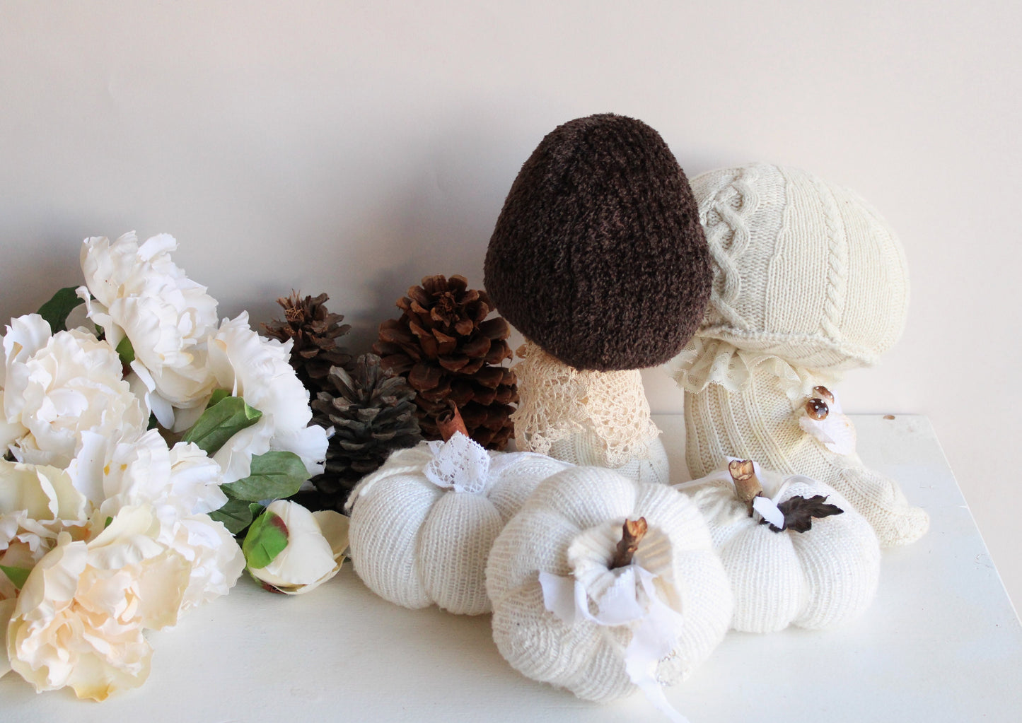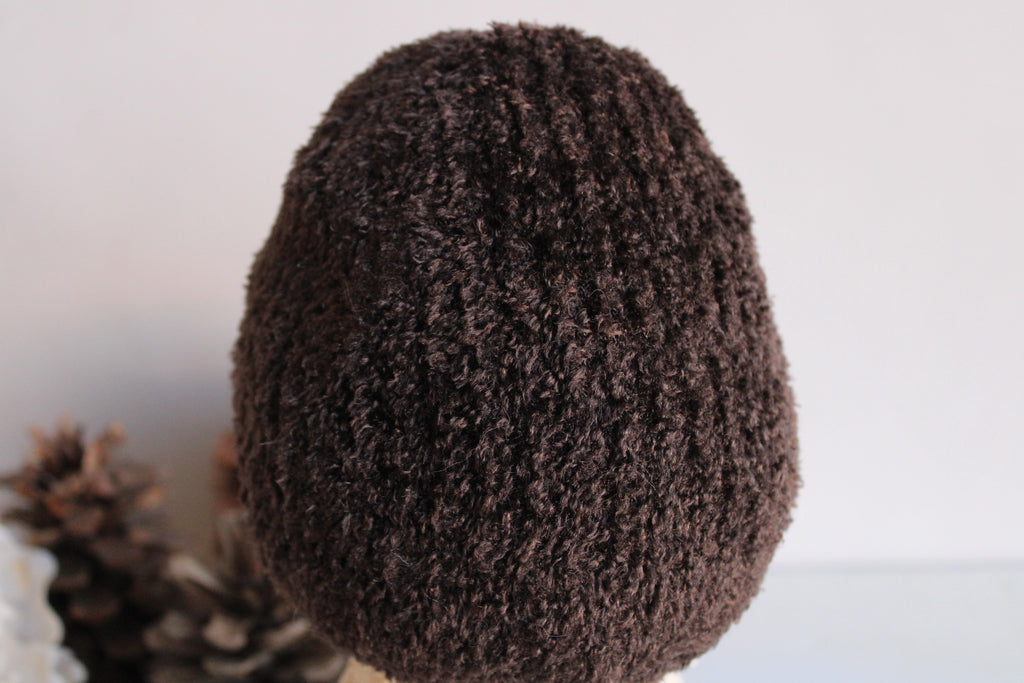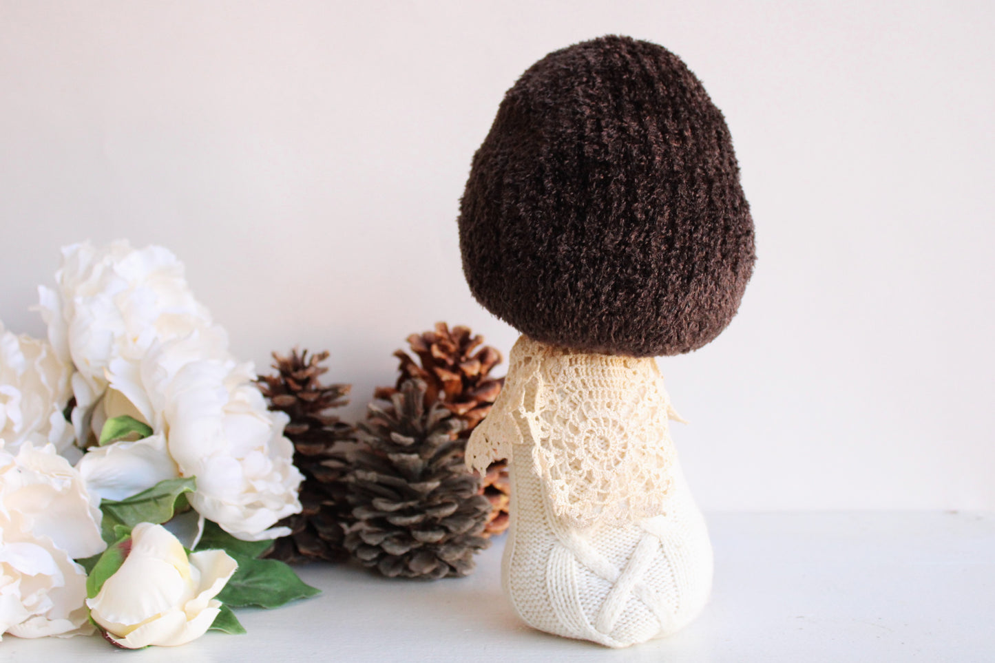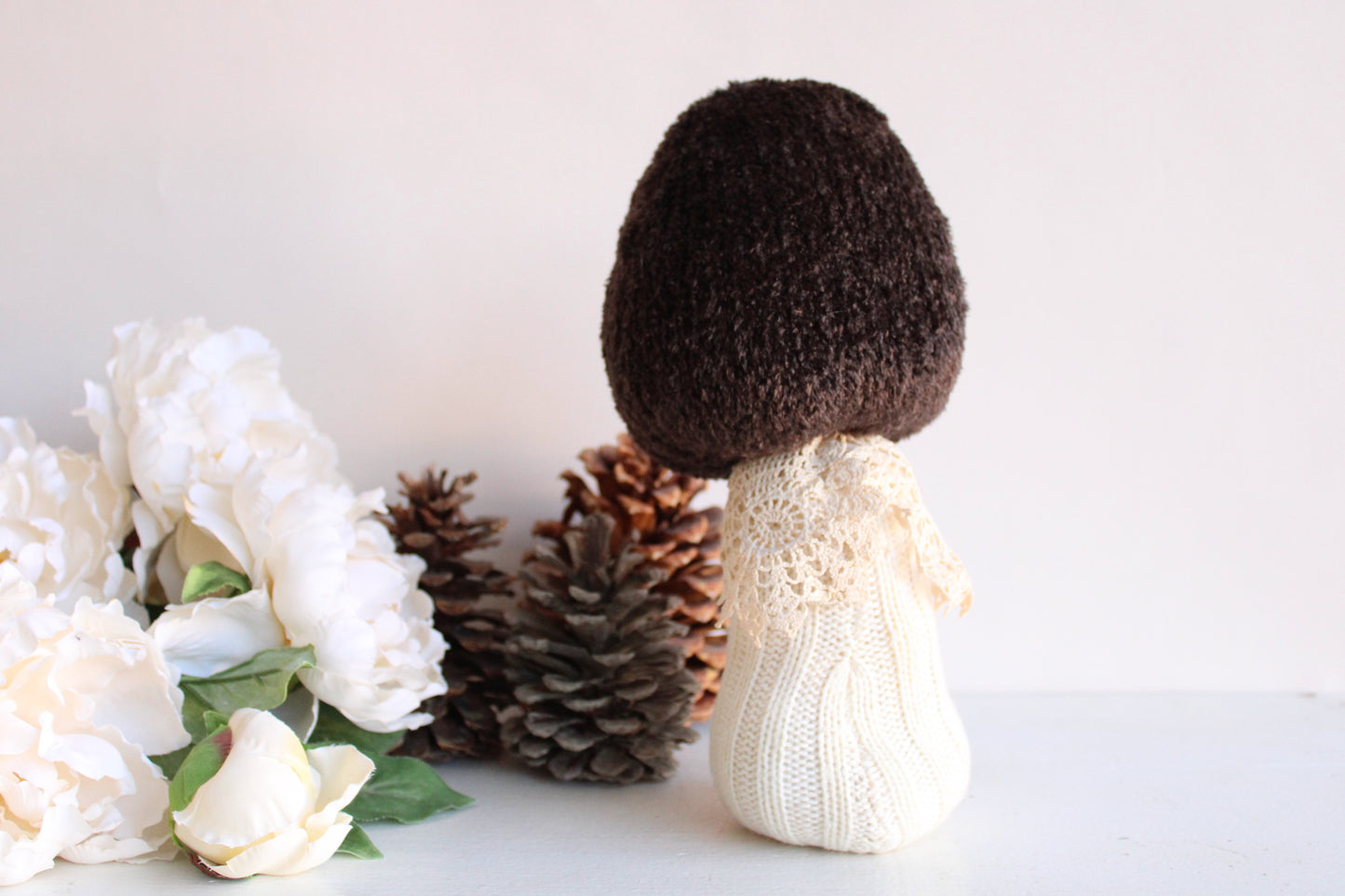 Charming winter white sweater toadstool with a brown chenille cap. Embellished with vintage lace. This is a protype of this design and I'm still working out the kinks so the cap is a bit floppy but to me that only adds to its charm! ( It is priced accordingly though). Would be so cute with my pumpkins!! One of a kind, measures about 12" high and the foot is about 4" in diameter and its filled with a lot of sand and little stones, so its pretty heavy! Shipping reflects this. No two are ever exactly alike. The knitted fabrics are sourced sustainably or knit by hand.