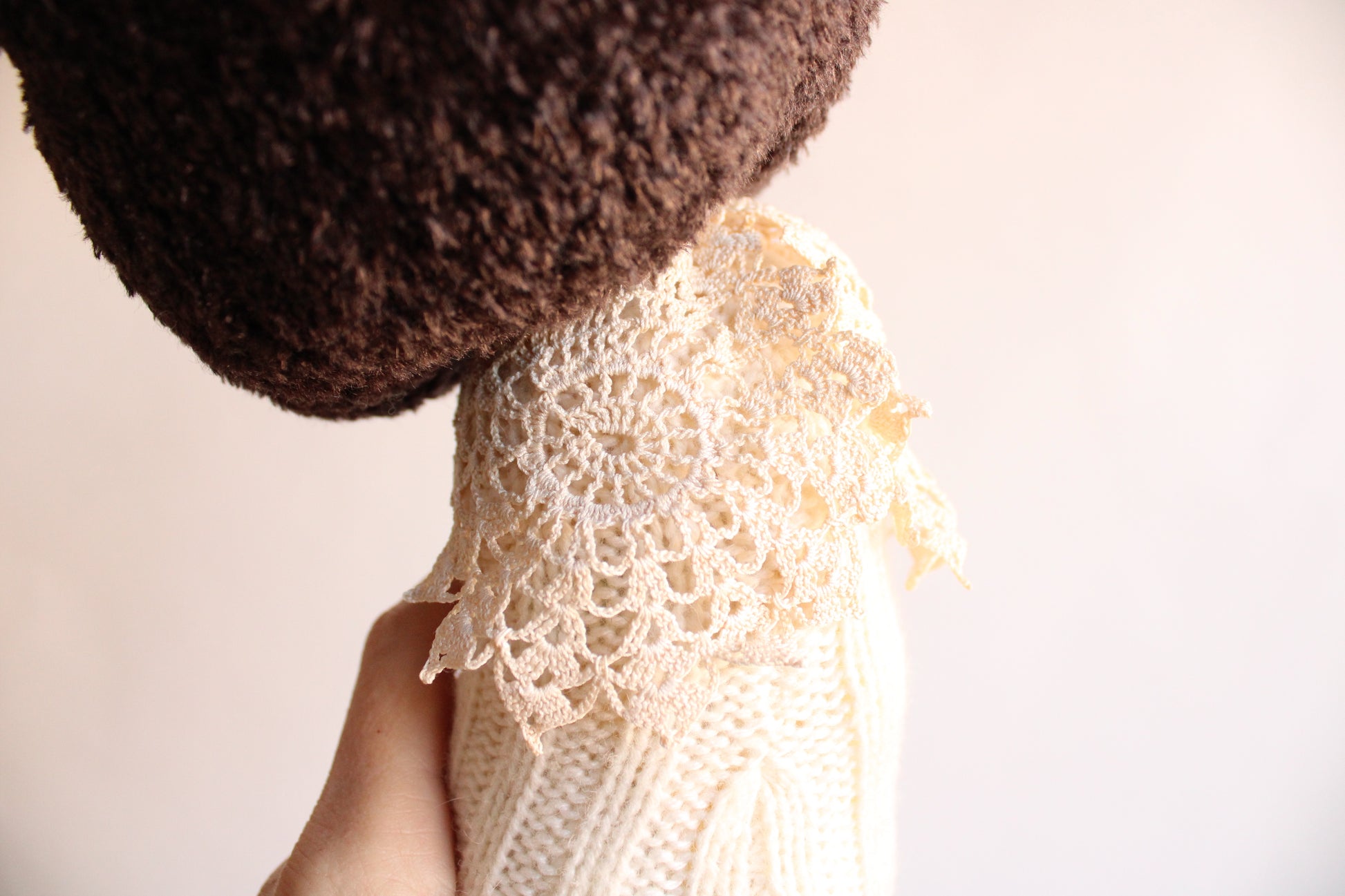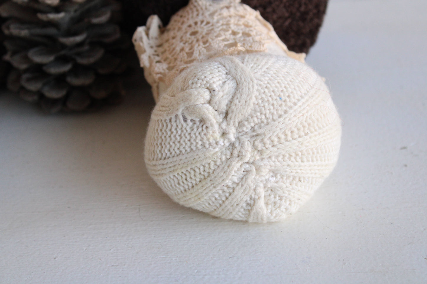 Handcrafted from sustainable materials and vintage laces and trims. All my handcrafted items are handknit or hand stitched. I don't even own a sewing machine!