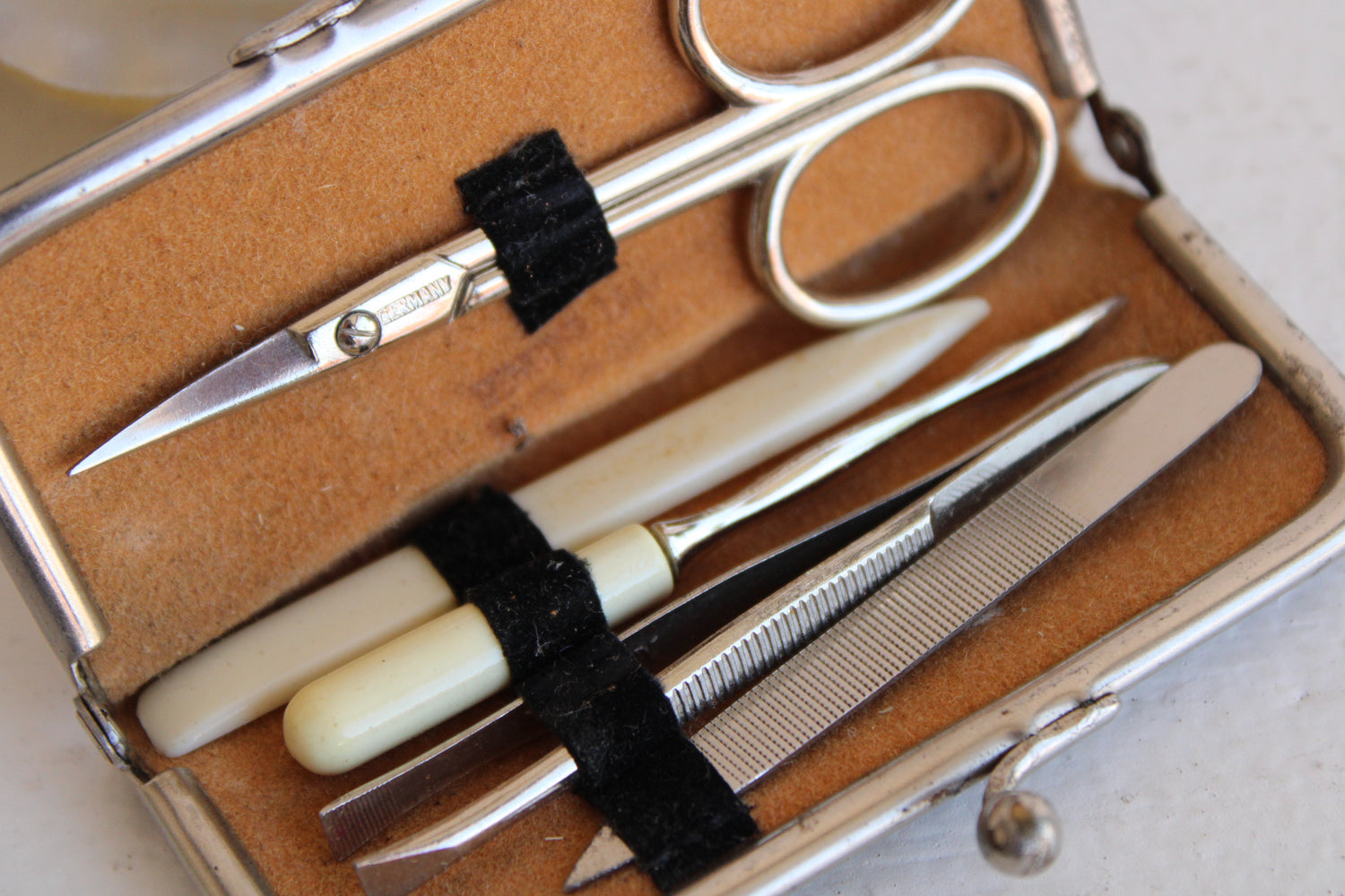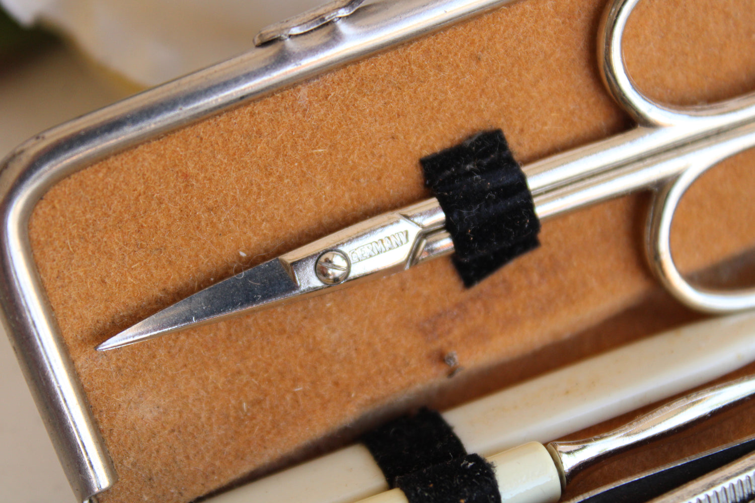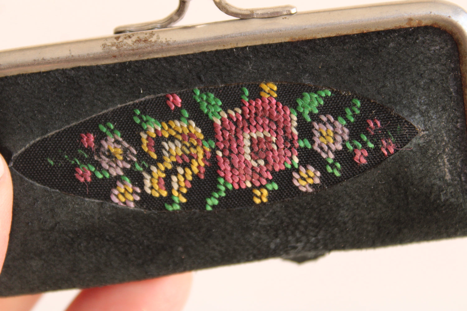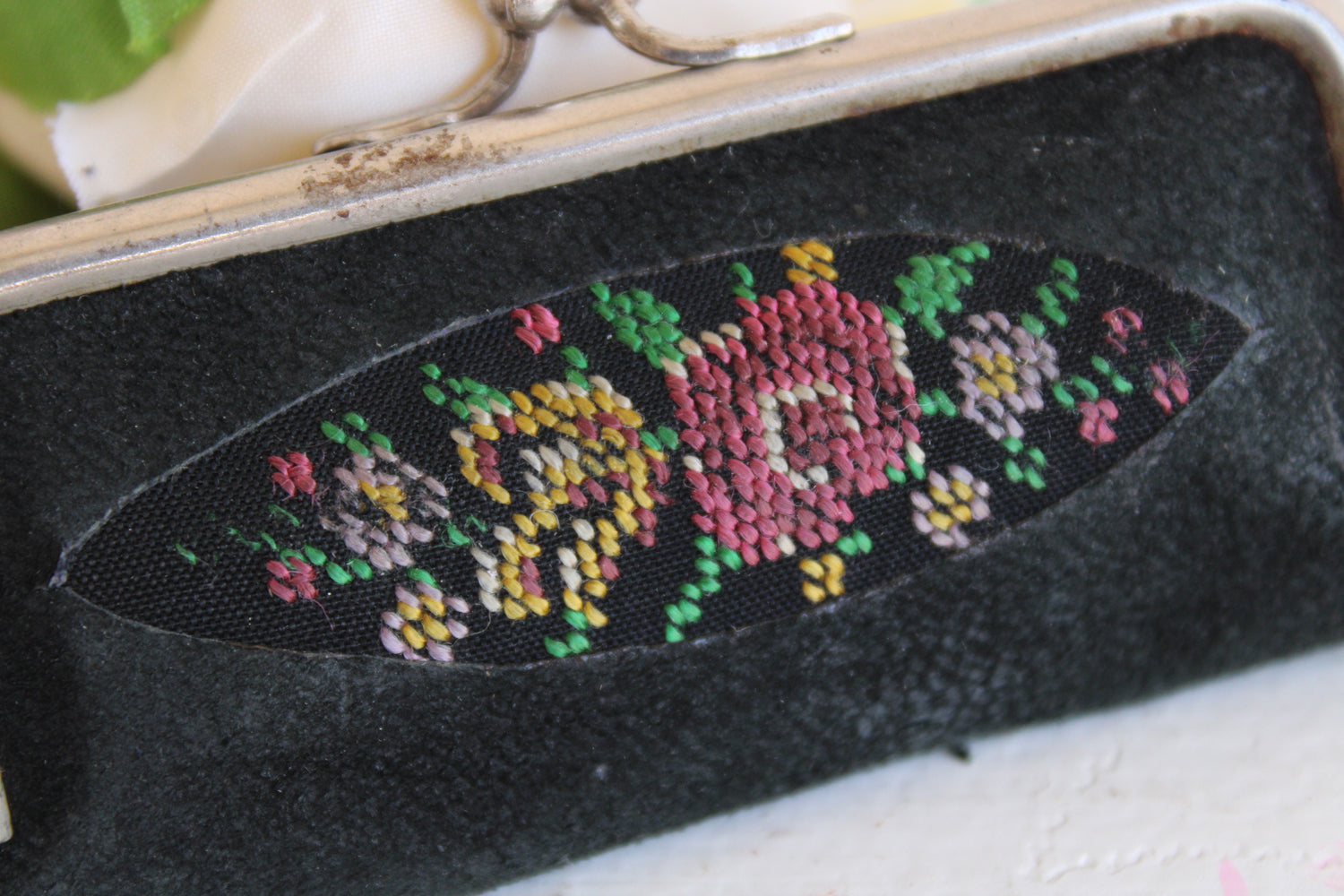 Darling vintage travel size manicure set circa the 1940s or 1950s. Black with a needlepoint pattern of flowers in mauve, lavender, and green and gold and white on the front. The back is plain black. It has a silver tone clasp. Inside is lined in buff felt or maybe suede. There are five various tools, including scissors, file and more. Stamped inside but I cannot for the life of me make any of it out. I am sure at least some of it says something about being made in Germany. And the scissors are stamped Germany.