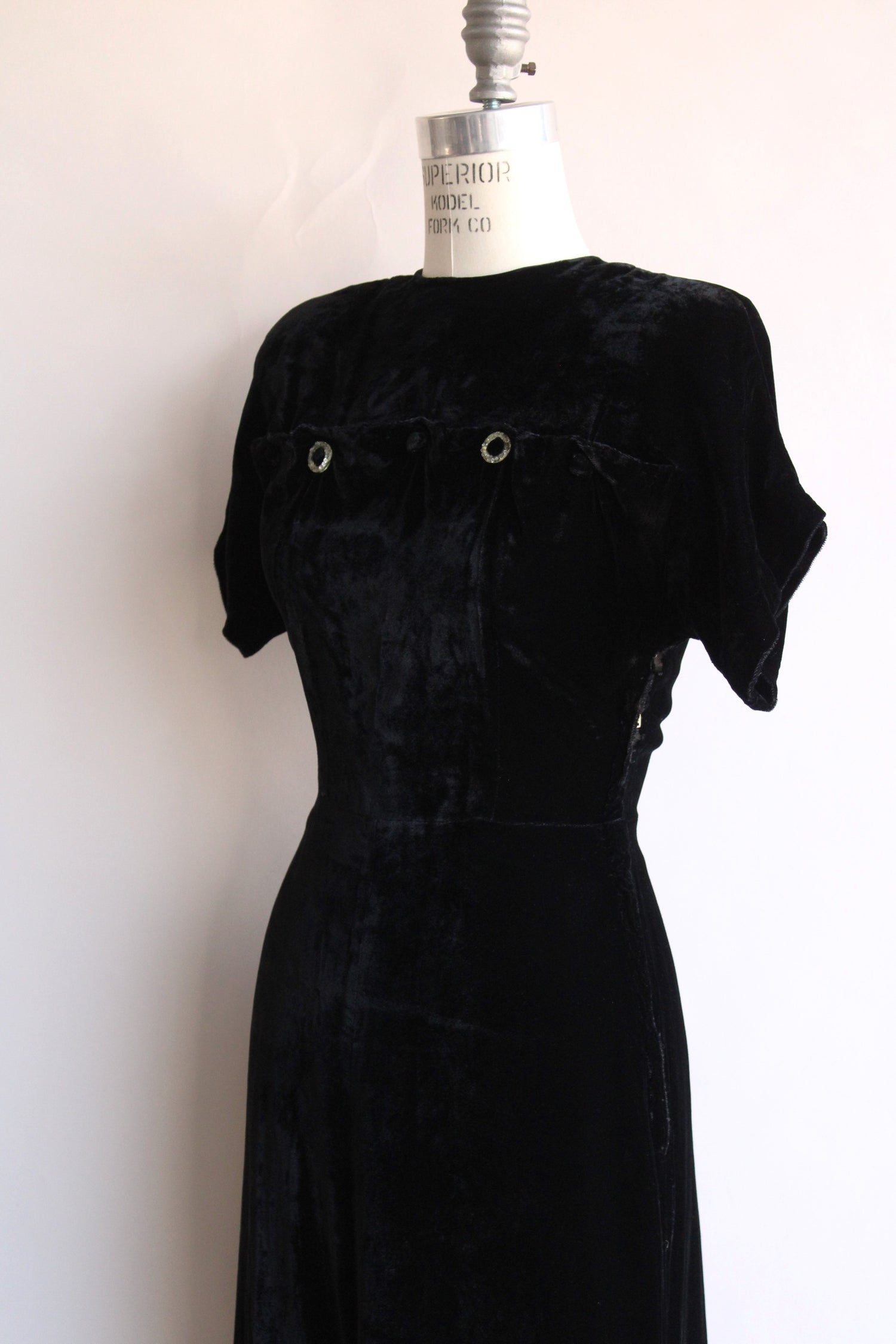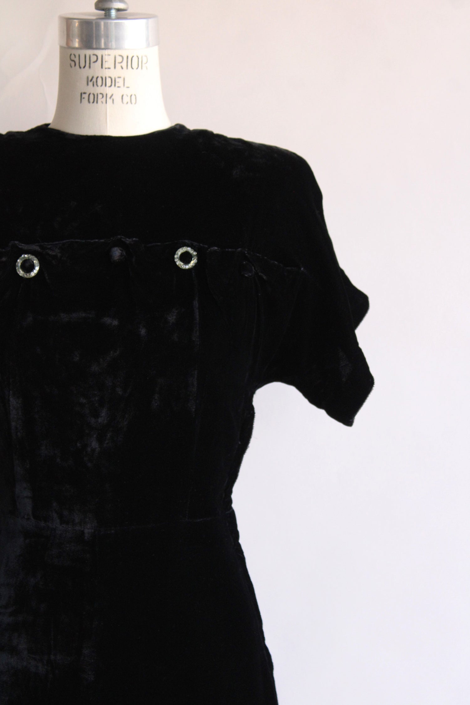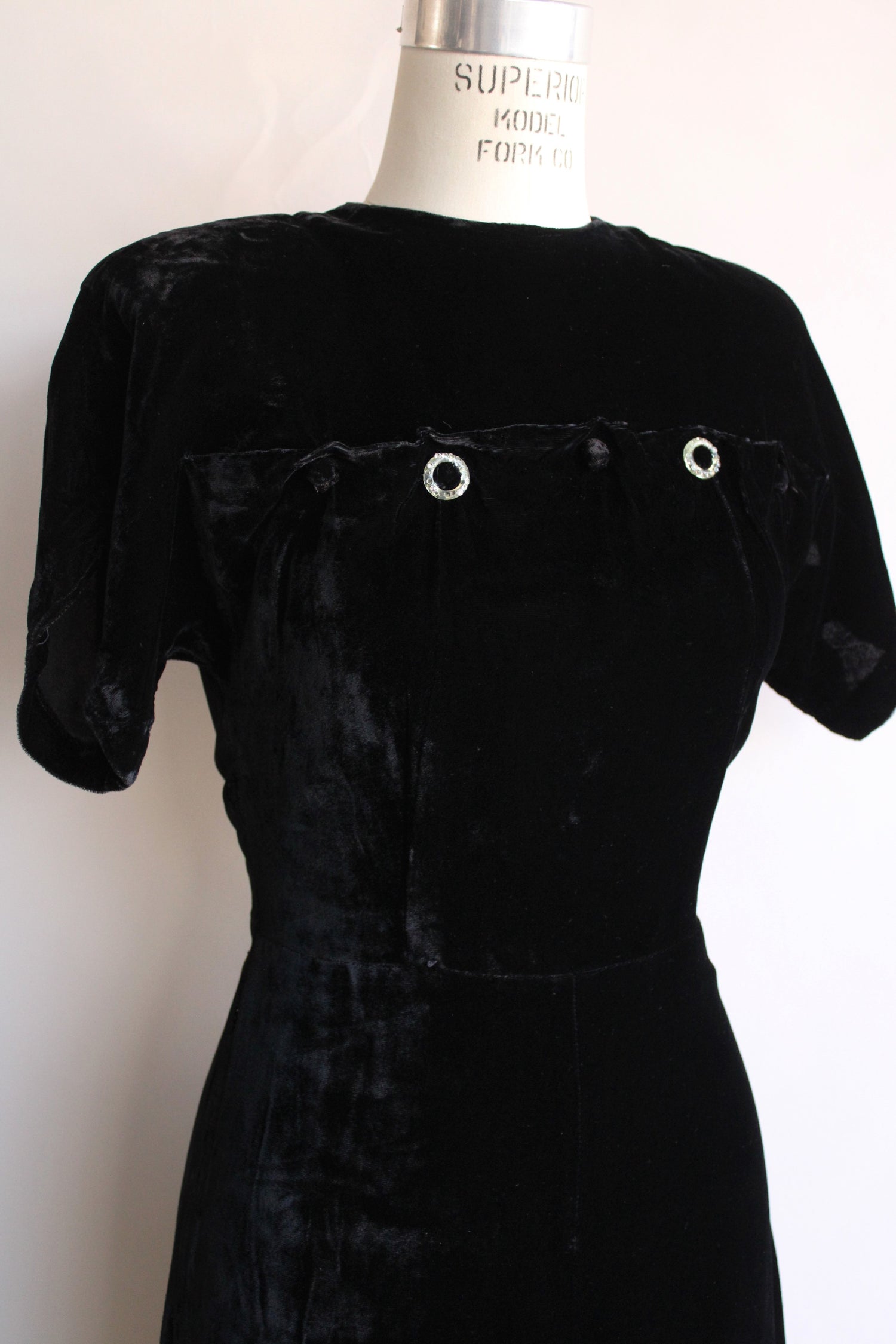 Vintage 1940s Black Velvet Dress with Rhinestone Details