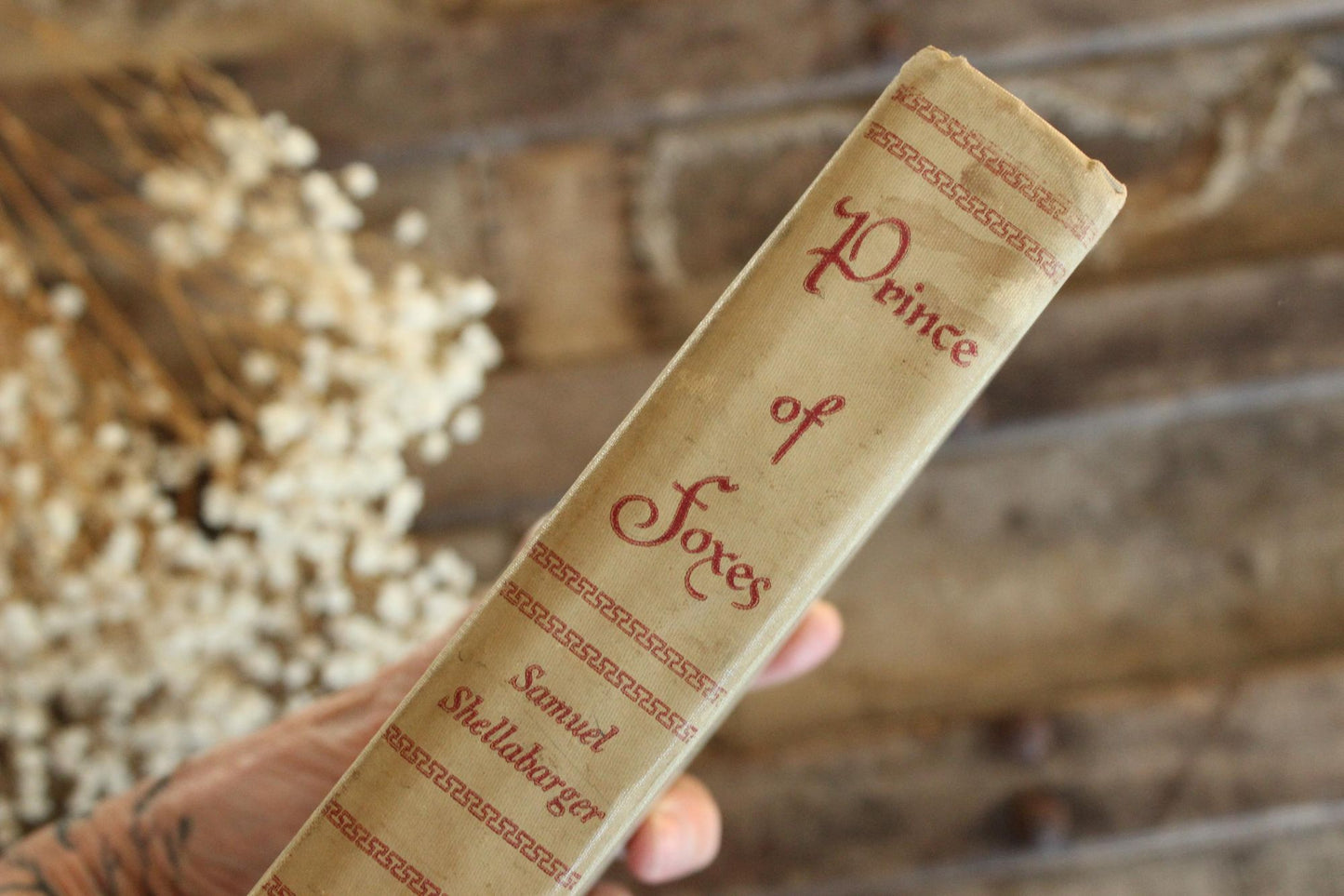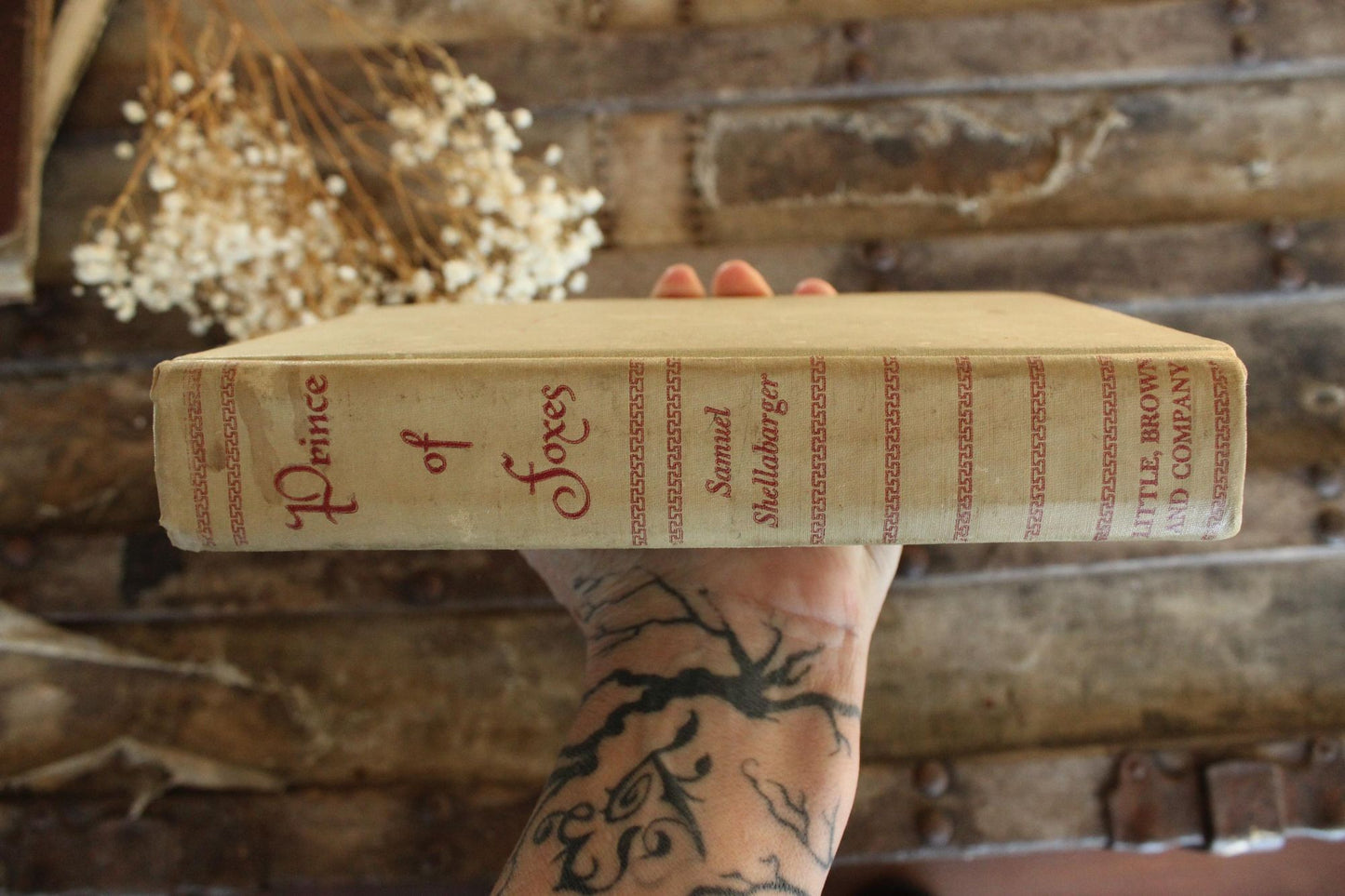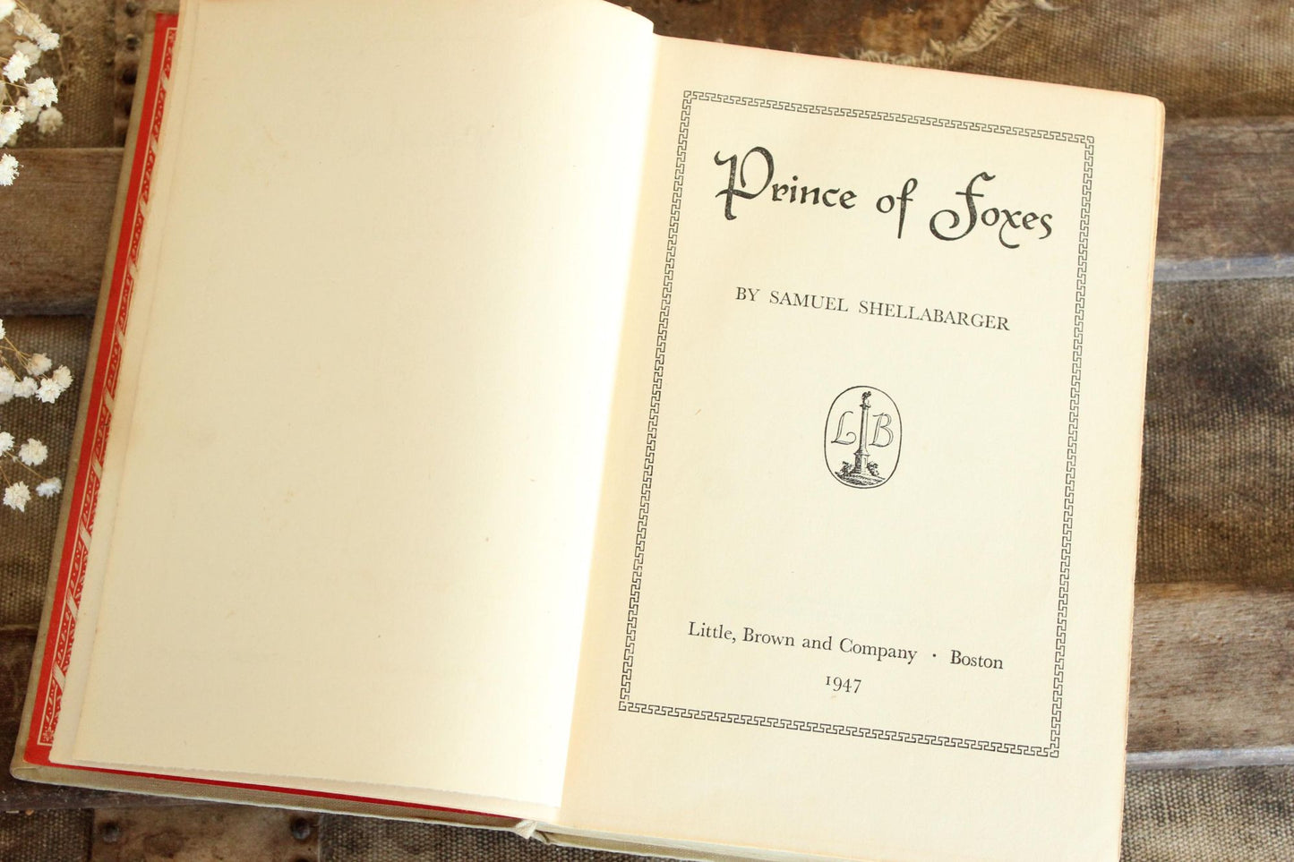 Beautiful vintage book, "Prince of Foxes", by Samuel Shellabarger, published in 1947 by Little Brown and Company. Beige gray cloth bound with red lettering on the spine. Red map on endpapers. Measures about 8" by 5.5". 433 pages. Suspected first edition.