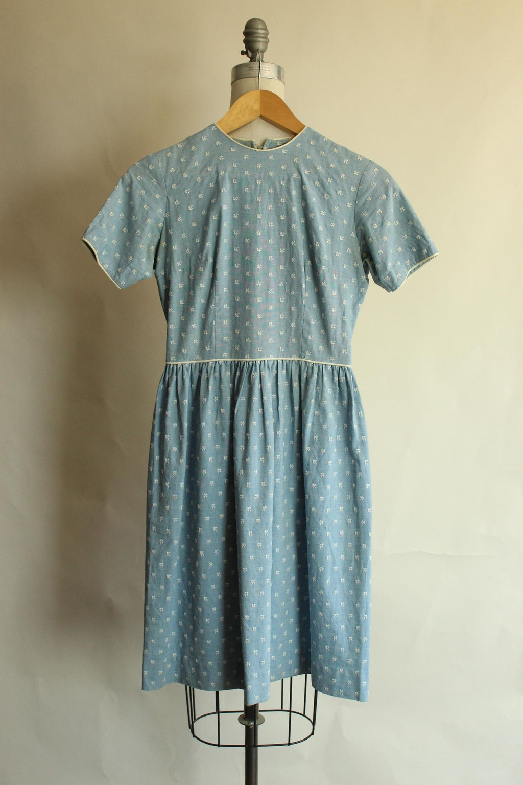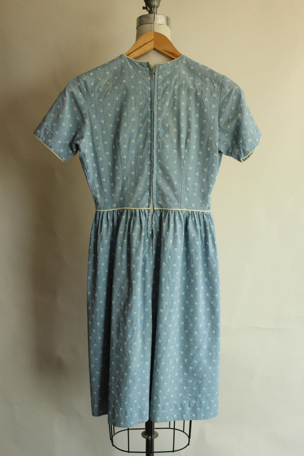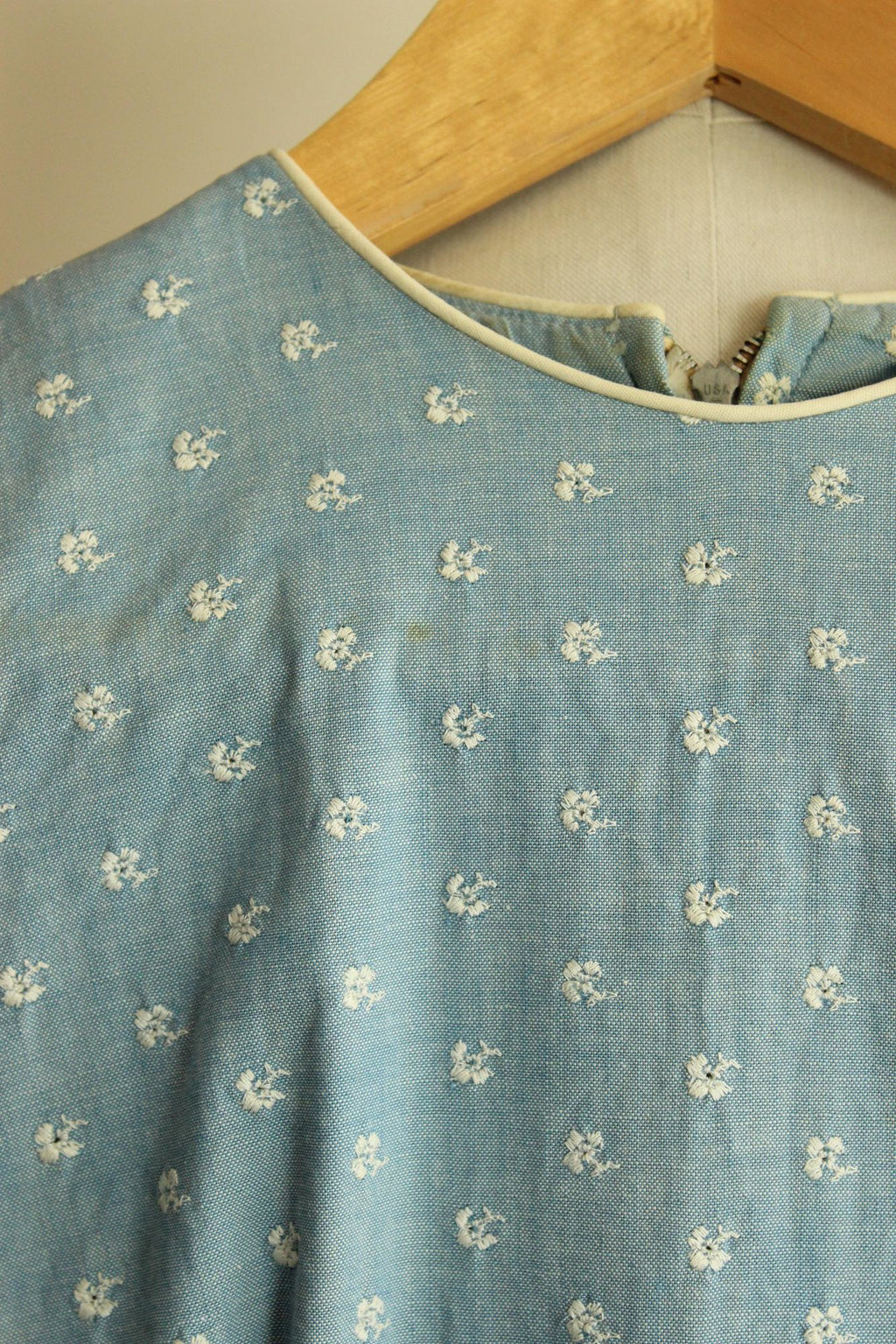 Vintage 1950s 1960s Chambray Blue Dress with Embroidered White Flowers