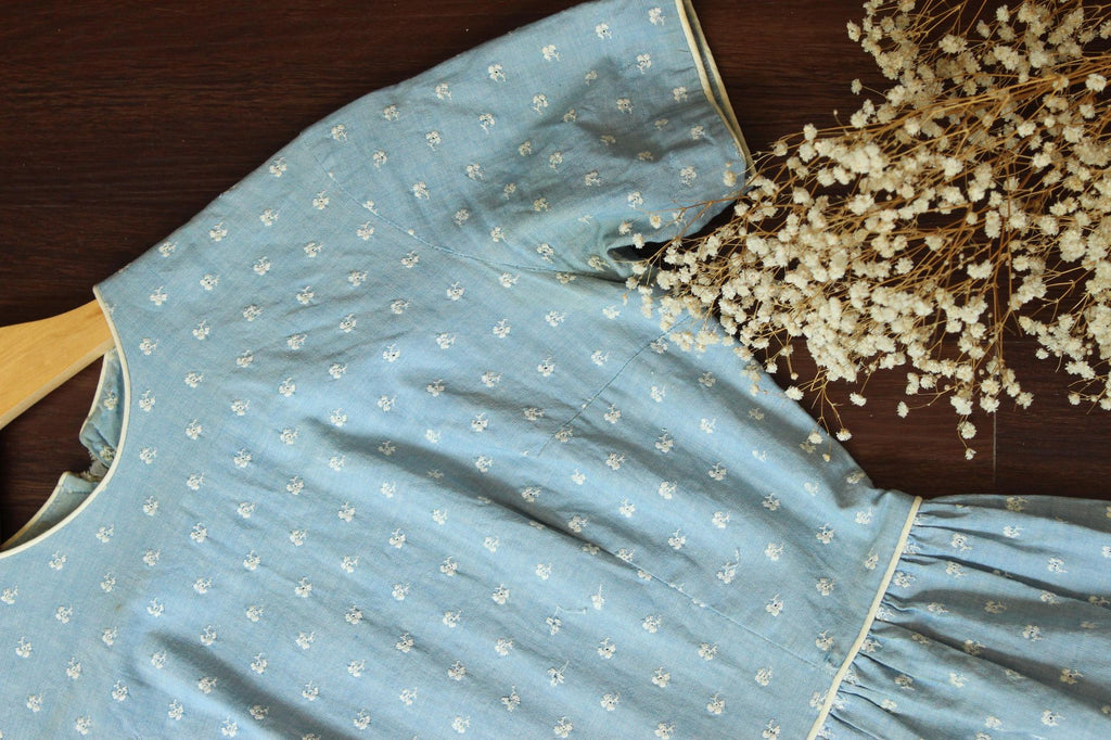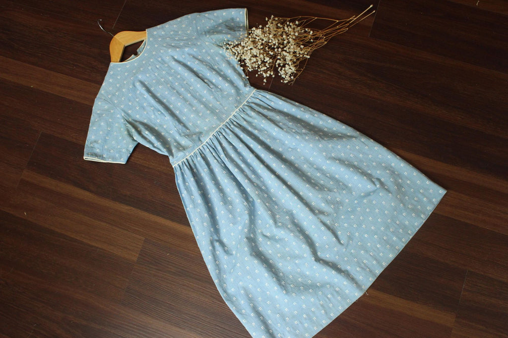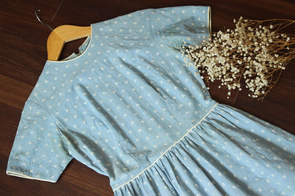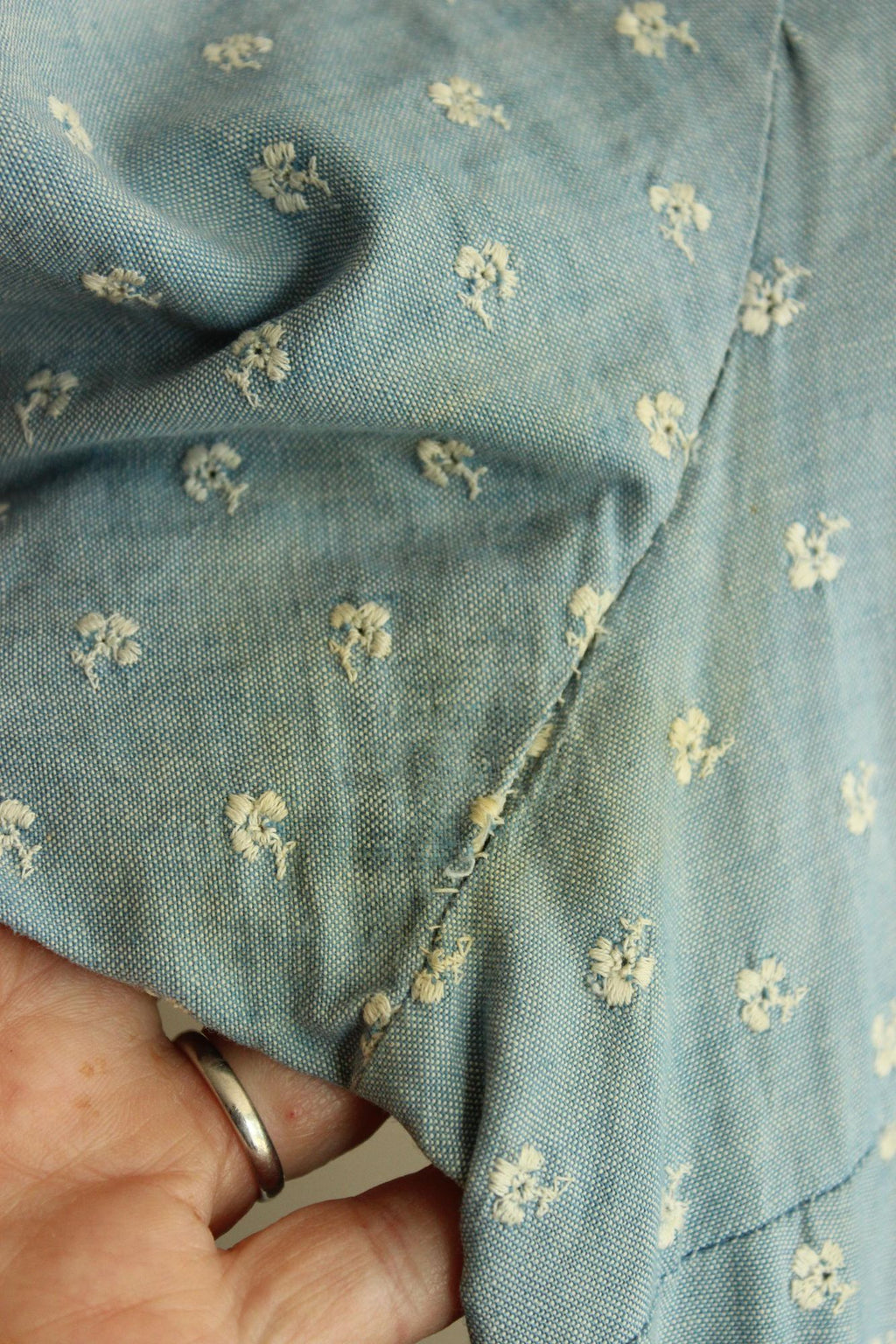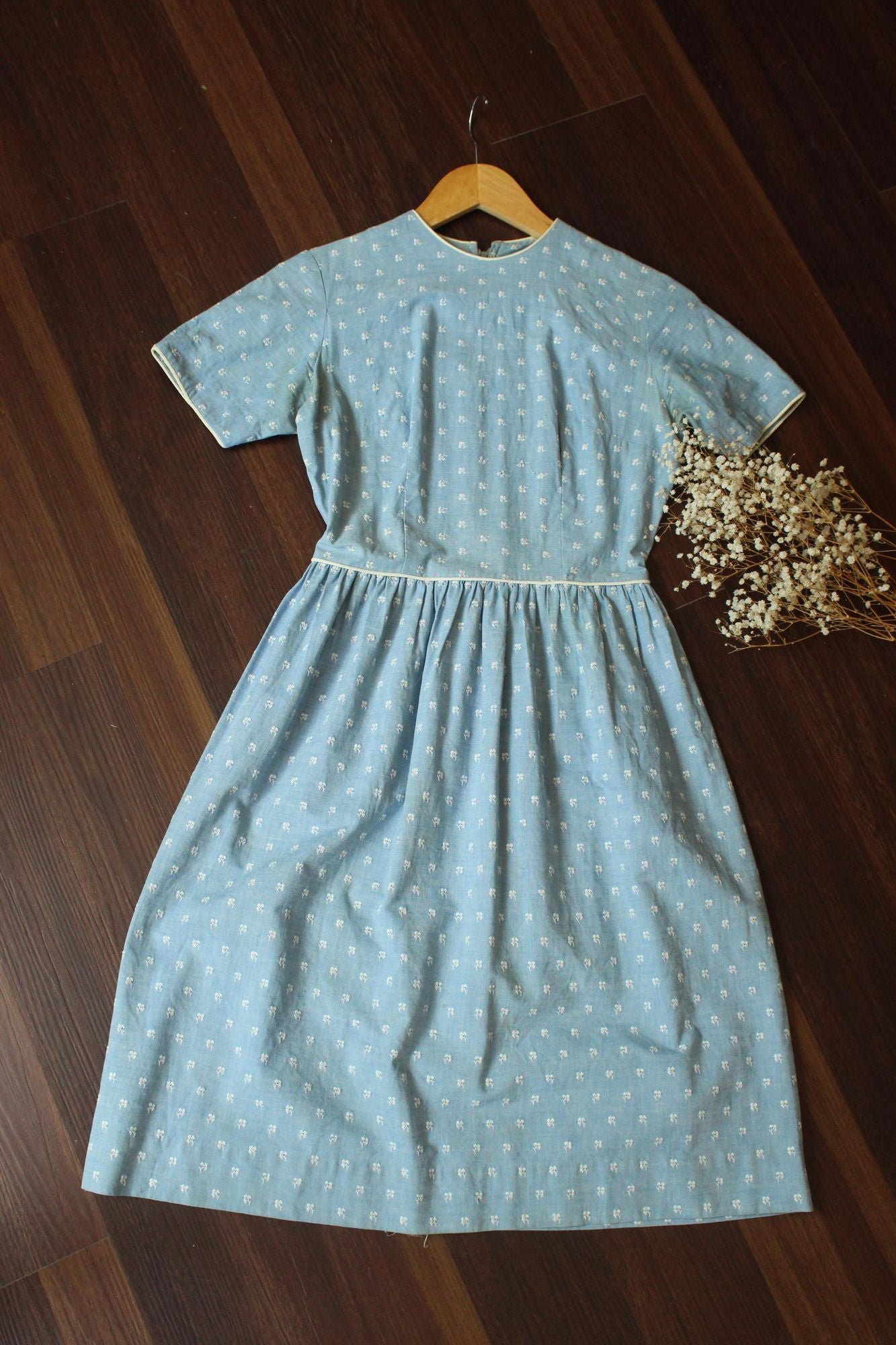 Vintage 1950s 1960s Chambray Blue Dress with Embroidered White Flowers