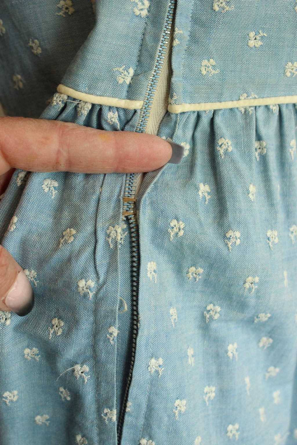 Darling vintage dress from the 1950s, possibly 1960s in a pretty chambray blue cotton embroidered with tiny white flowers. Metal zipper down the back. Such a sweet dress. Originally for a teen or preteen but would work for a petite adult as well. Label reads: Junior Petities by Carol Rodger.