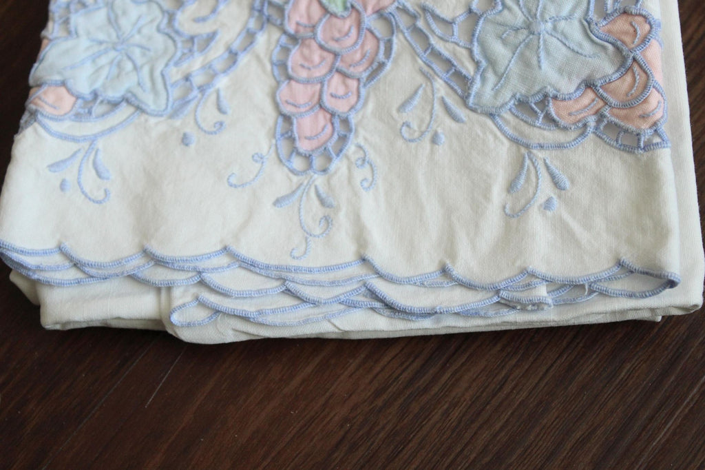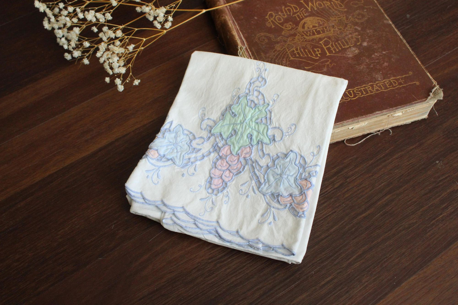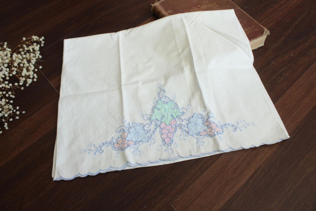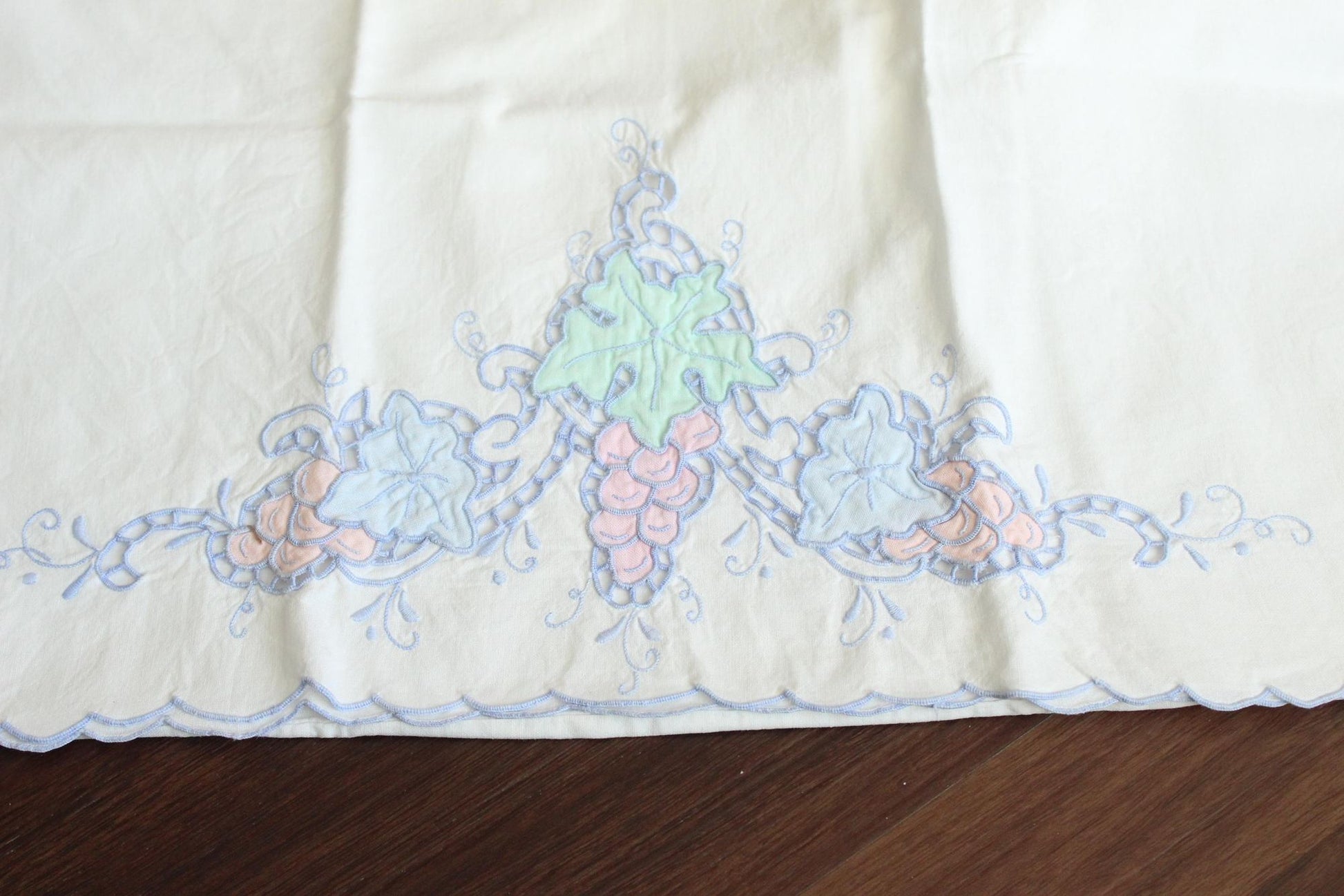Charming vintage pillowcase circa the 1950s. Features pretty appliques and embroidery of grapes and leaves in pink, blue and green. Has scalloped edges on the open end. Queen size, it measures approx. 20" x 32" long.