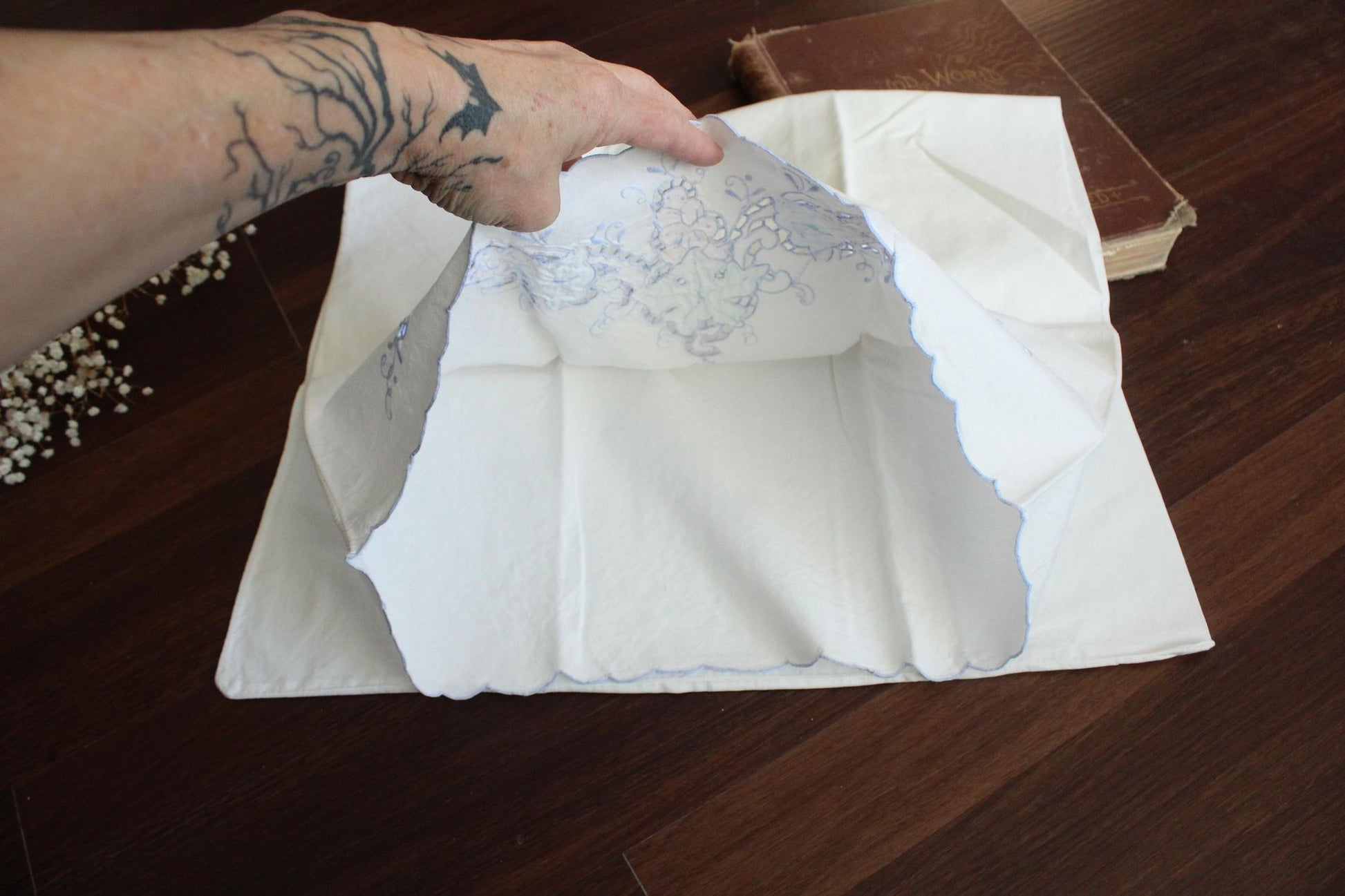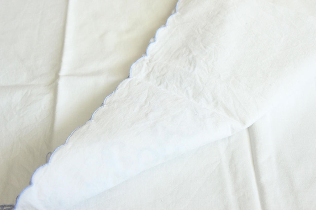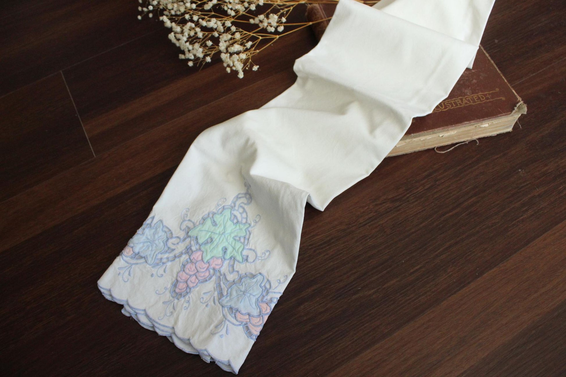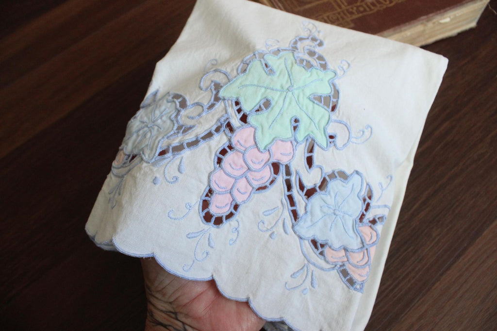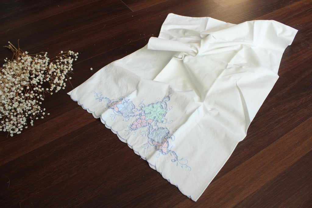 Charming vintage pillowcase circa the 1950s. Features pretty appliques and embroidery of grapes and leaves in pink, blue and green. Has scalloped edges on the open end. Queen size, it measures approx. 20" x 32" long.