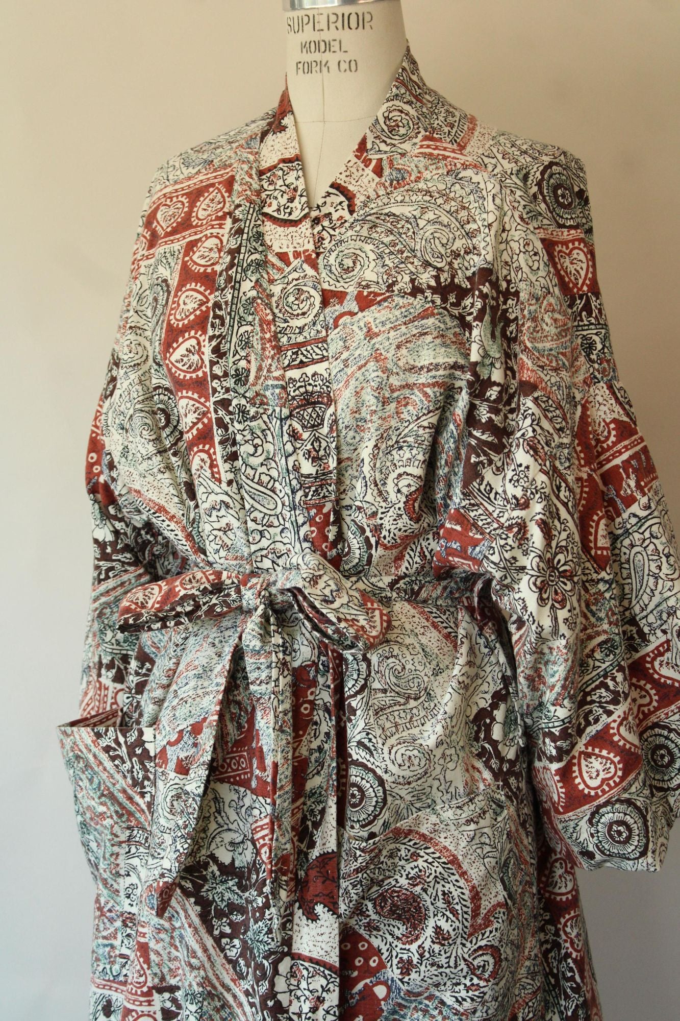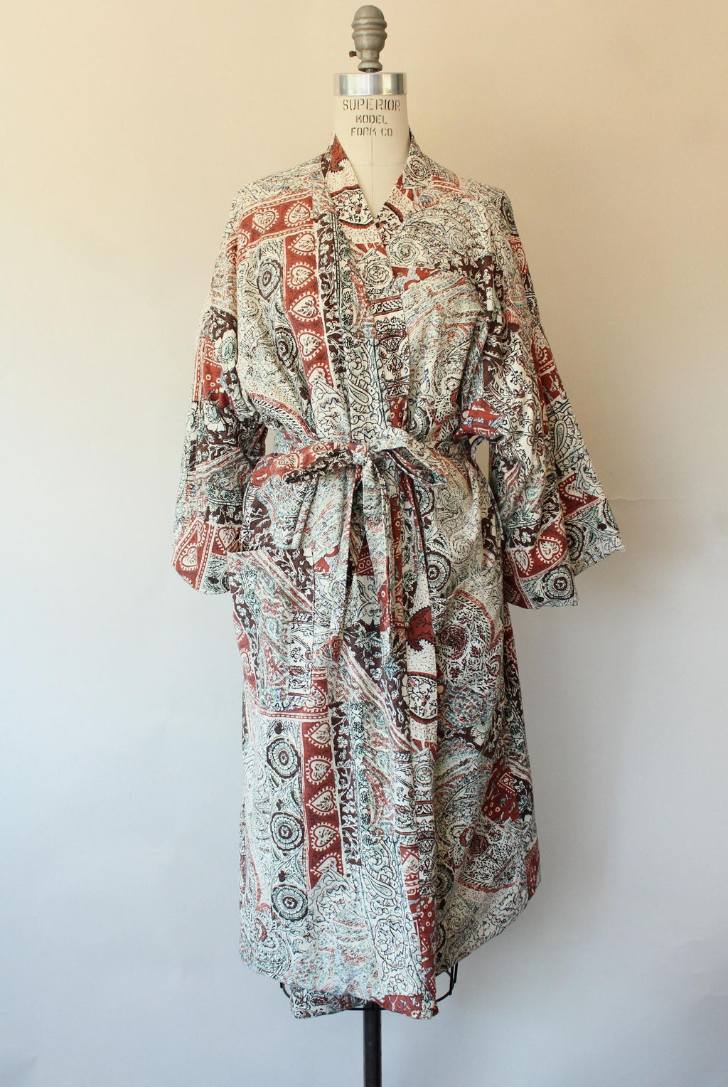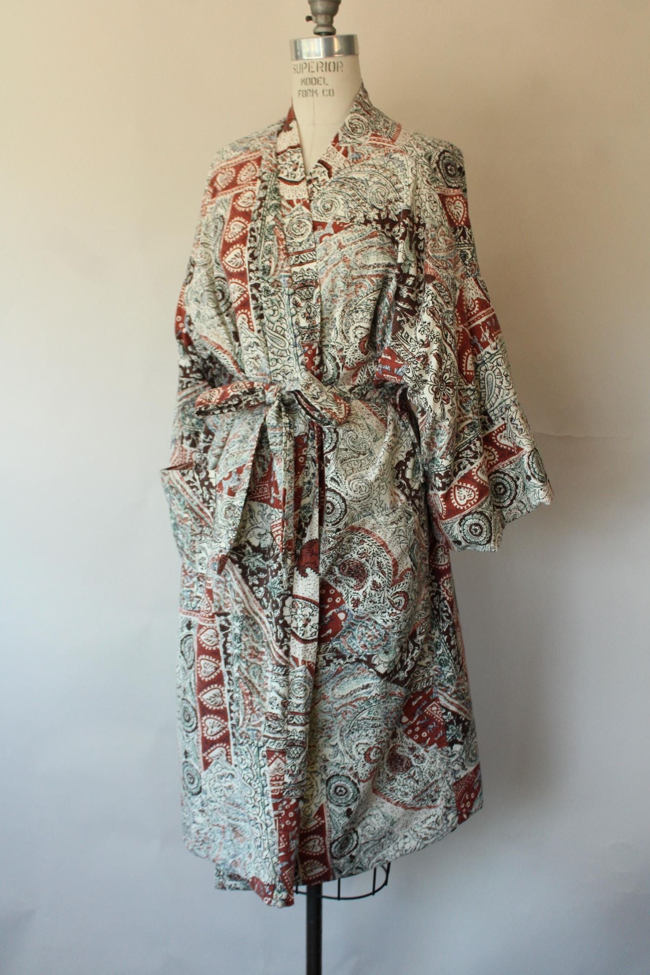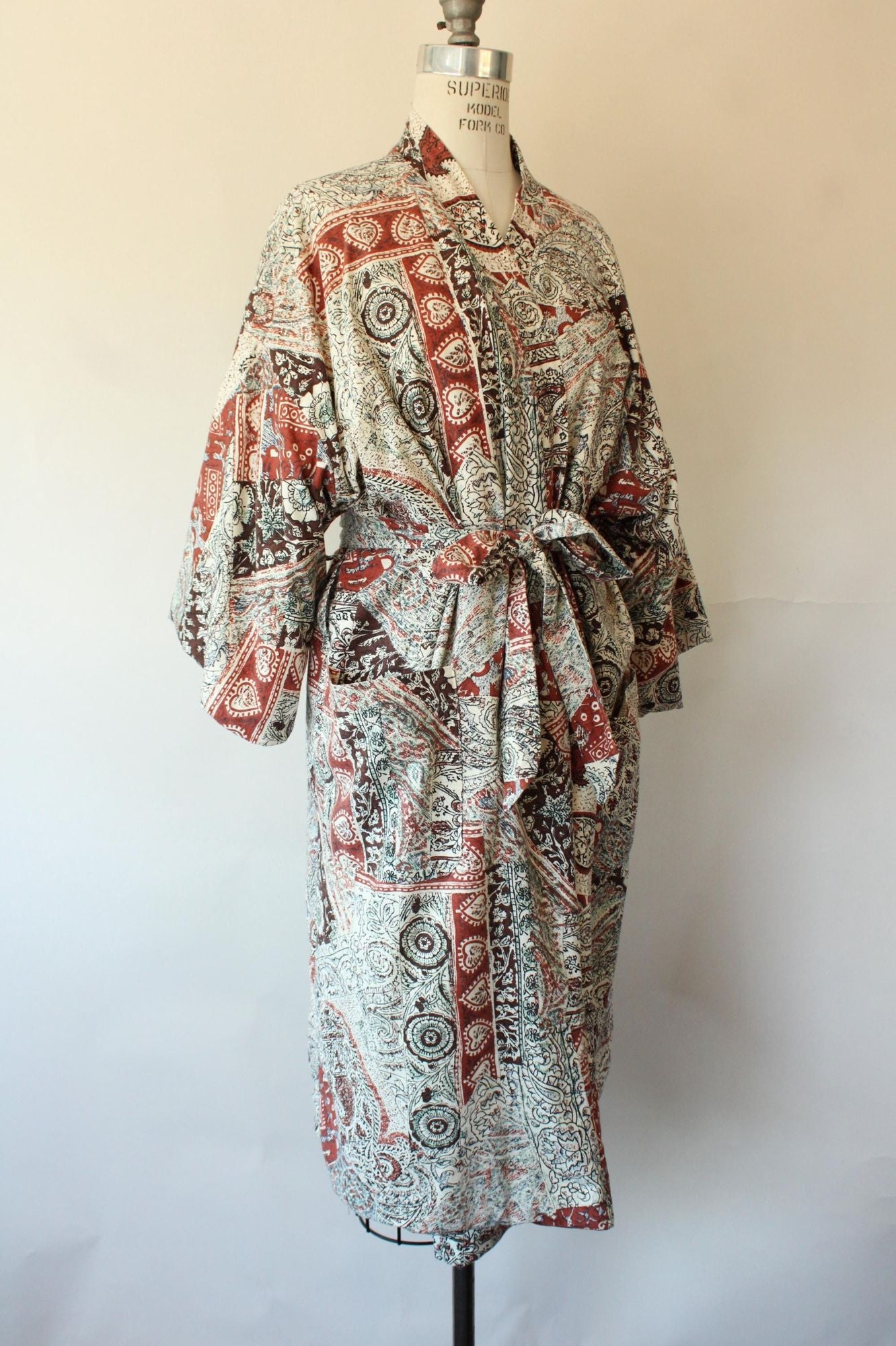 Wonderful vintage terrycloth robe from about the 1960s or 1970s in a kimono style. Has two oversize pockets and a tie that can go at either of two height loops, is lined in yellow terrycloth and is a fun ethnic print of brown and black on off white. Label Reads: Roytex, For Modern Living. Looks and feels like cotton. Was probably a man's originally but really unisex today.