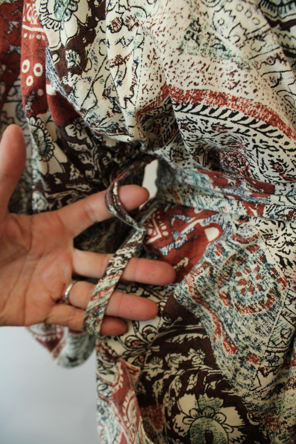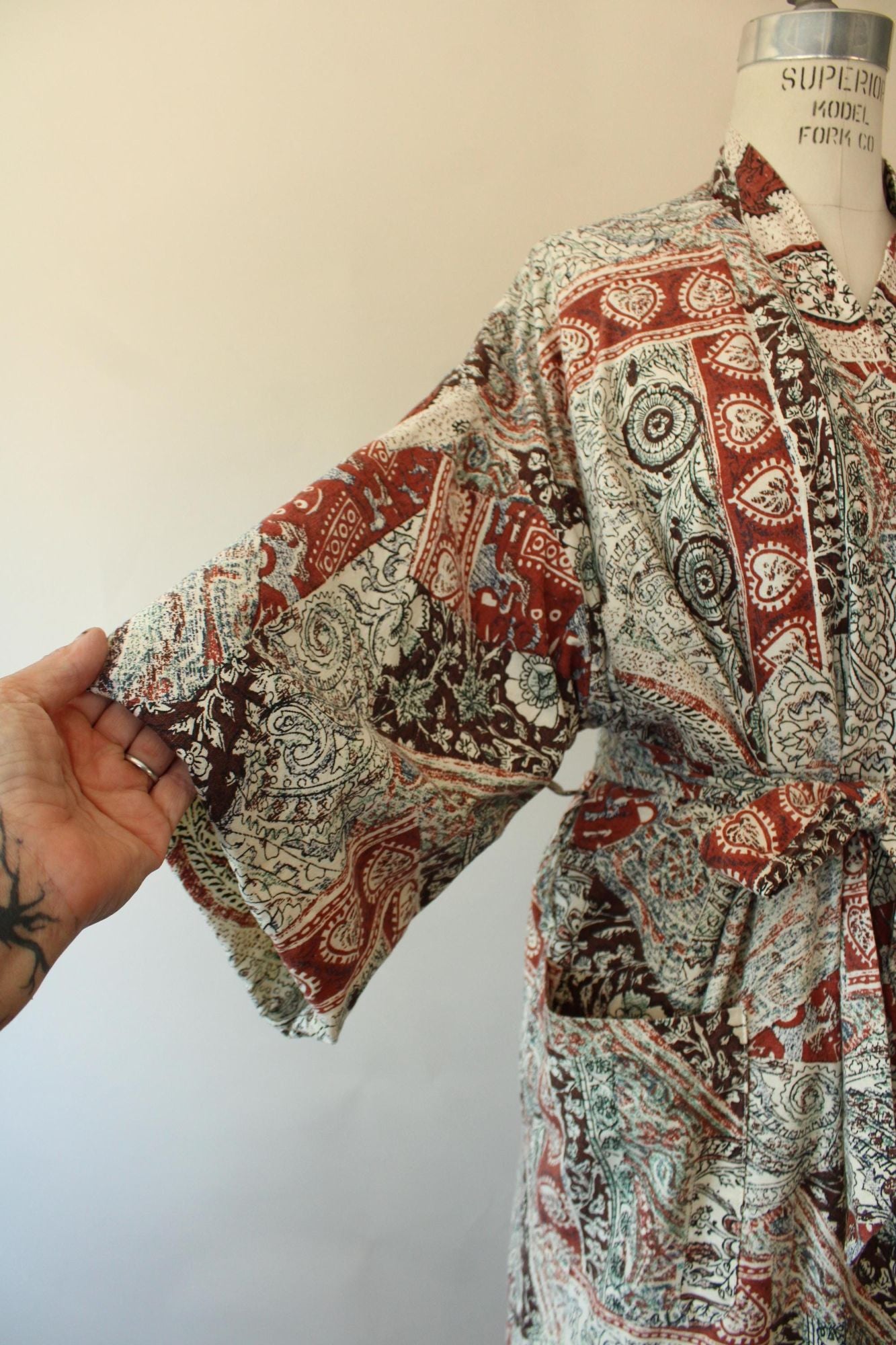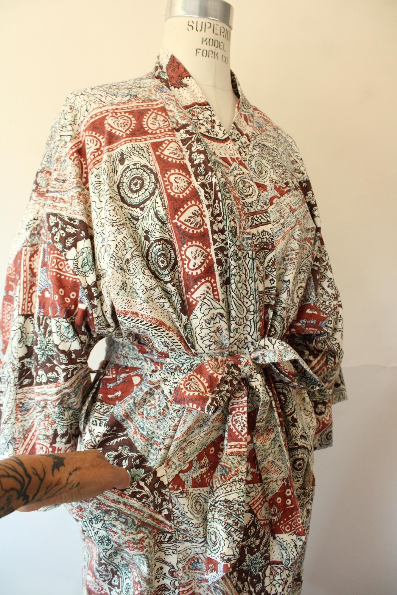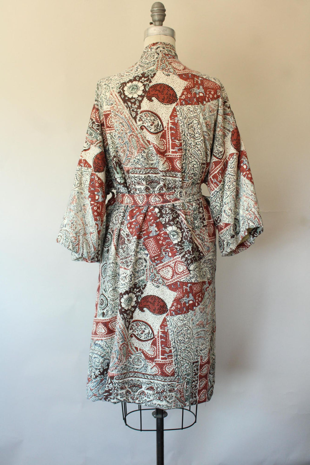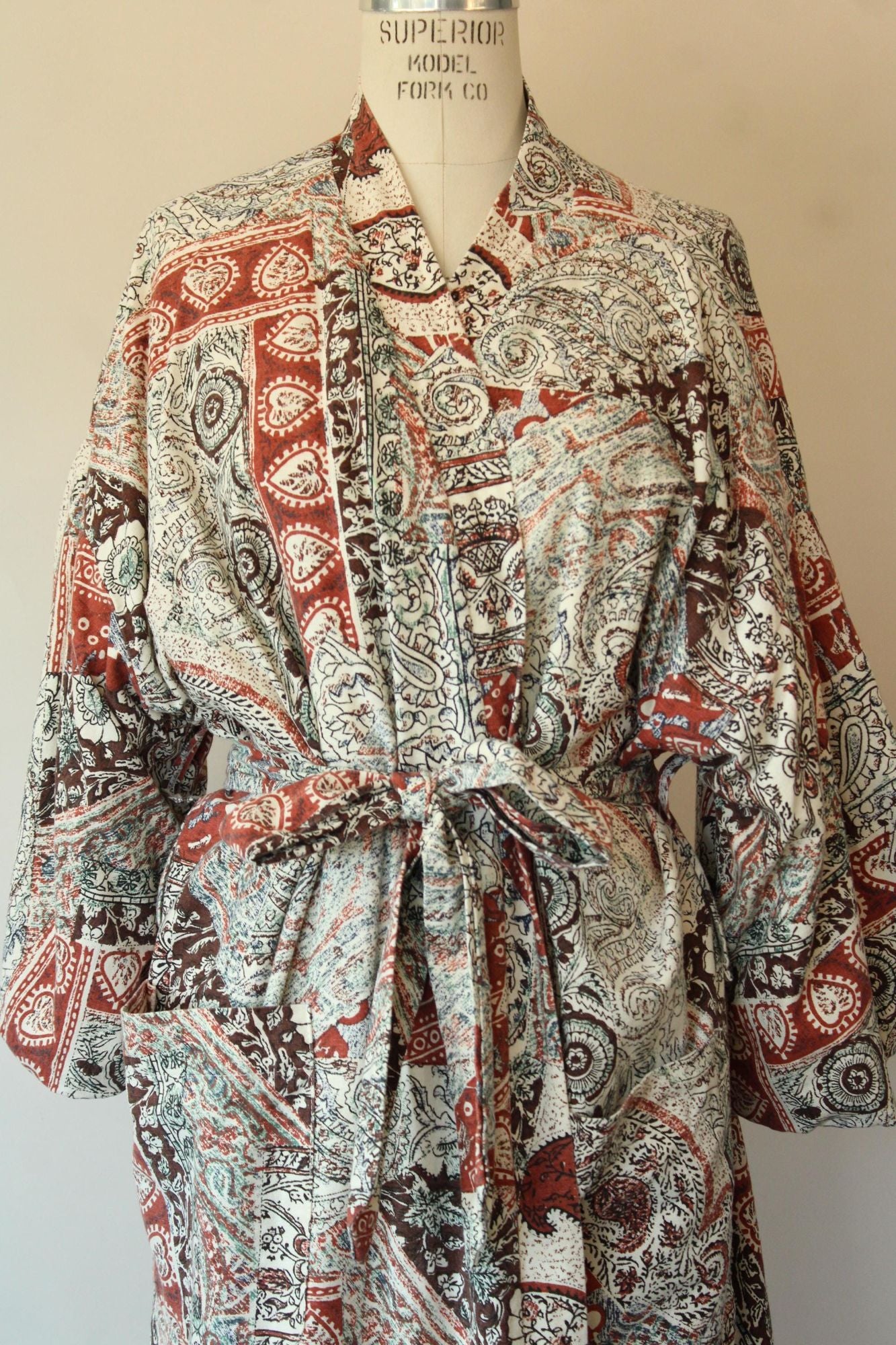 Wonderful vintage terrycloth robe from about the 1960s or 1970s in a kimono style. Has two oversize pockets and a tie that can go at either of two height loops, is lined in yellow terrycloth and is a fun ethnic print of brown and black on off white. Label Reads: Roytex, For Modern Living. Looks and feels like cotton. Was probably a man's originally but really unisex today.