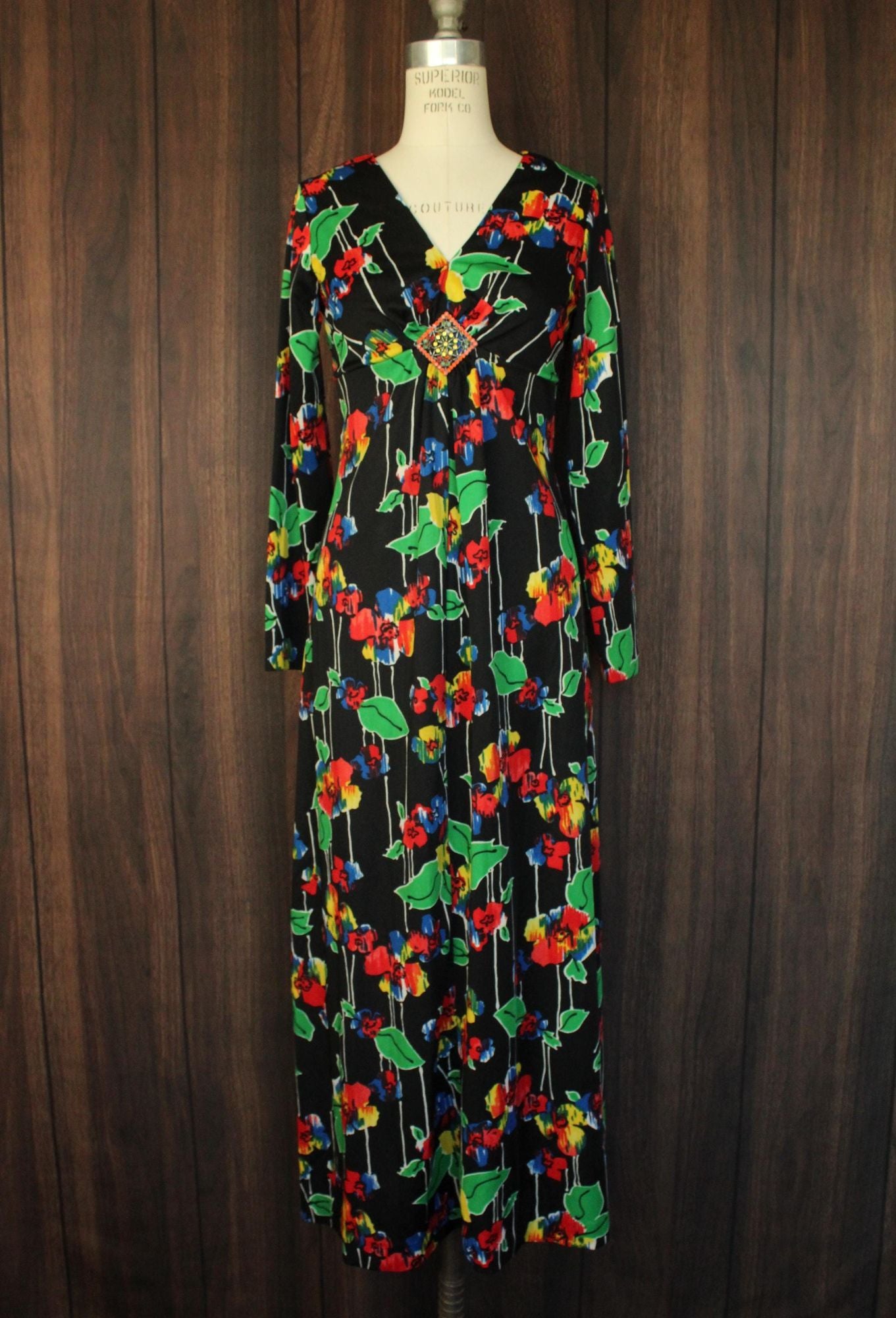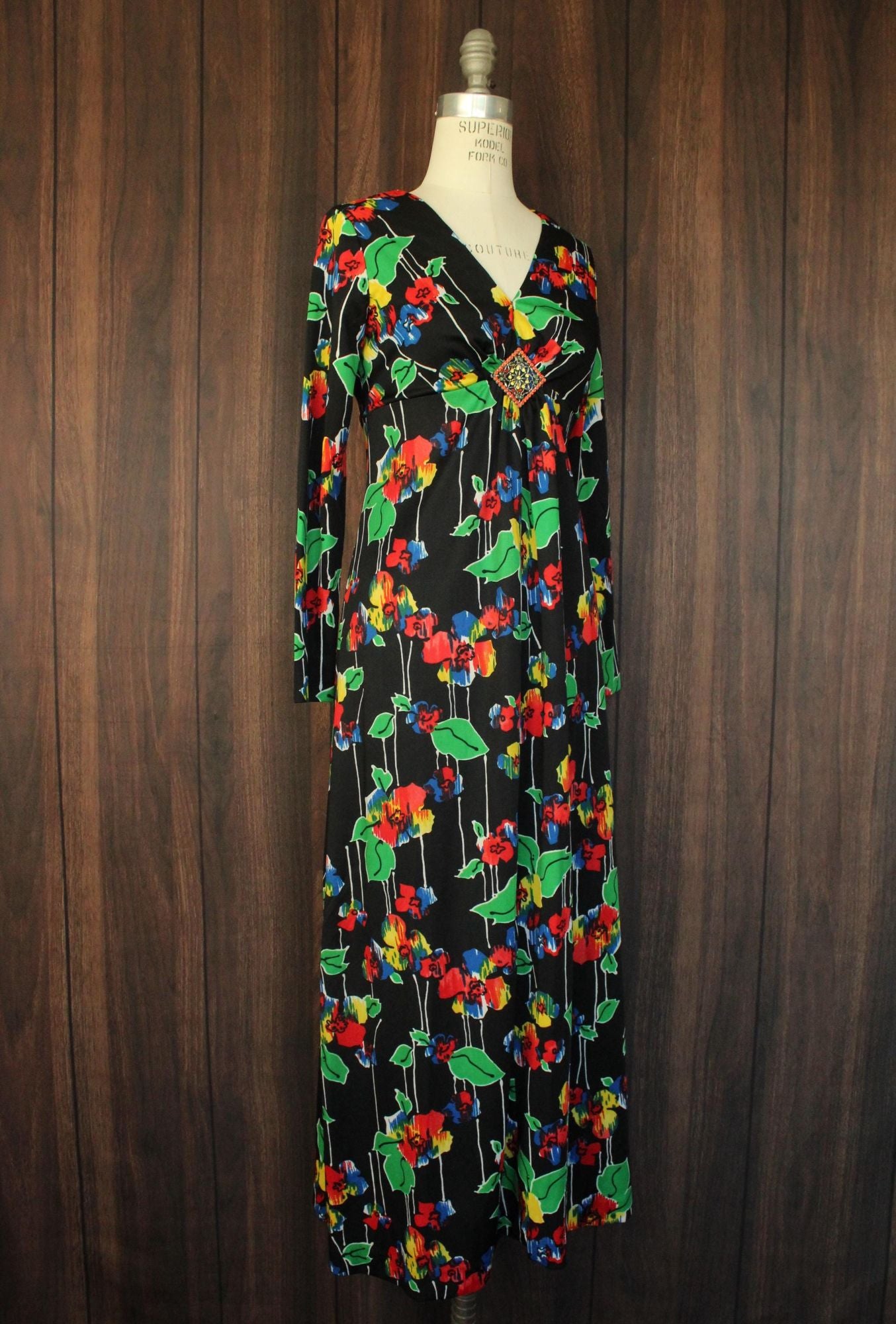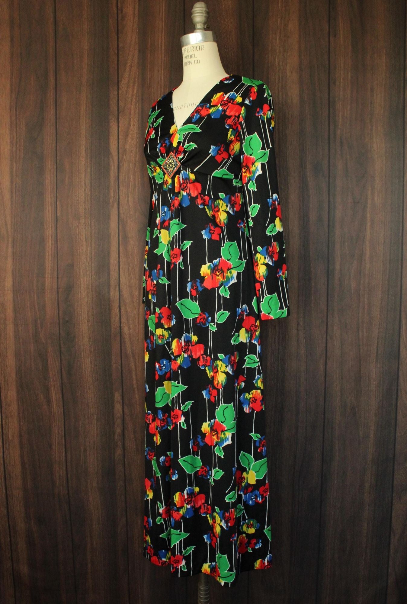 Gorgeous vintage maxi dress from about the 1960s. Beautiful bright color floral print, long sleeves and a striking front of the deep V neck. Looks and feels like poly to me. Zipper down the back. Label reads: none. I'd say this is a medium size but do see measurements below.