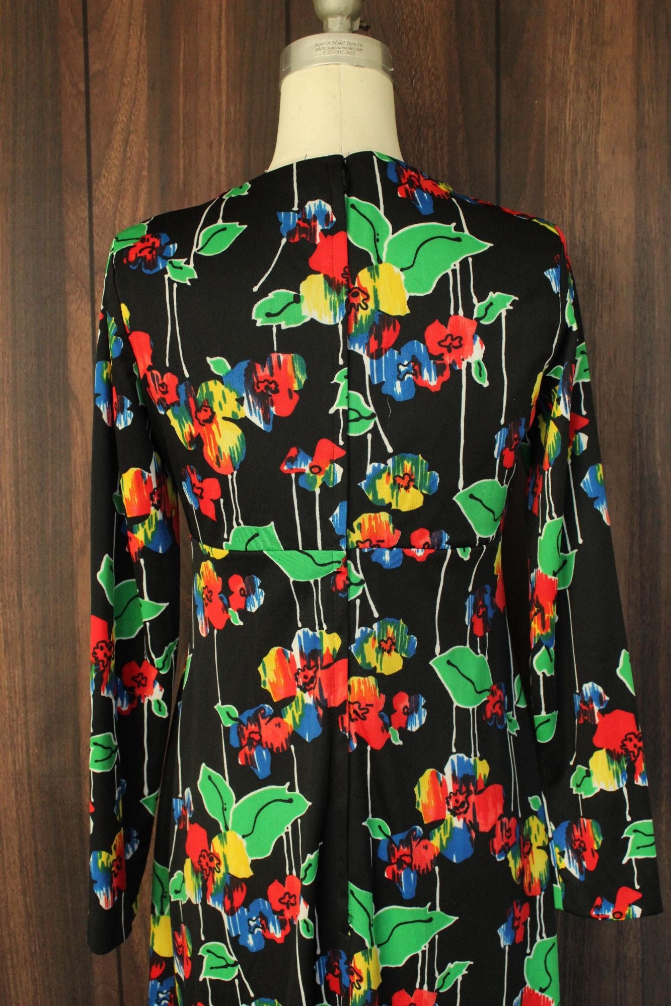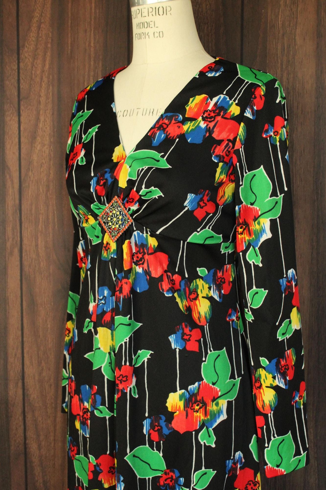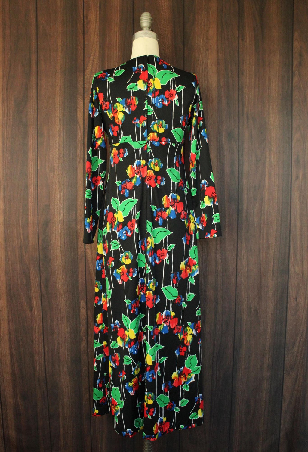 Gorgeous vintage maxi dress from about the 1960s. Beautiful bright color floral print, long sleeves and a striking front of the deep V neck. Looks and feels like poly to me. Zipper down the back. Label reads: none. I'd say this is a medium size but do see measurements below.