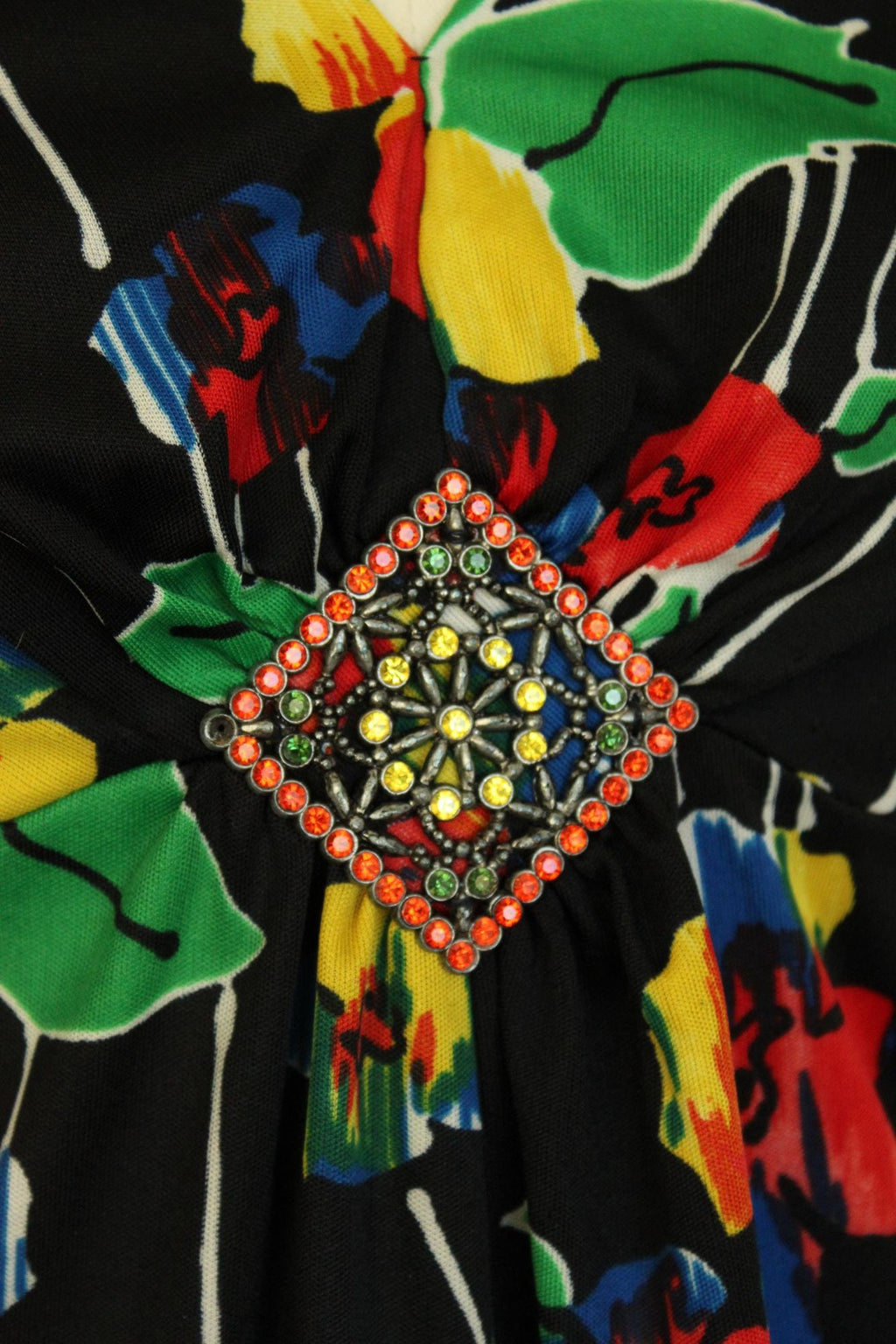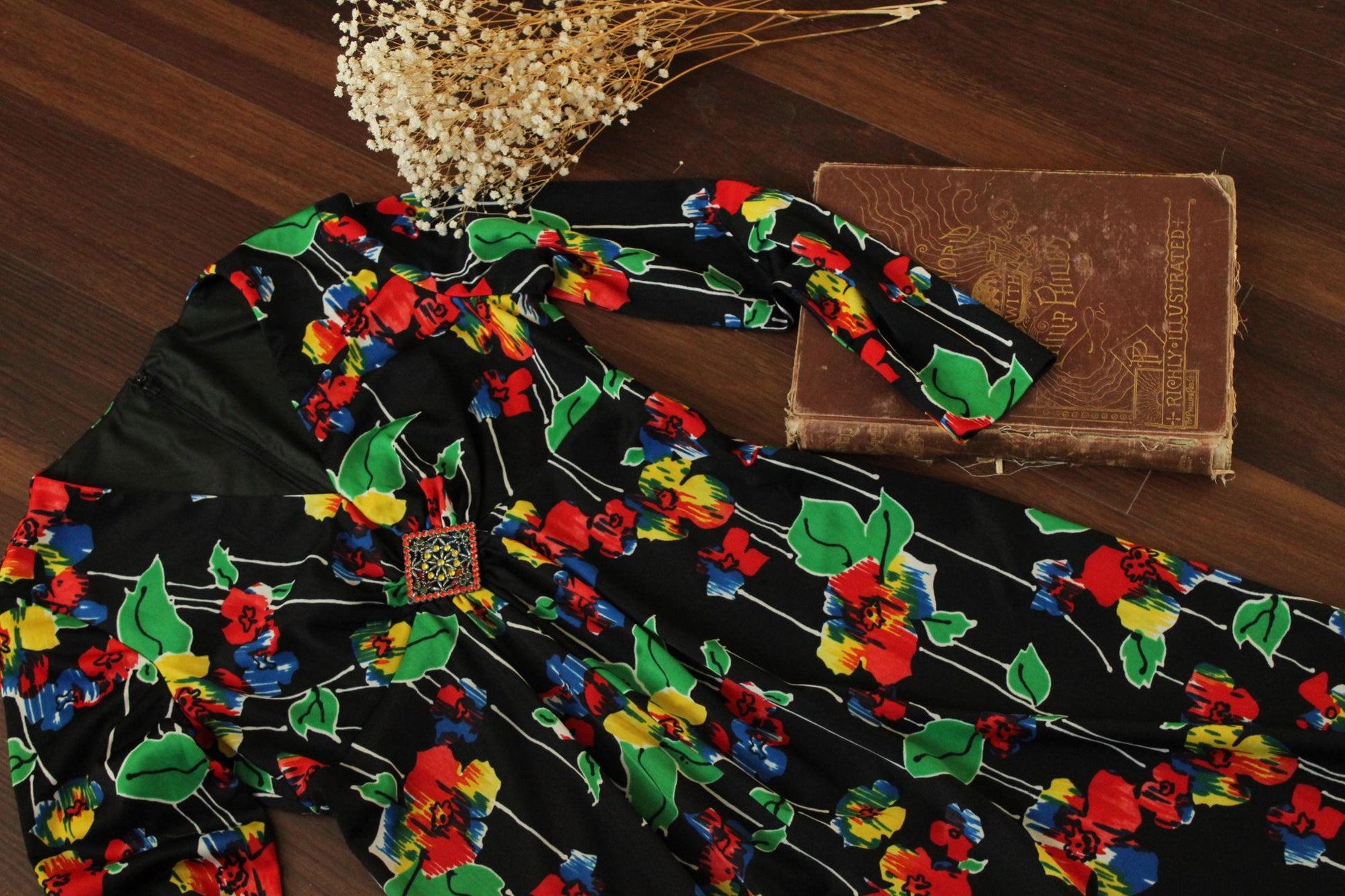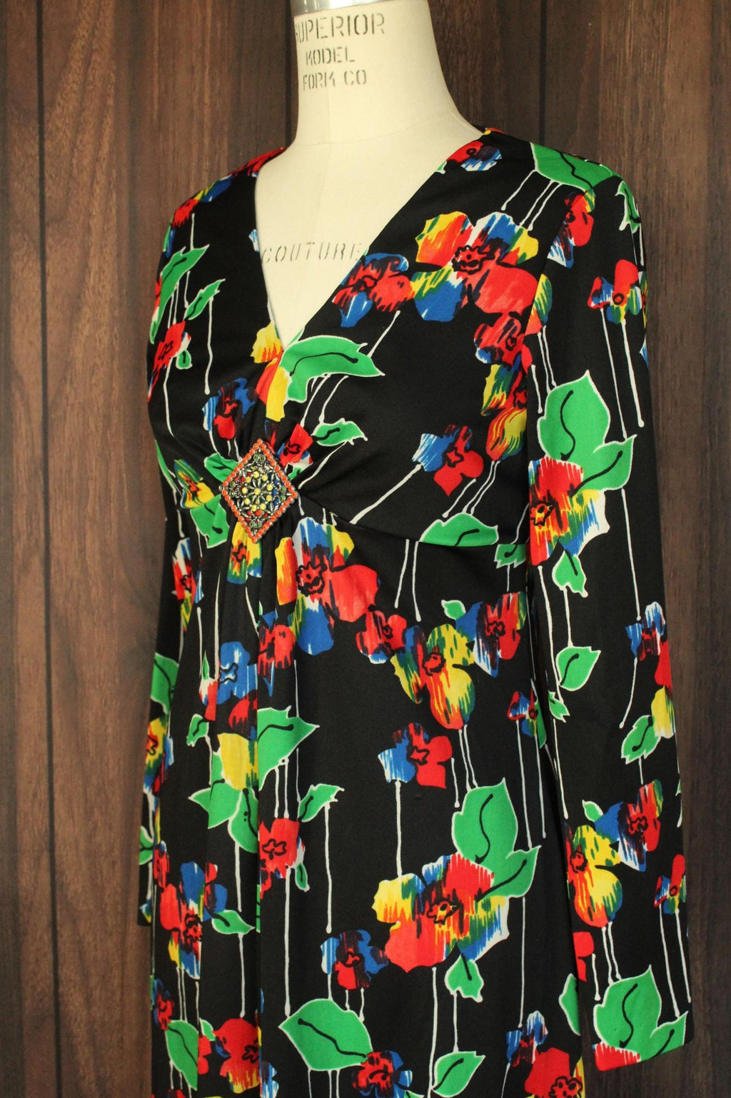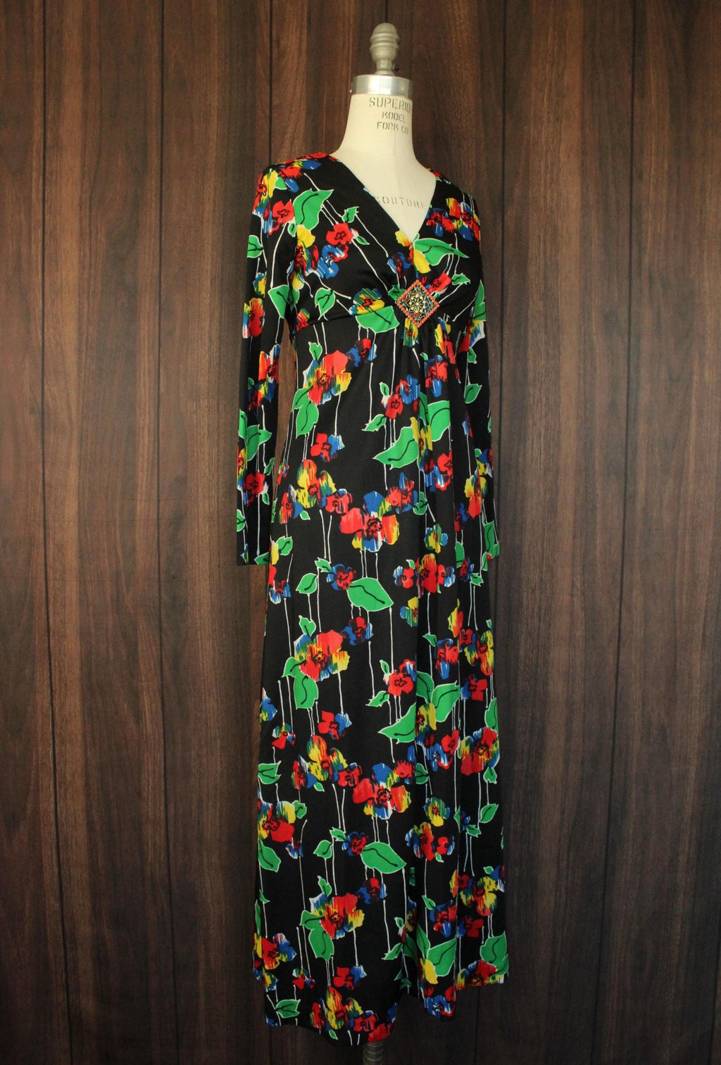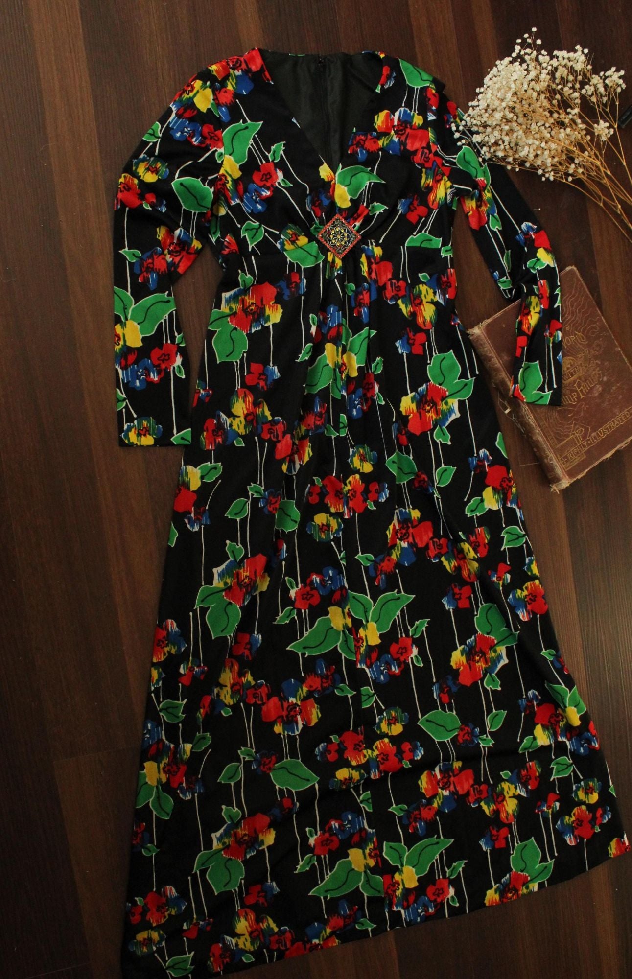 Vintage 1960s Black Floral Print with Brooch Maxidress