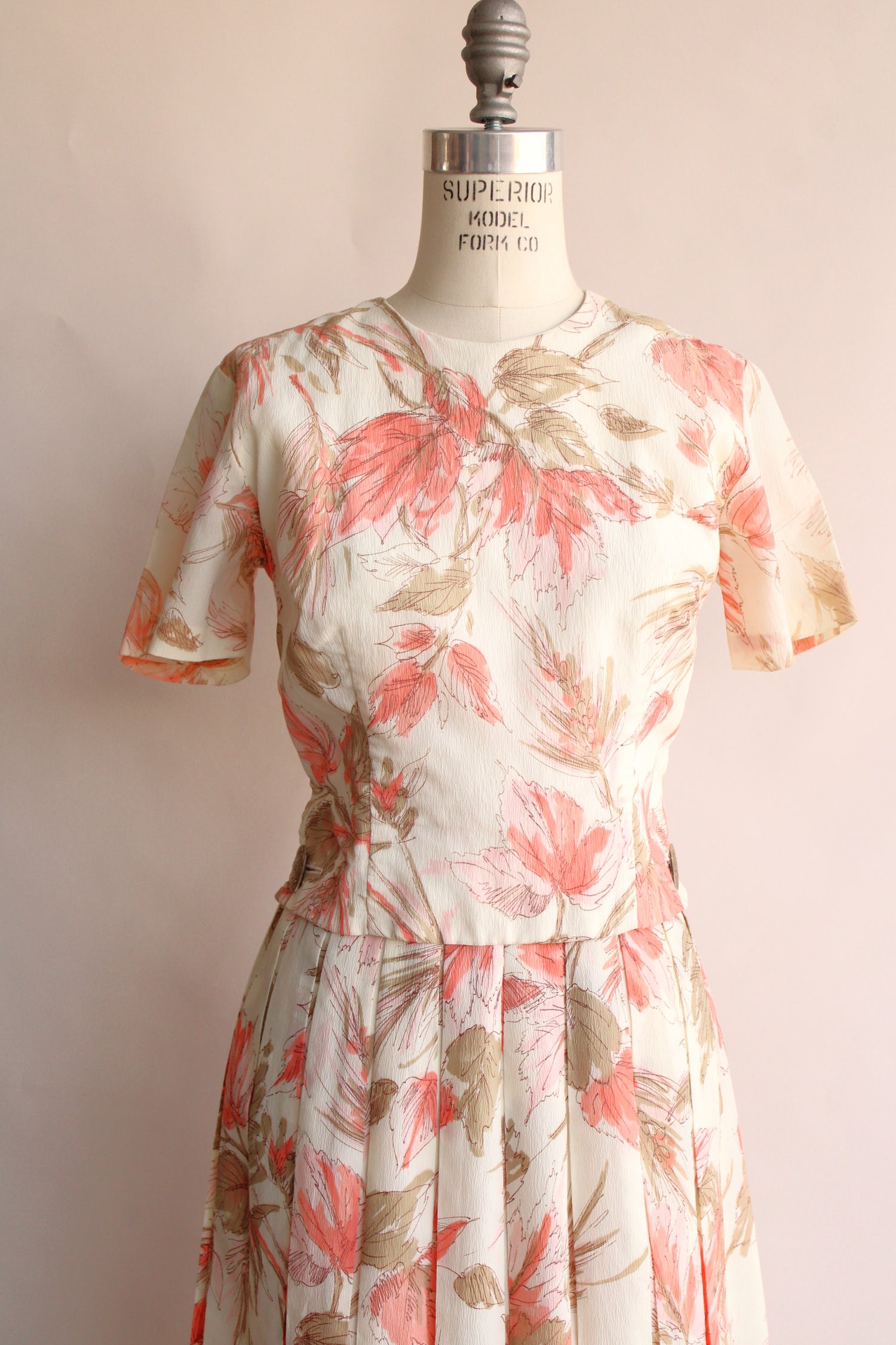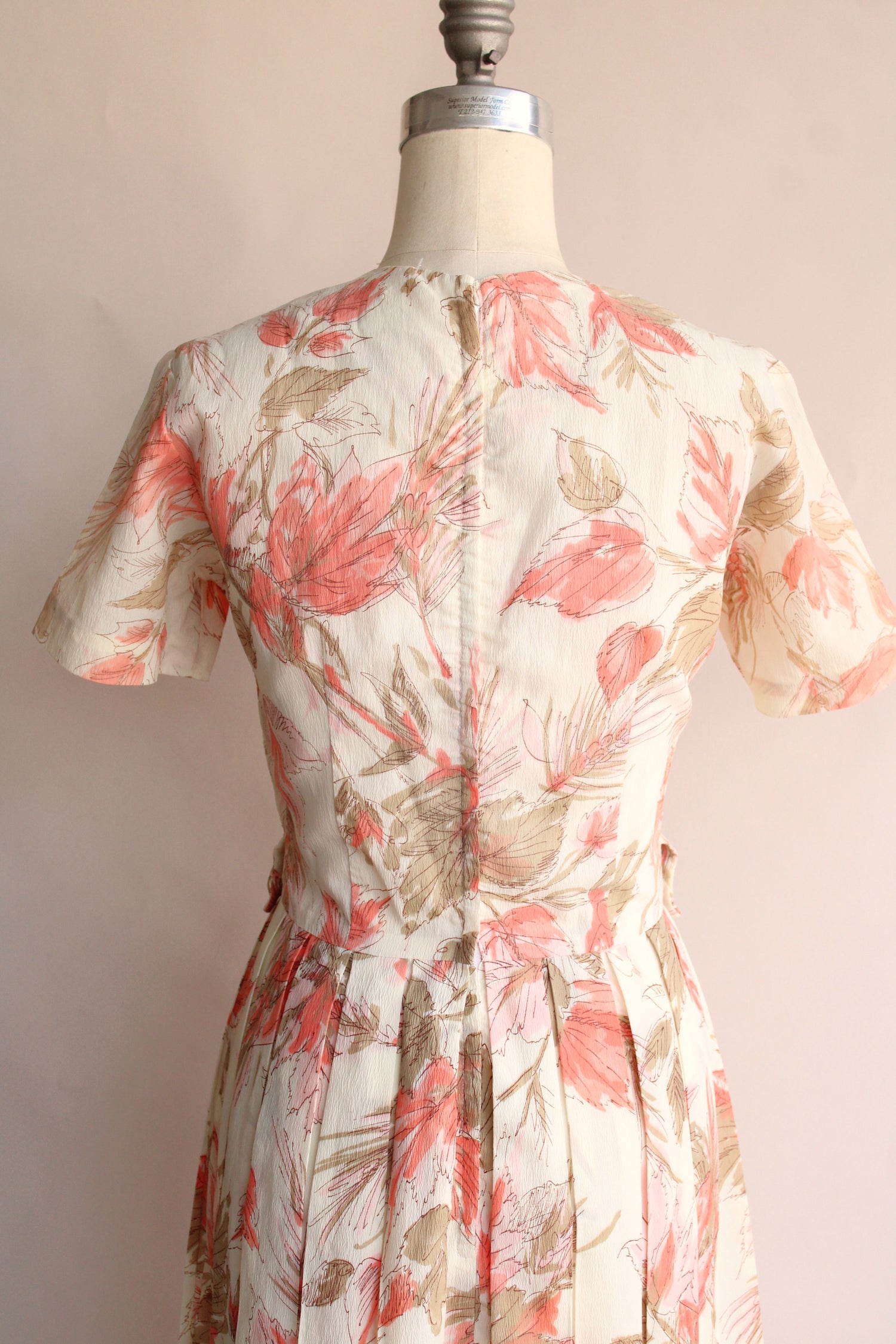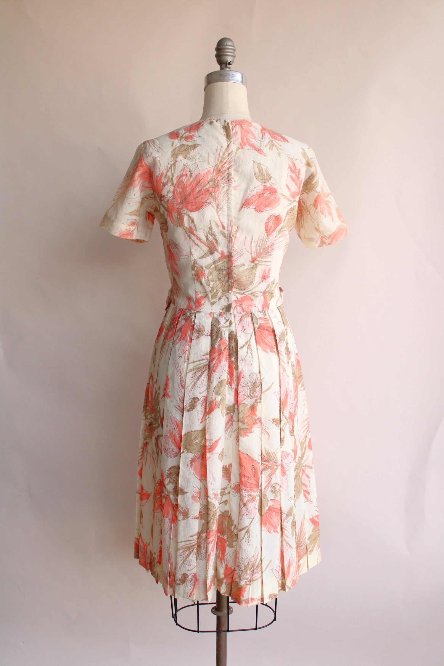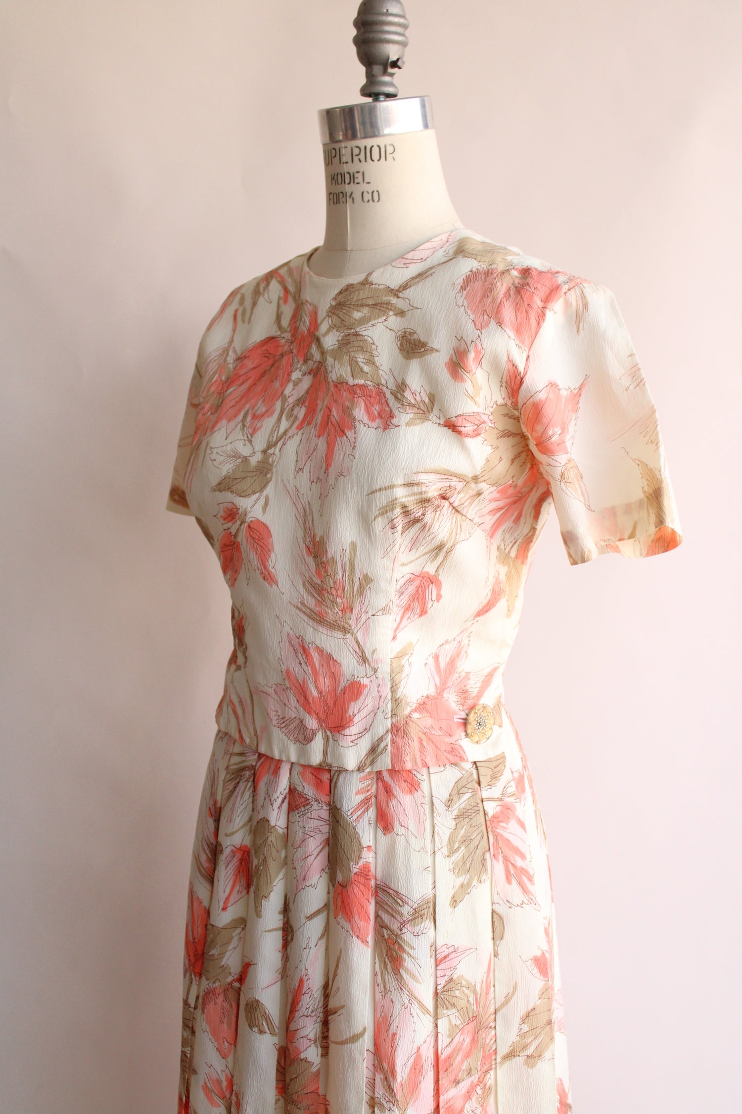 Darling 1960s dress in a charming floral print of peachy pink and gold on cream. Be sure to take a look at those darling buttons at either hip. I think they're Lucite, or something similar surely, with beautiful gold details. Bodice is made in such a way as to resemble a boxy top over a pleated skirt in the front, but it is all one piece. Bodice lined in cream. Label reads: There was one but its gone, I'm afraid, however the remains of a Union Made label is still there. Metal zipper up the back. Probably a smaller medium size. Looks and feels like rayon to me.