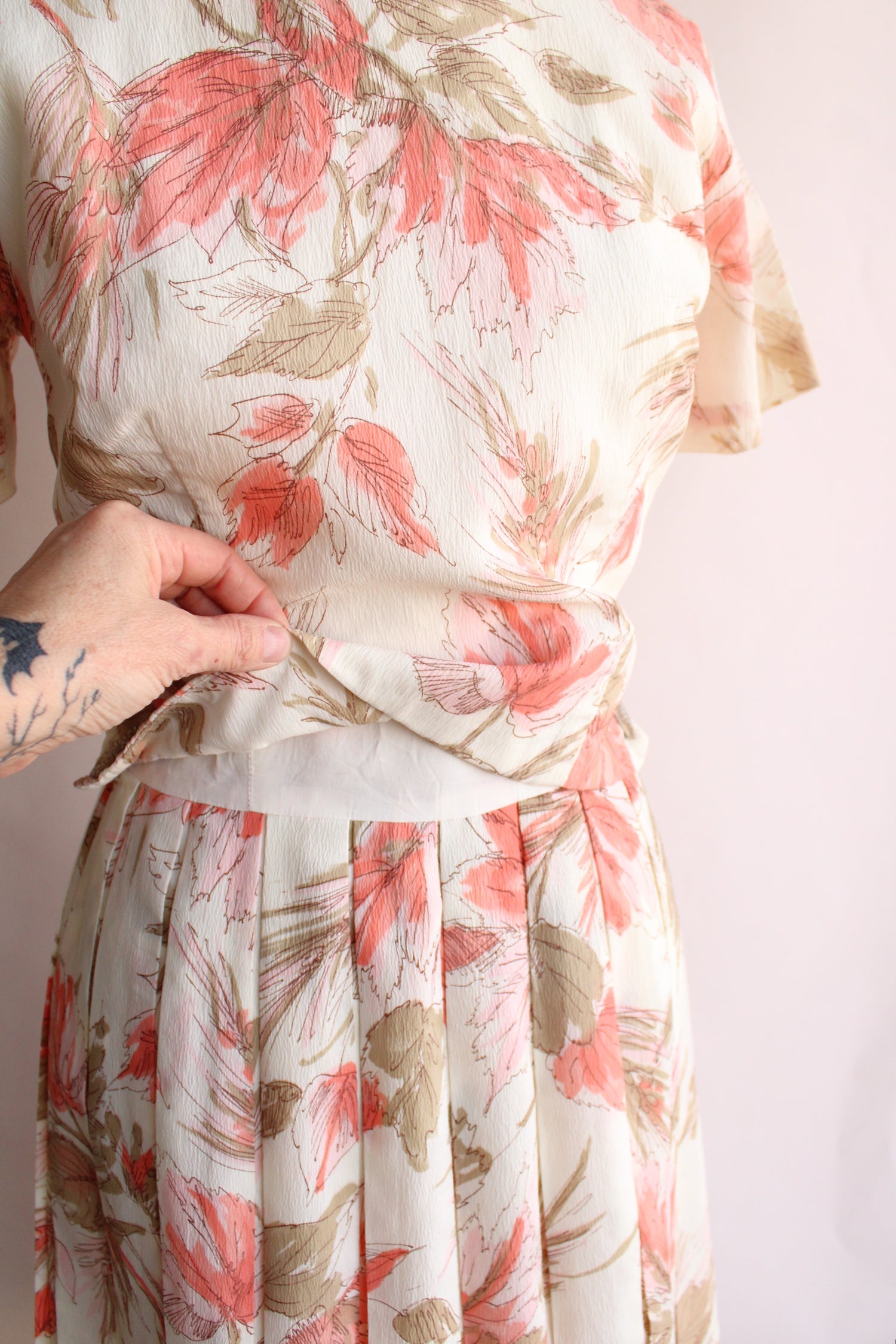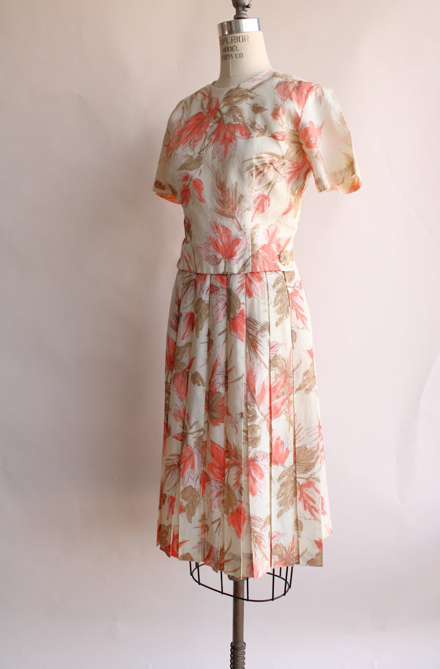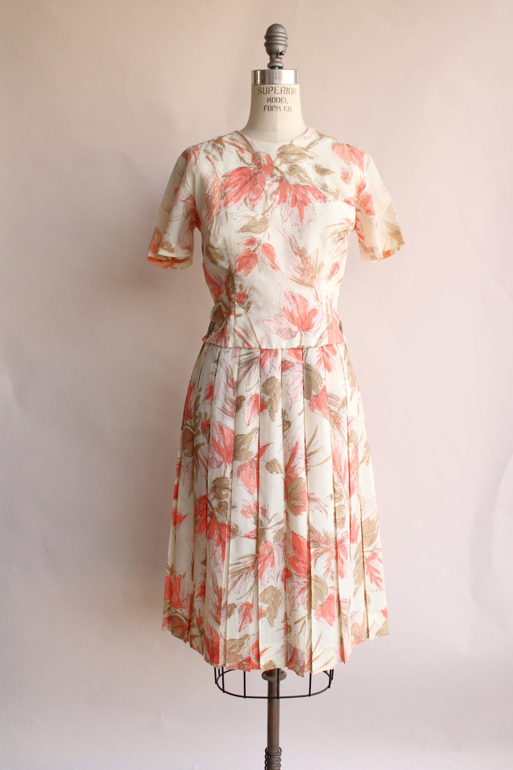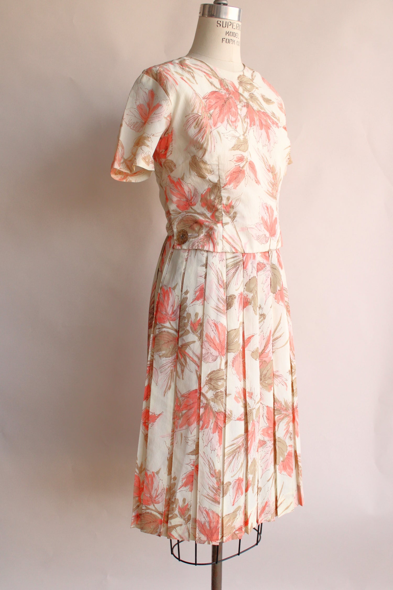 Darling 1960s dress in a charming floral print of peachy pink and gold on cream. Be sure to take a look at those darling buttons at either hip. I think they're Lucite, or something similar surely, with beautiful gold details. Bodice is made in such a way as to resemble a boxy top over a pleated skirt in the front, but it is all one piece. Bodice lined in cream. Label reads: There was one but its gone, I'm afraid, however the remains of a Union Made label is still there. Metal zipper up the back. Probably a smaller medium size. Looks and feels like rayon to me.