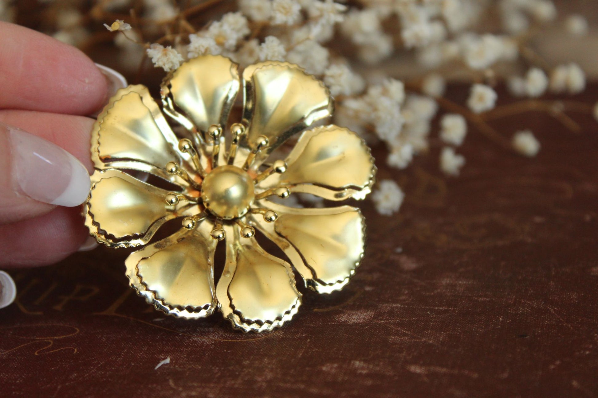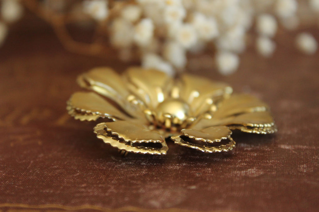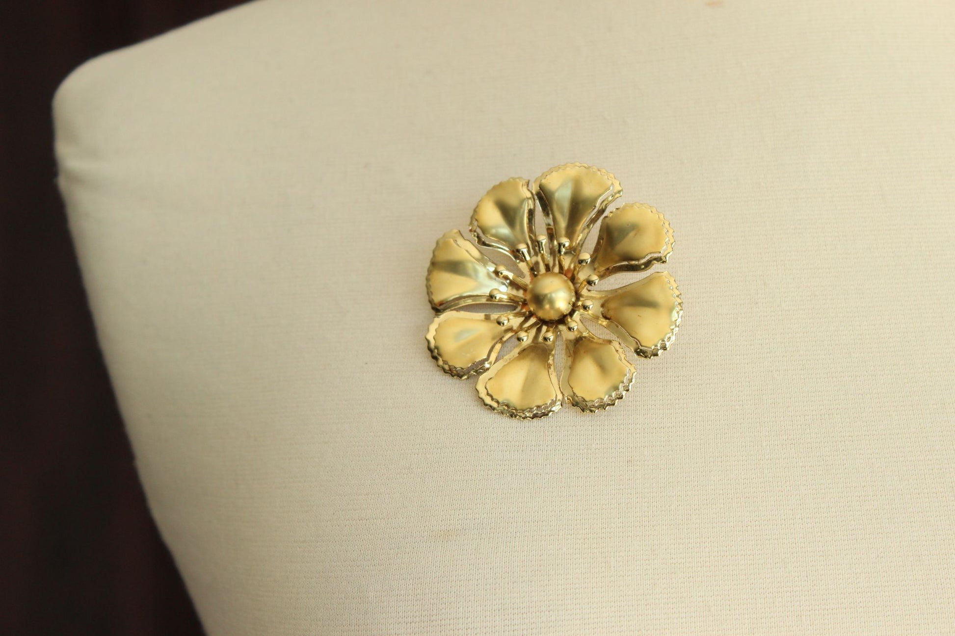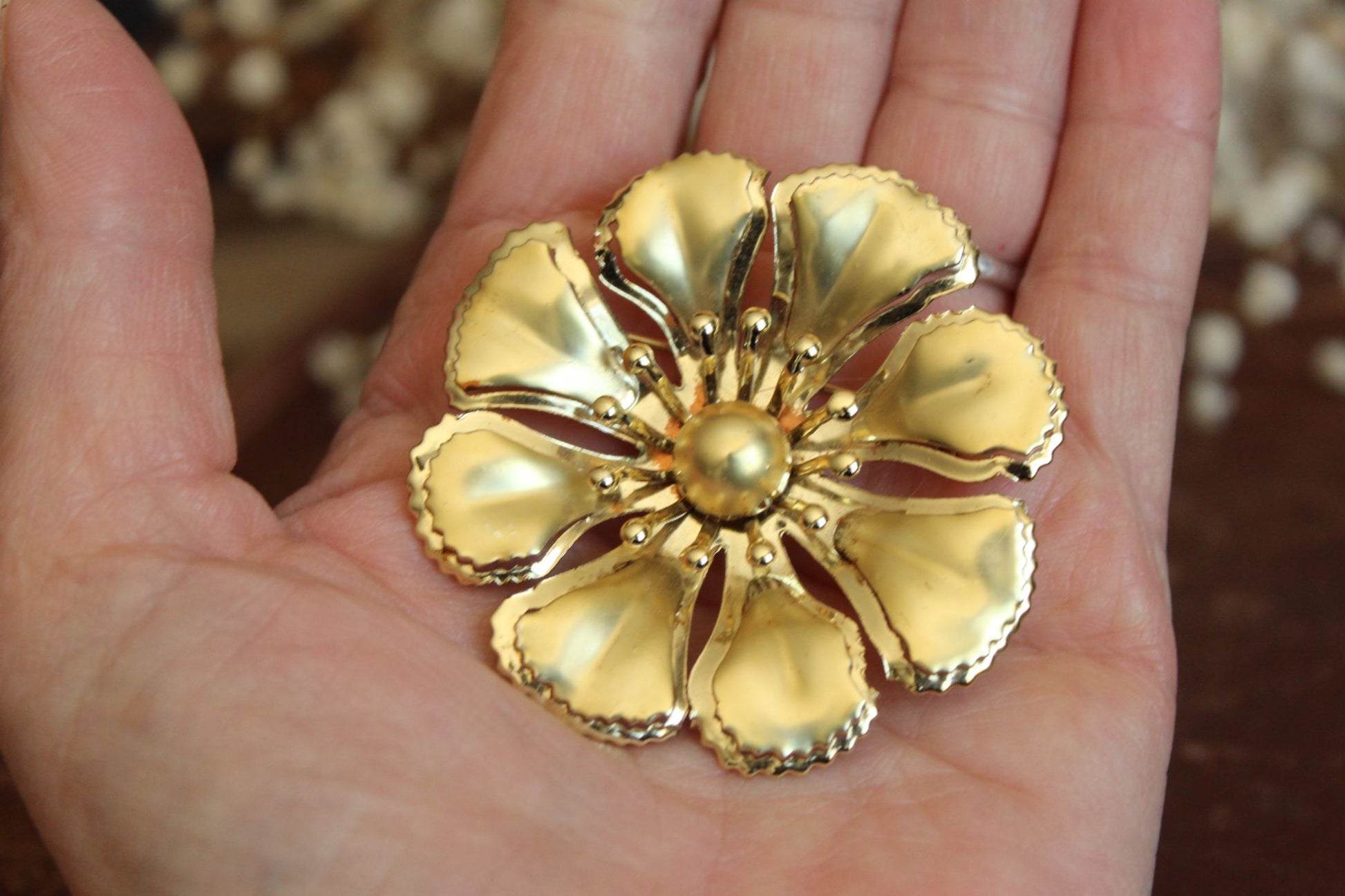 Charming brooch circa the 1960s. A large gold flower. Its 2.25" in diameter. No marks.