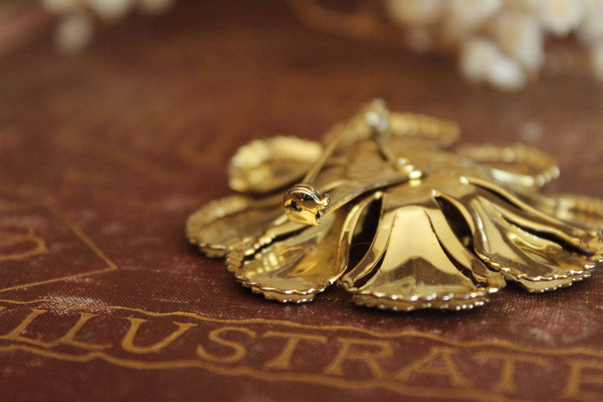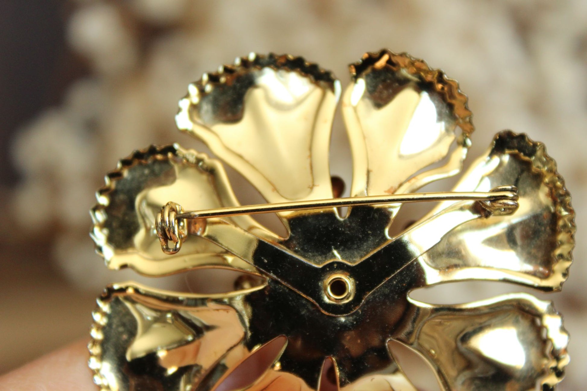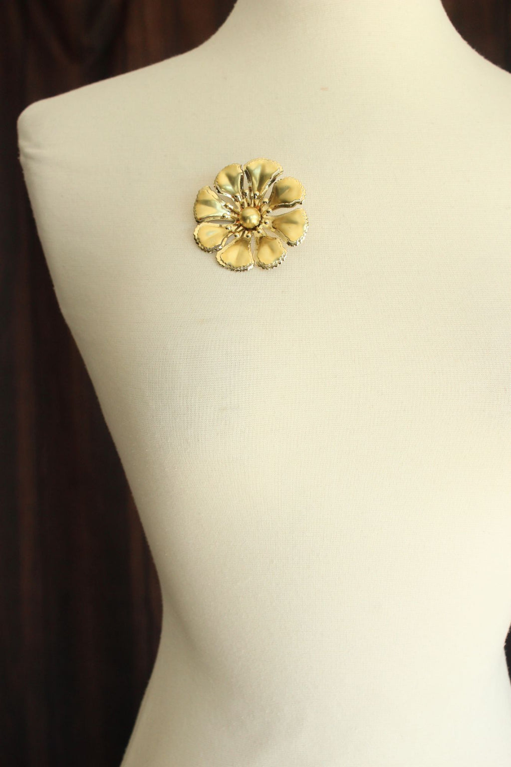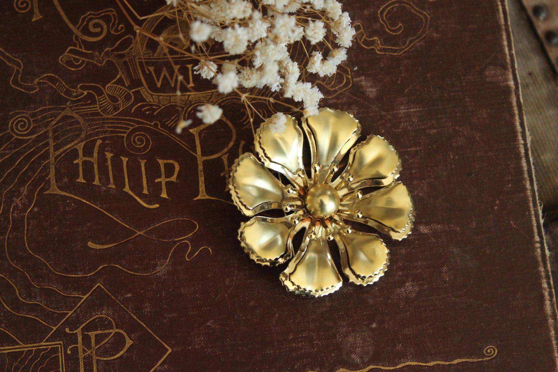 Charming brooch circa the 1960s. A large gold flower. Its 2.25" in diameter. No marks.