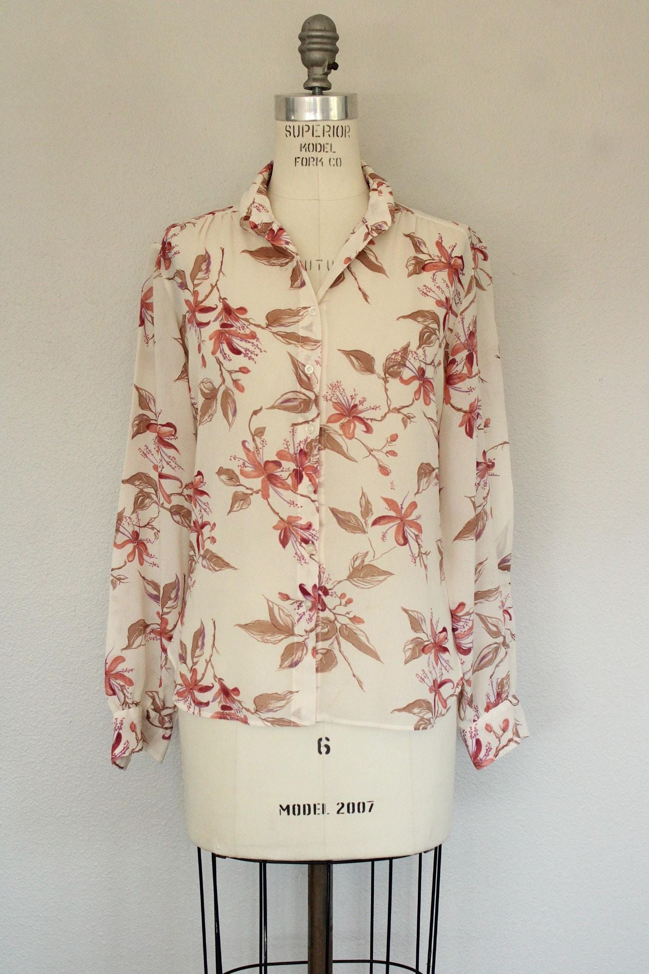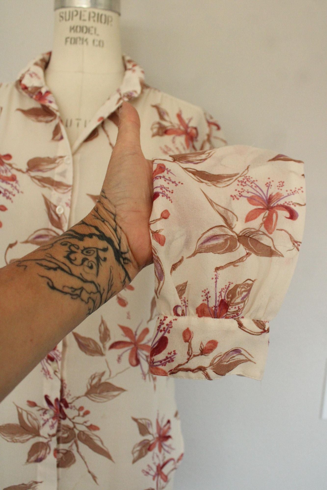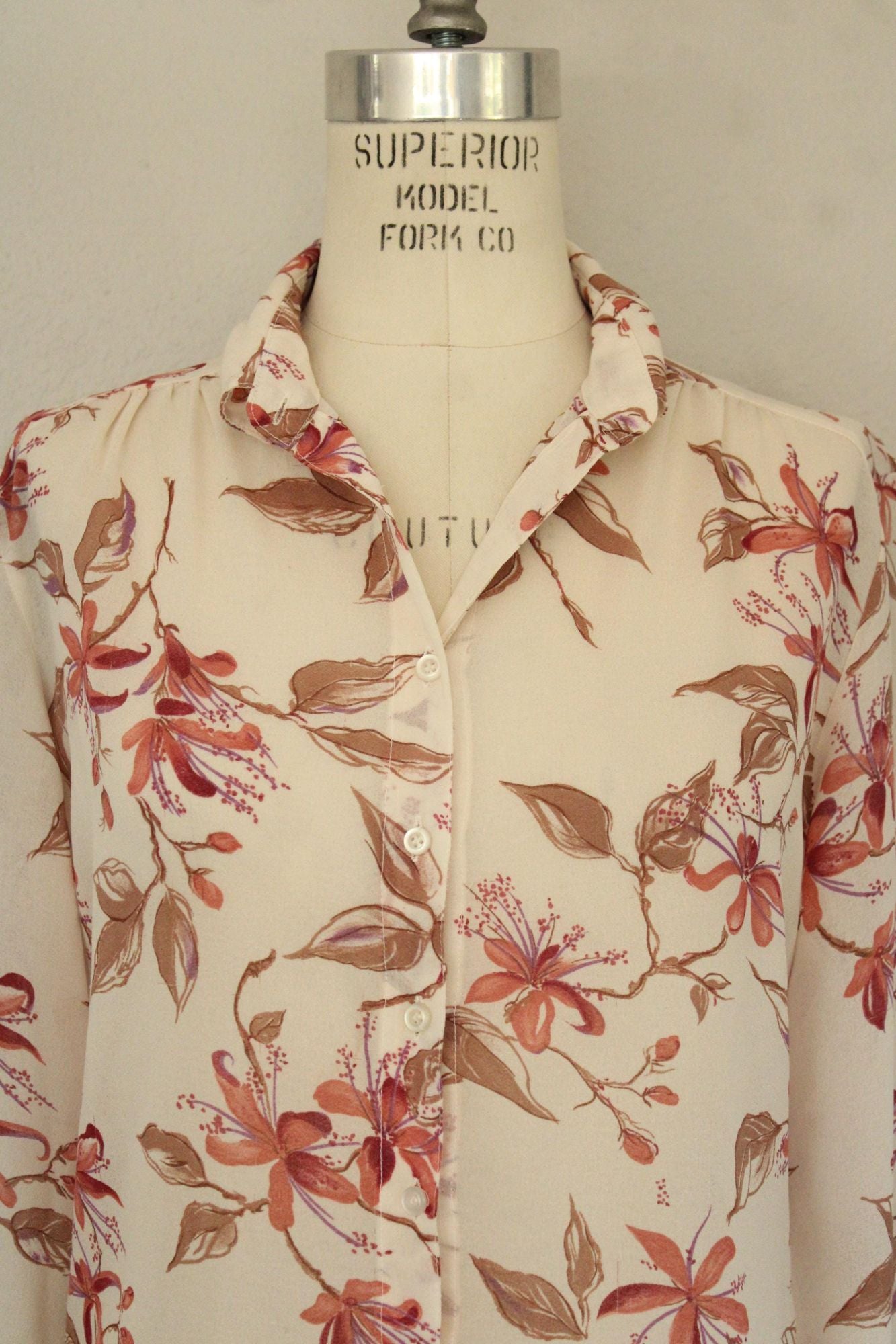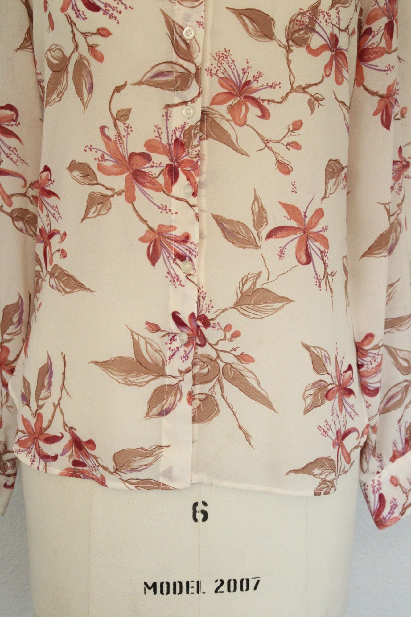 Fun vintage floral print 1970s button down blouse. Winter white background with flowers in shades of brick brown and purple. Pretty cuffed sleeves. Label reads: Campus Casuals. Looks and Feels like semi sheer poly or nylon to me. About a medium to large I'd say.