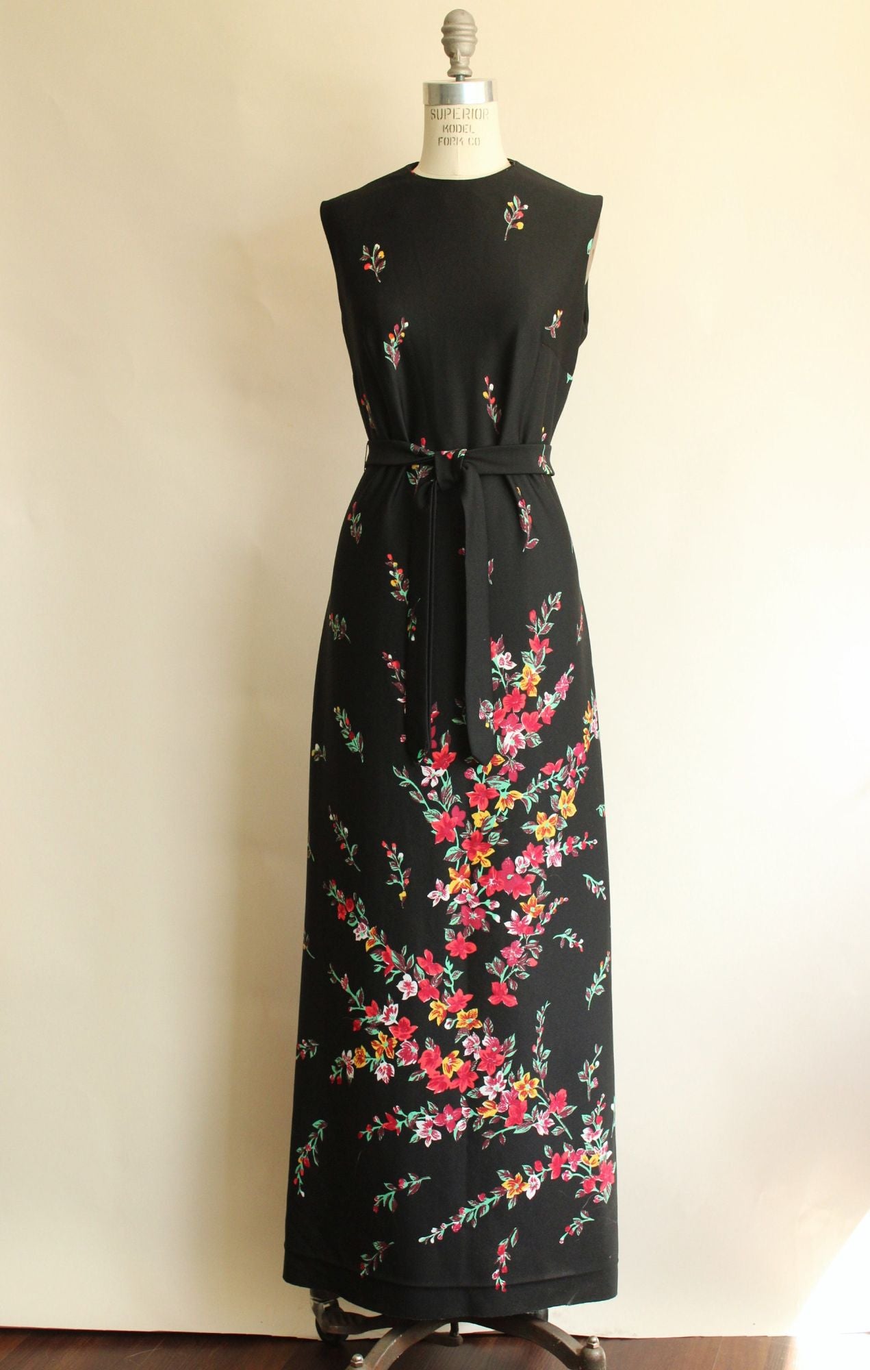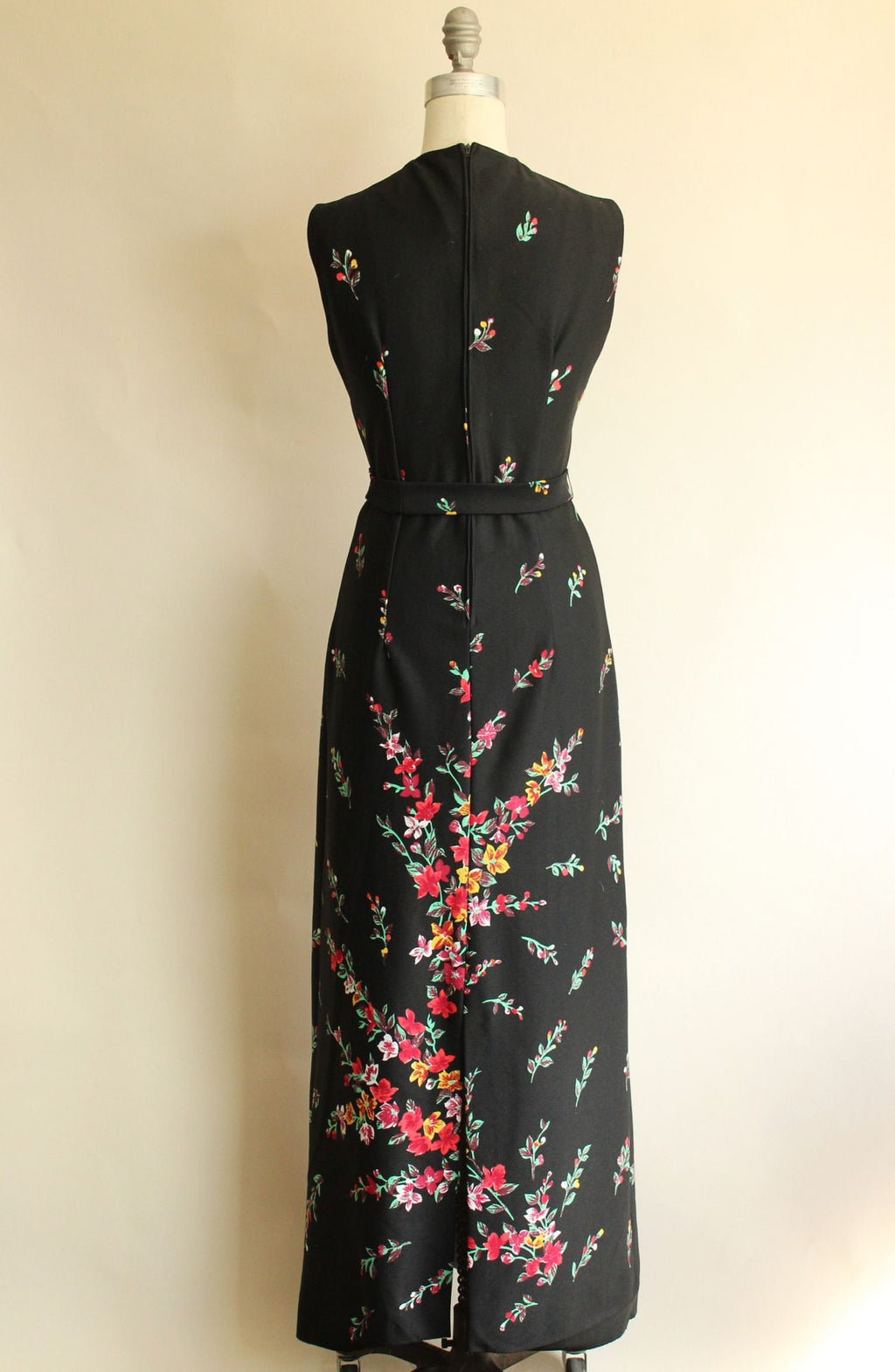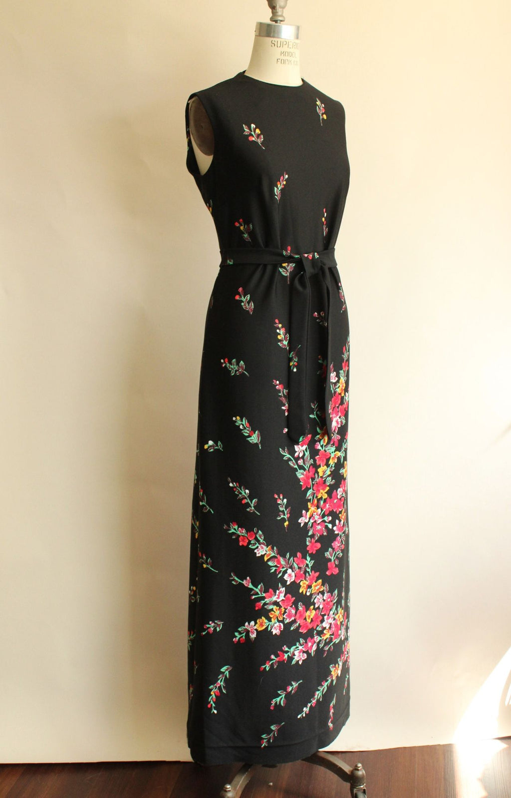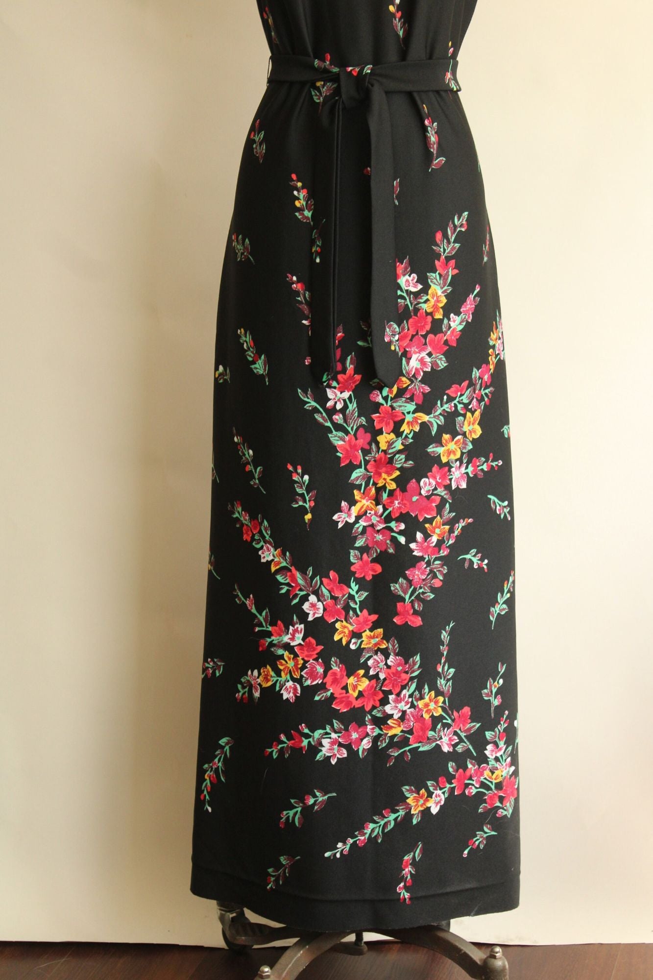 Vintage 1970s Lady Carol Black Floral Print Maxidress