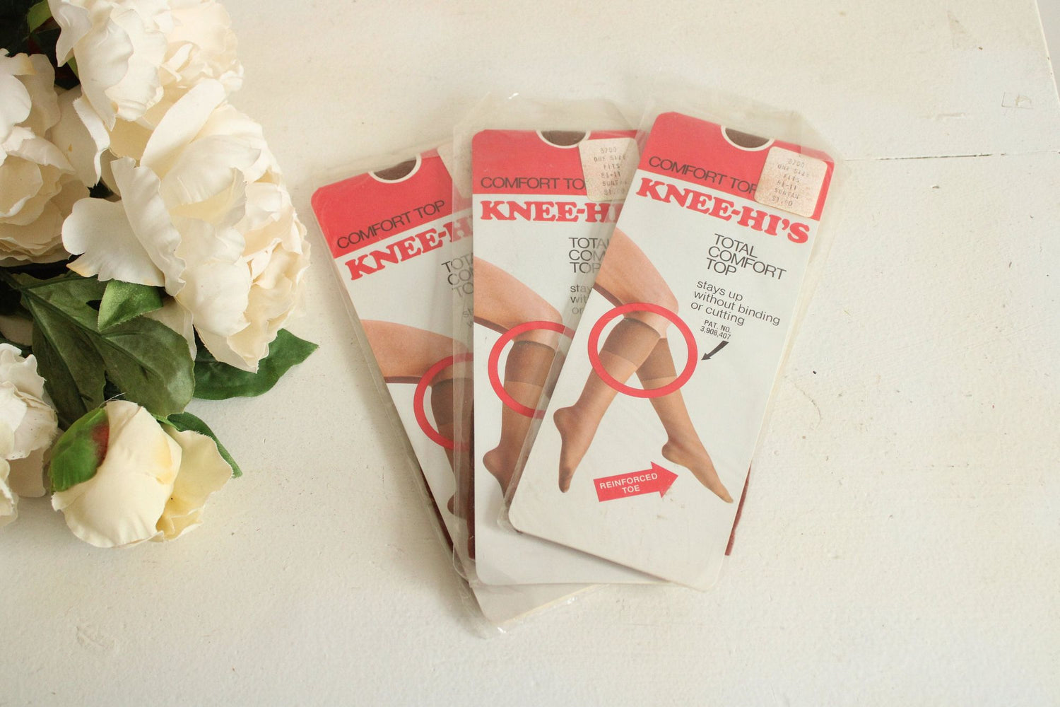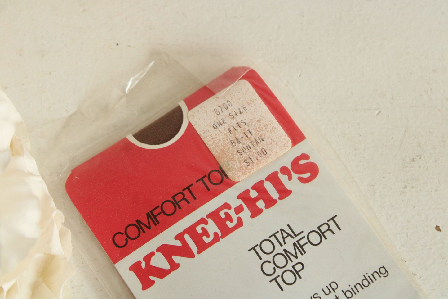 New old stock, vintage circa the 1980s 1990s knee high stockings. Listing is for one package of one pair. Comfort Top One Size Fits 8.5-11. There is a tag that says Suntan.