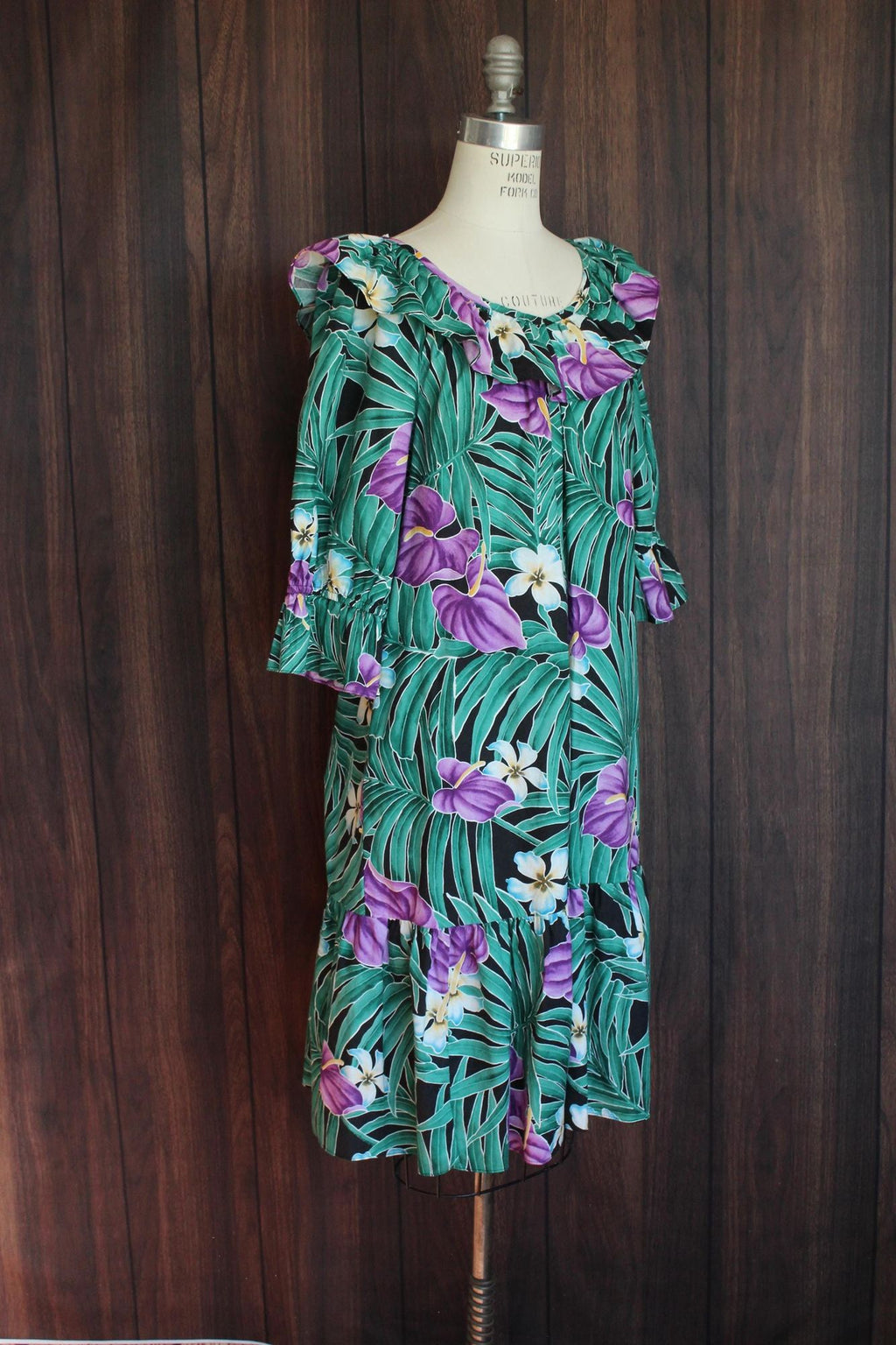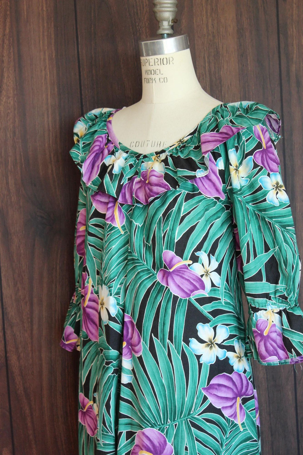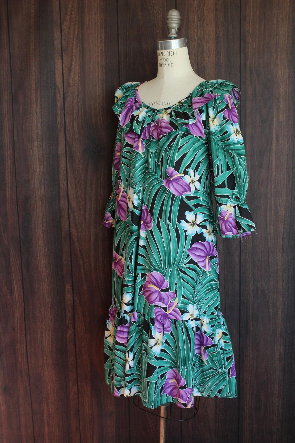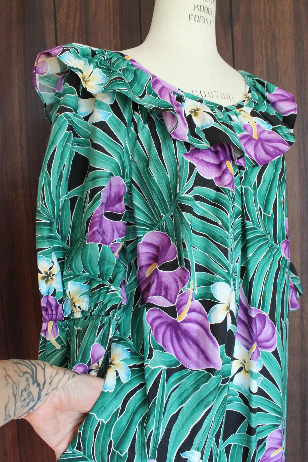 Darling vintage 1980s Hawaiian floral print dress in green black and purple with touches of blue and yellow. Mumu shape with a fun ruffle neckline and one pocket at the right hip. Unlined. Label reads: Hilo Hattie, Made in Hawaii. Size medium but do see measurements below. 100% cotton.