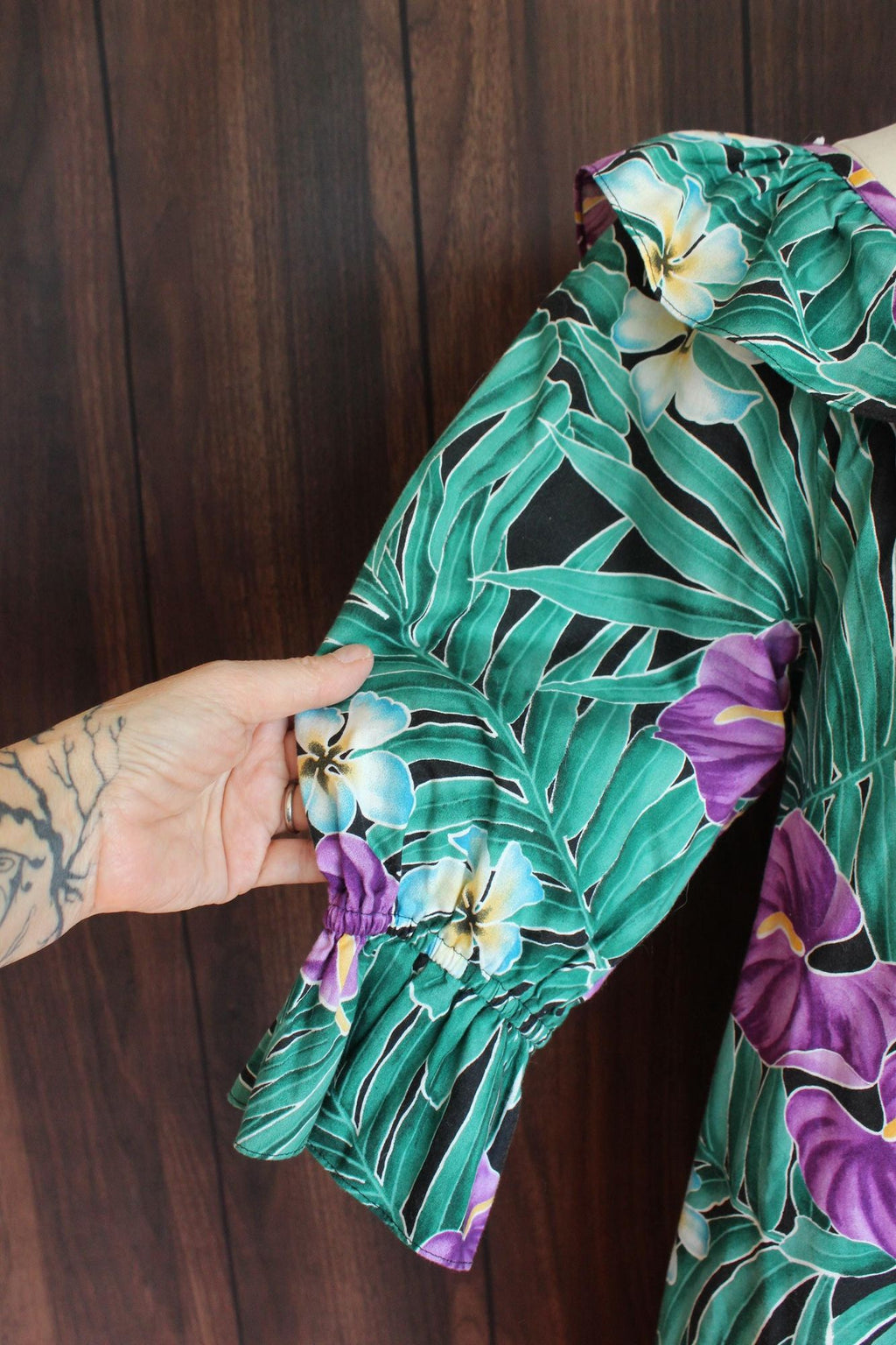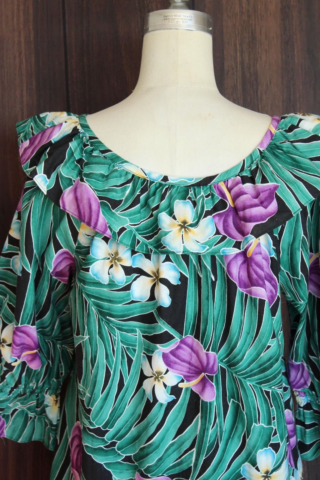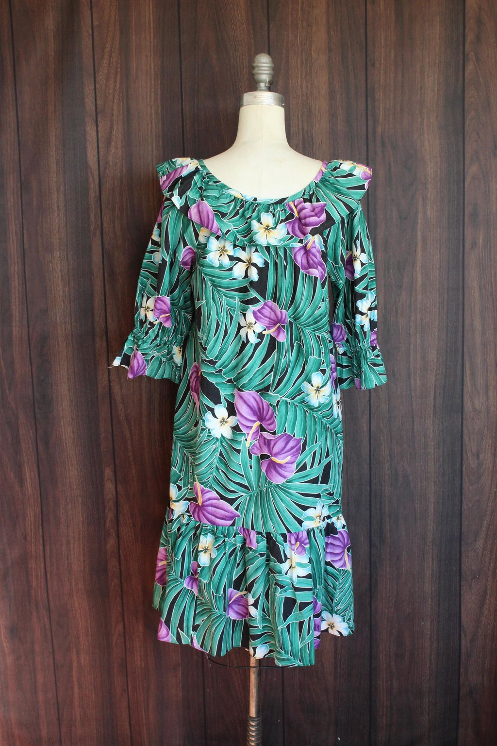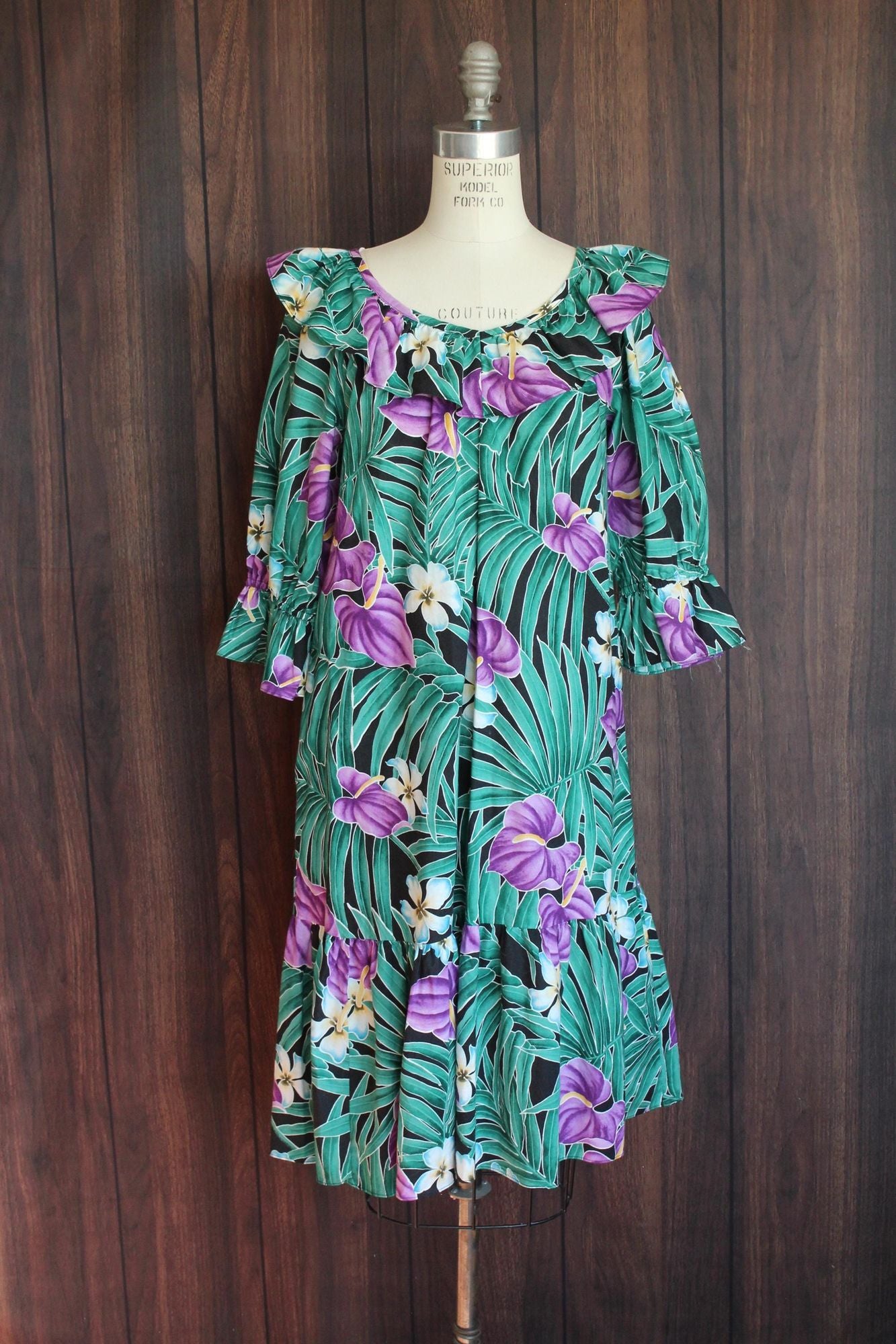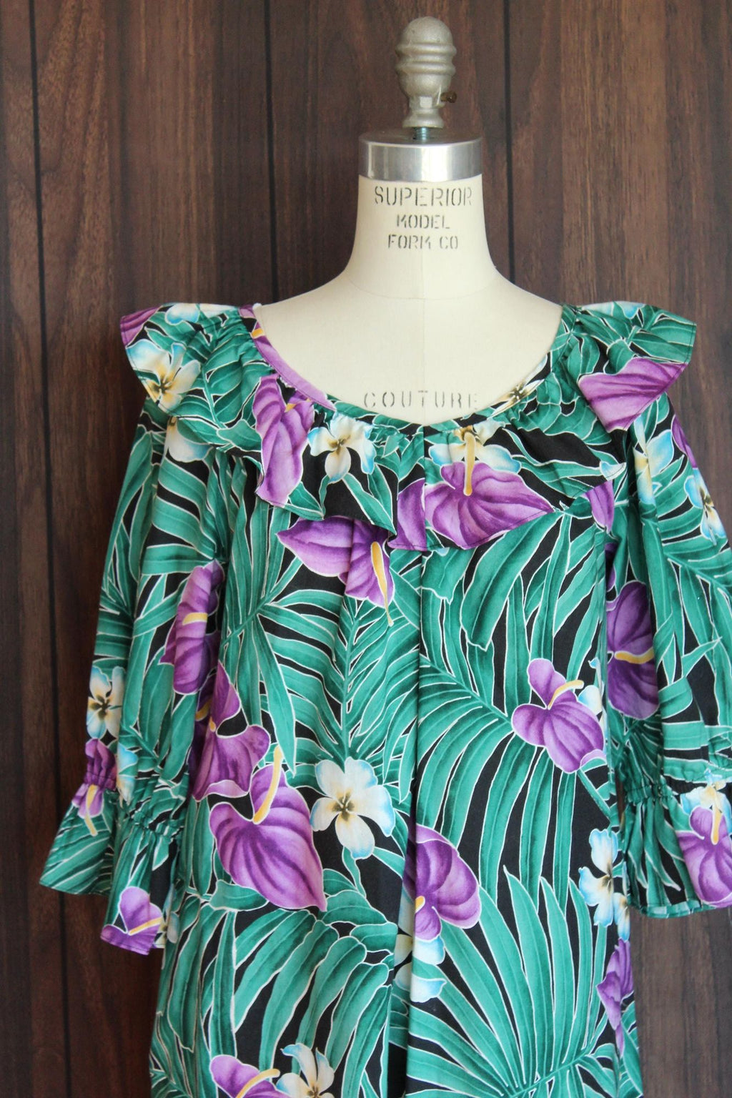 Darling vintage 1980s Hawaiian floral print dress in green black and purple with touches of blue and yellow. Mumu shape with a fun ruffle neckline and one pocket at the right hip. Unlined. Label reads: Hilo Hattie, Made in Hawaii. Size medium but do see measurements below. 100% cotton.