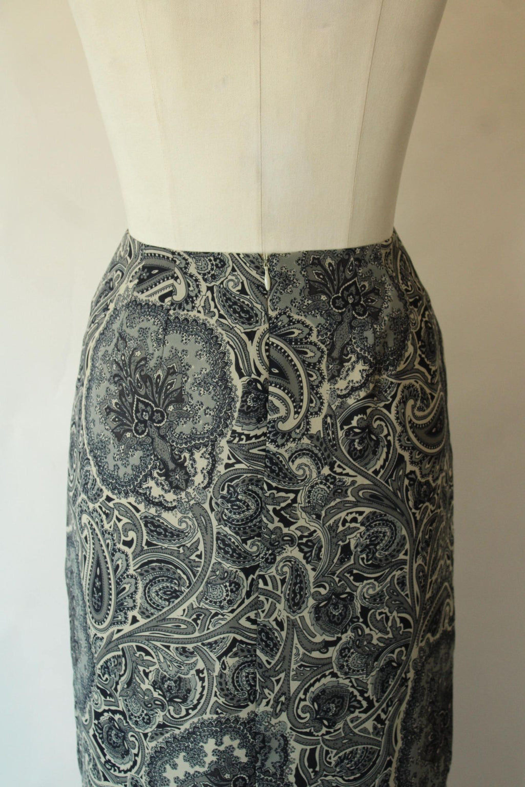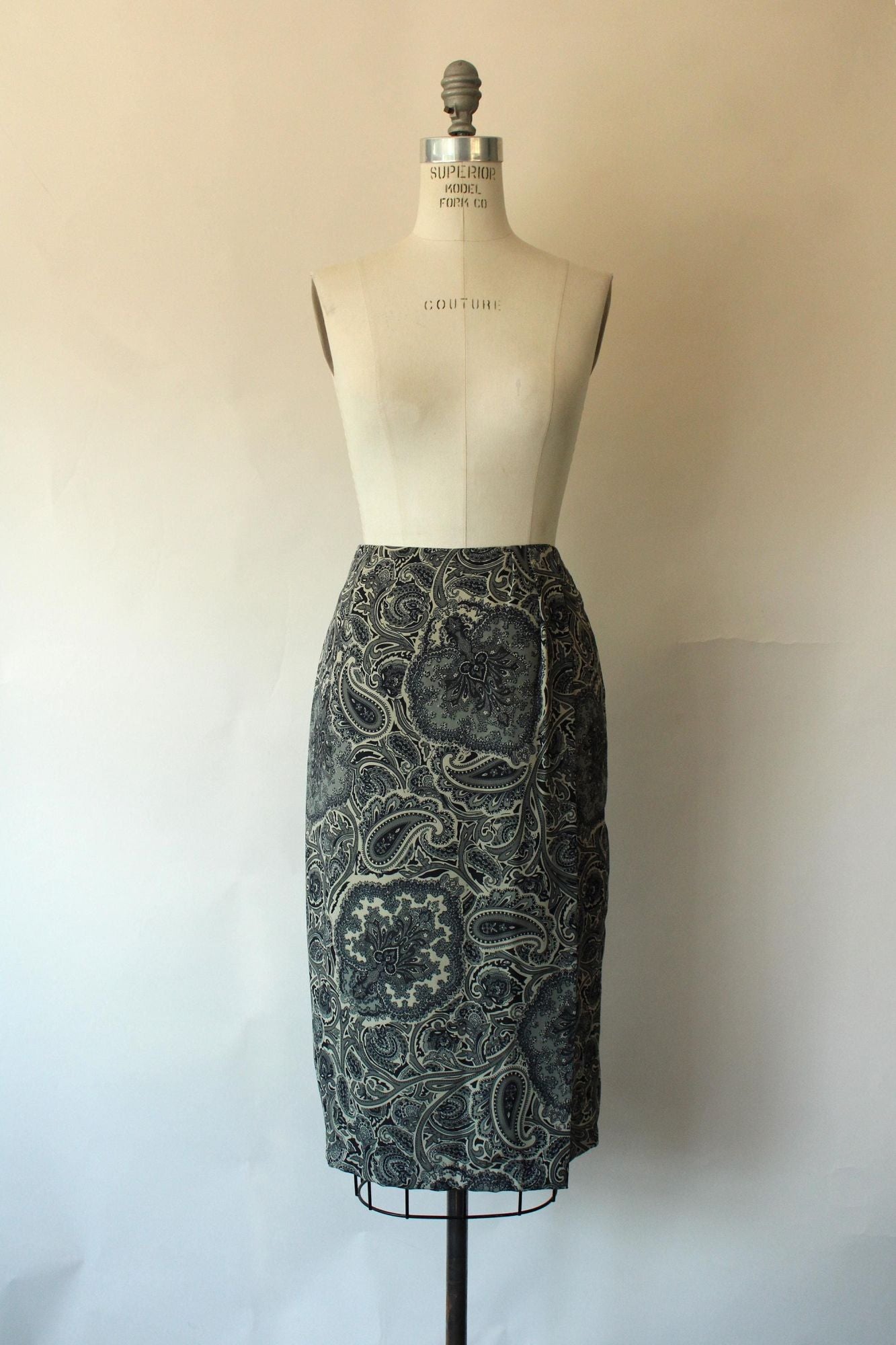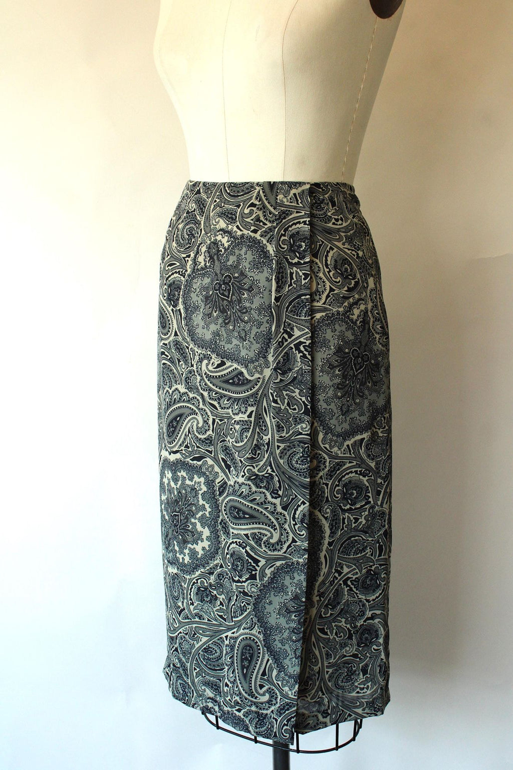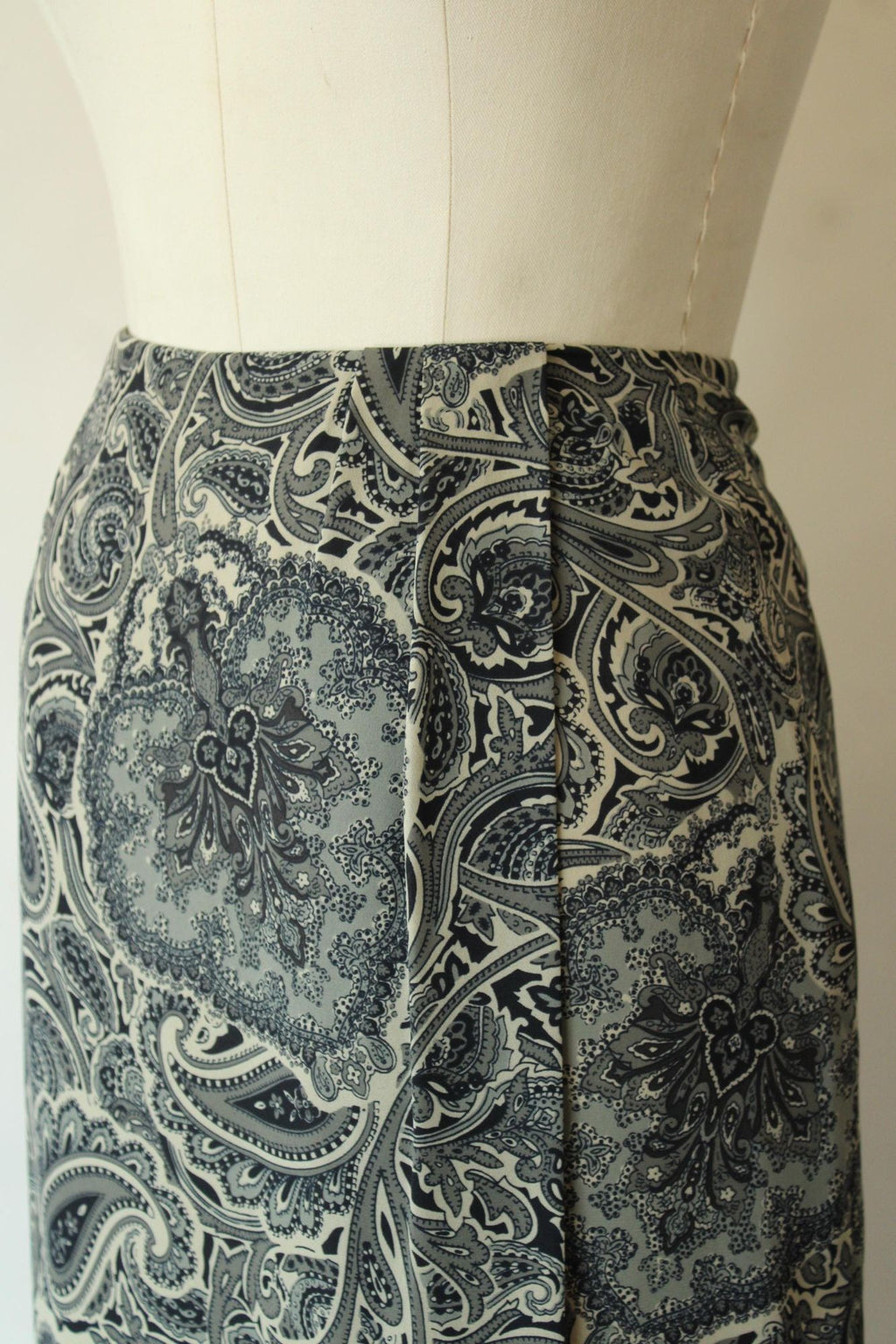 Classic vintage skirt from the 1990s, maybe earliest 2000s in a navy blue and cream paisley print. Skirt is a slim faux wrap pencil shape with a zipper in the back. Its fully lined. Label reads: Chaus. Skirt says a size 4 but do see measurements below as vintage sizing is different than modern. 100% poly.