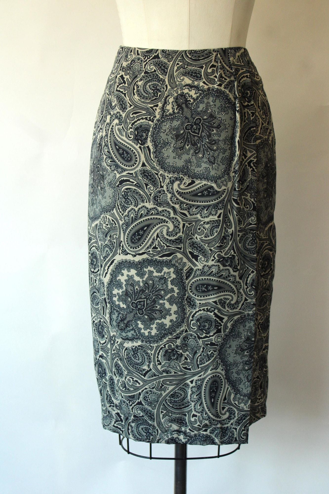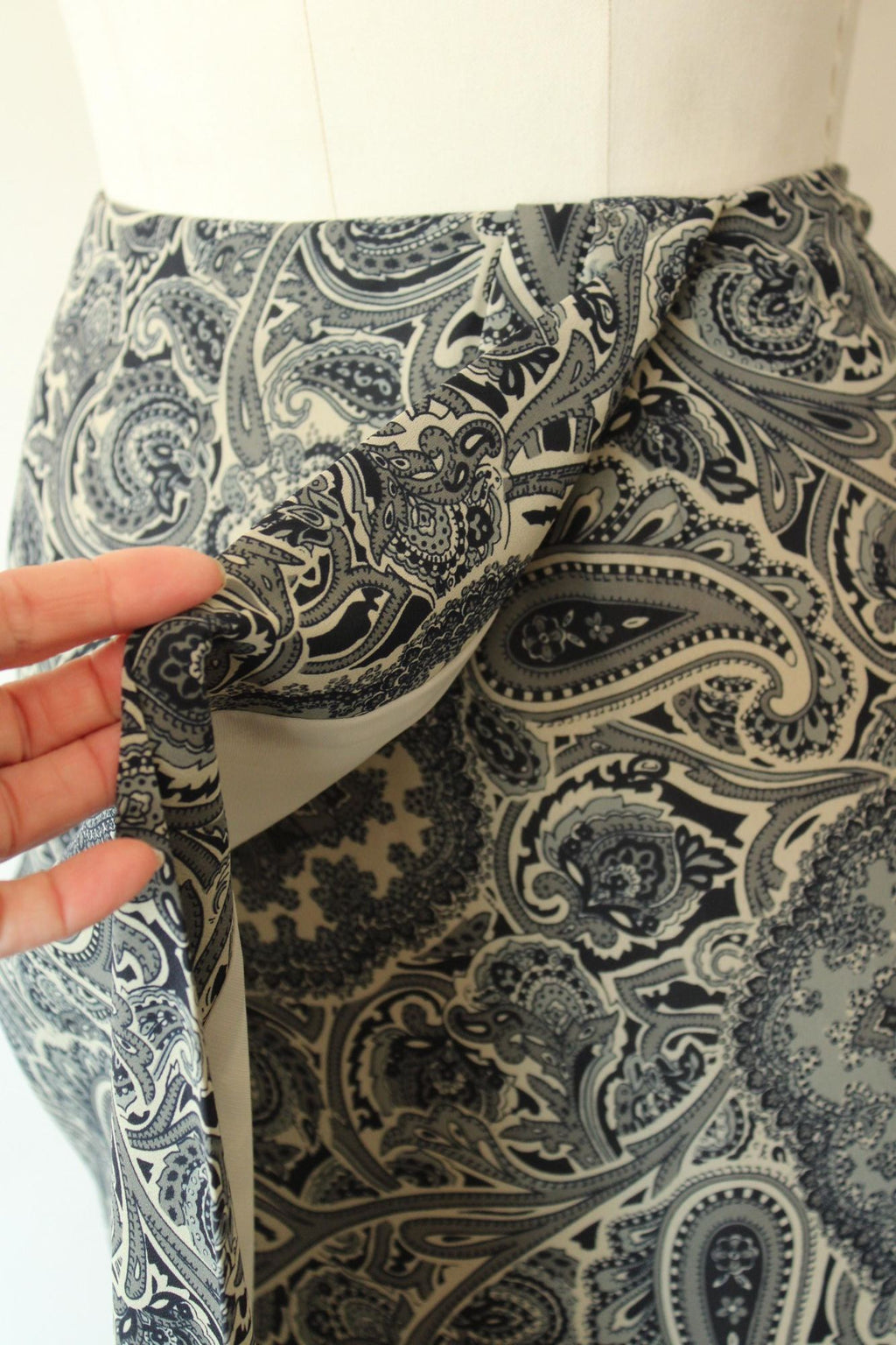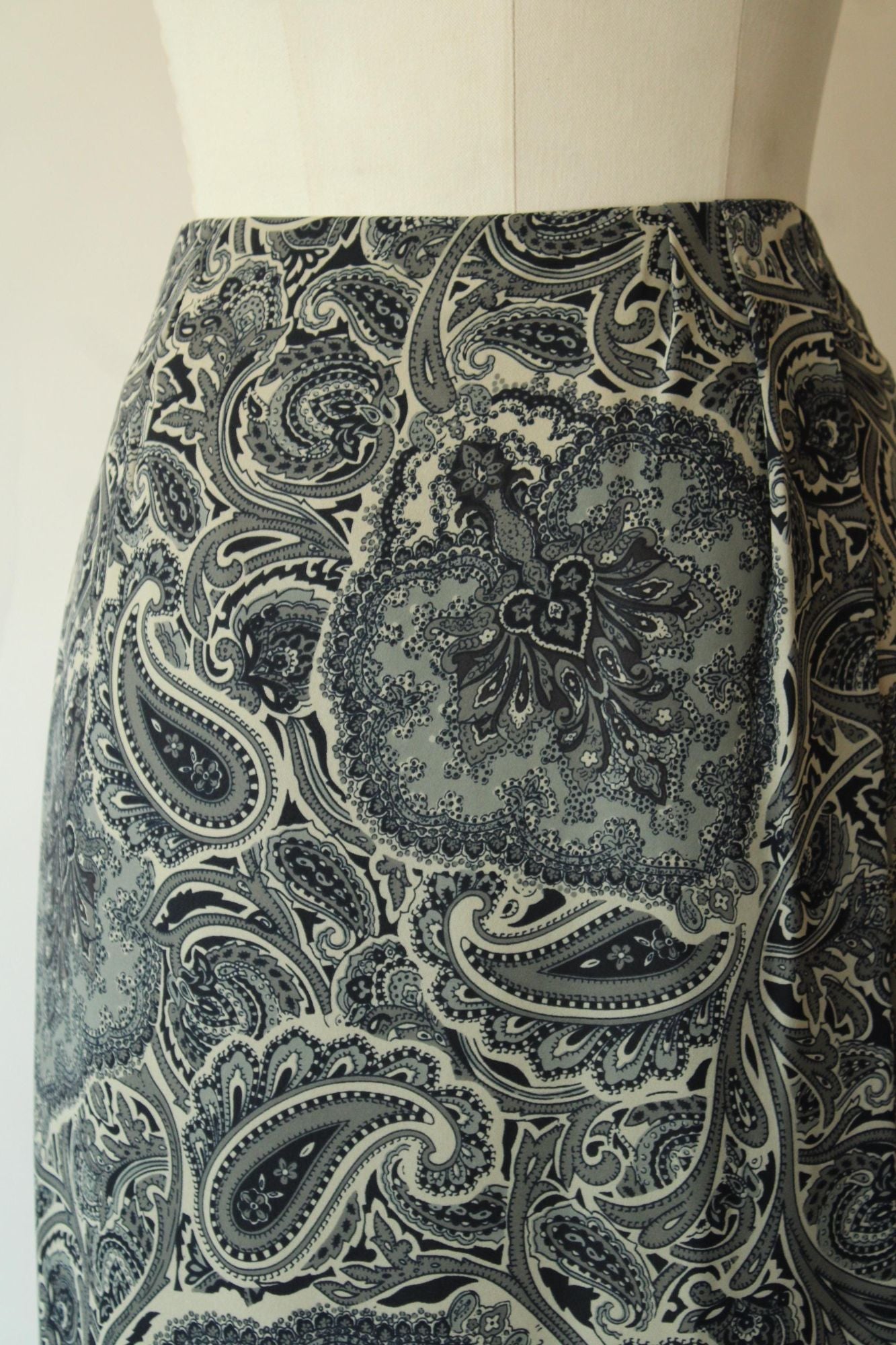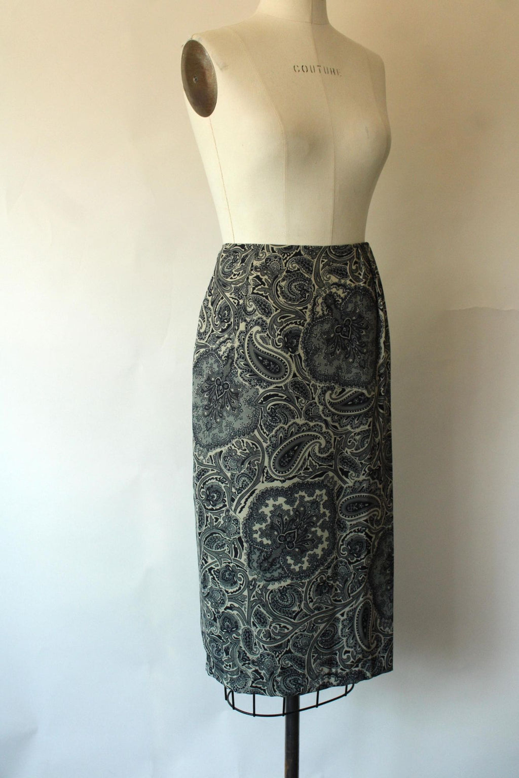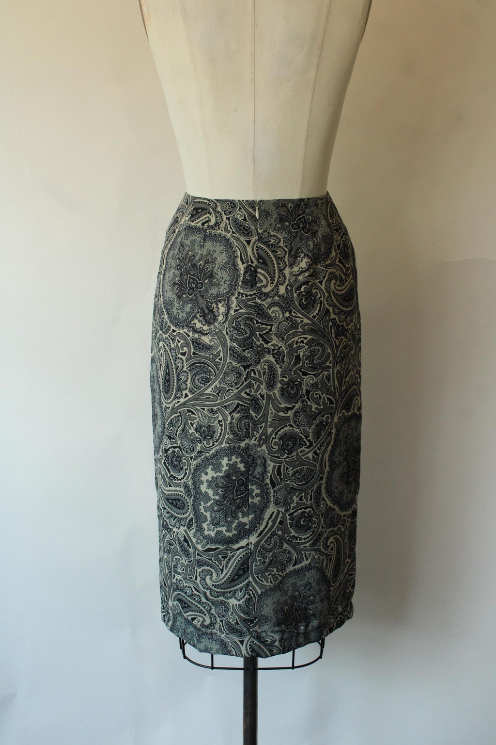 Classic vintage skirt from the 1990s, maybe earliest 2000s in a navy blue and cream paisley print. Skirt is a slim faux wrap pencil shape with a zipper in the back. Its fully lined. Label reads: Chaus. Skirt says a size 4 but do see measurements below as vintage sizing is different than modern. 100% poly.