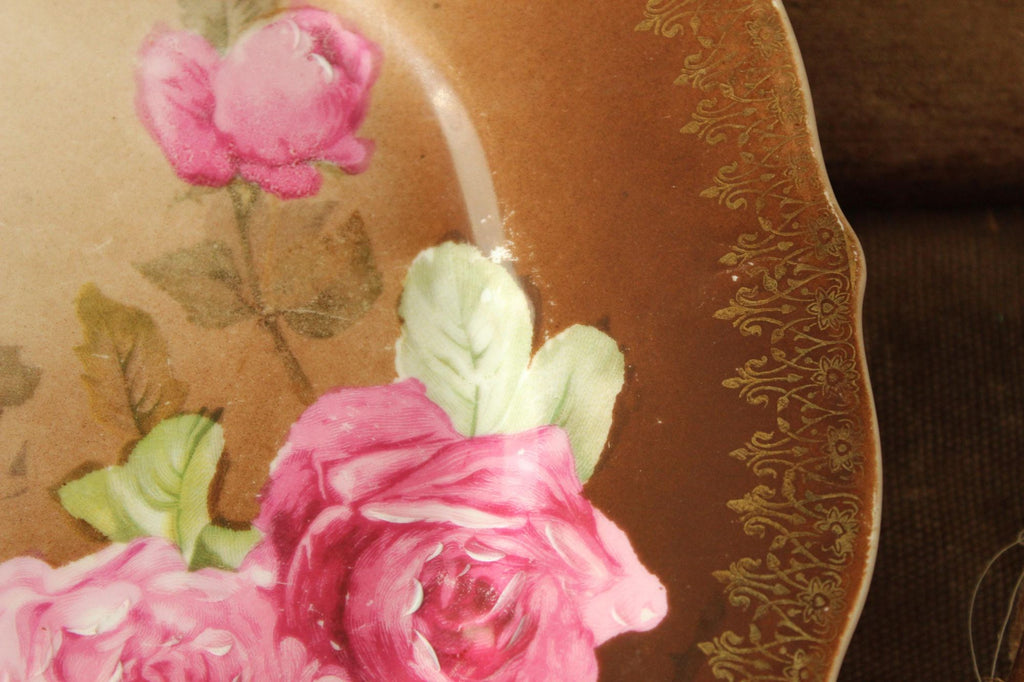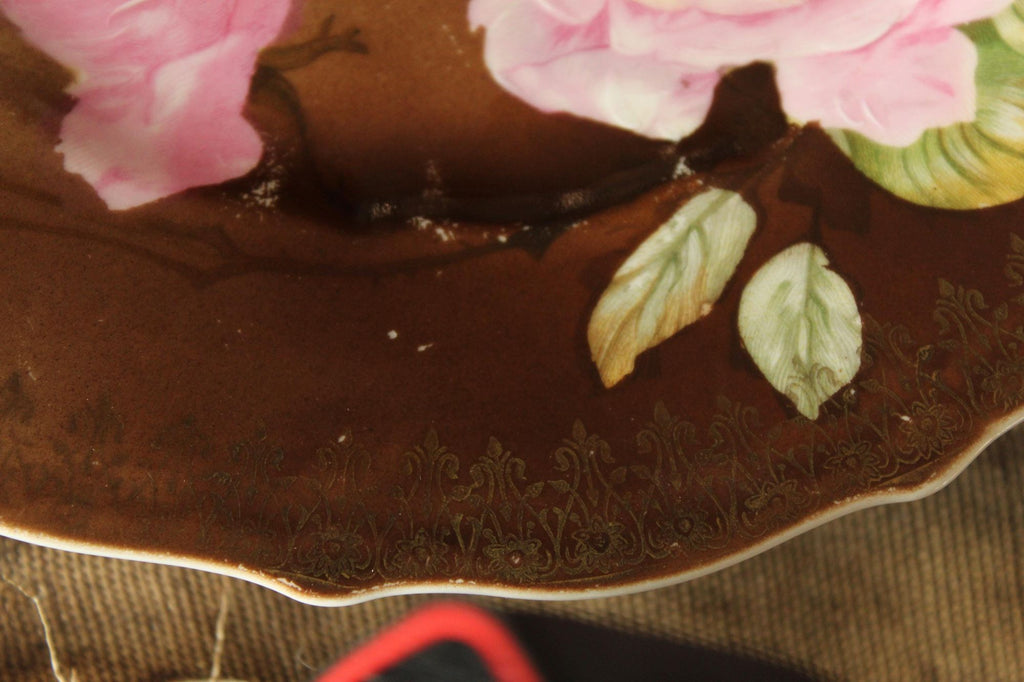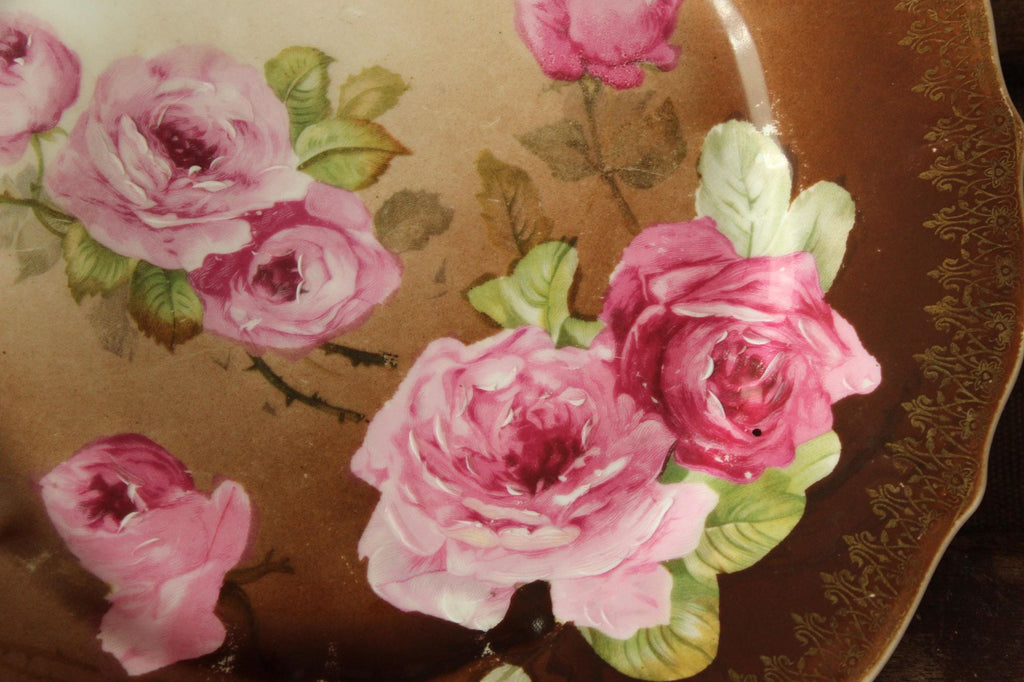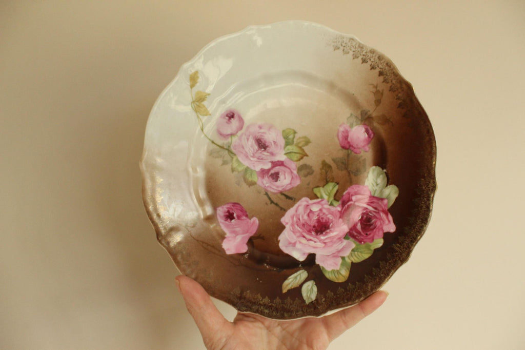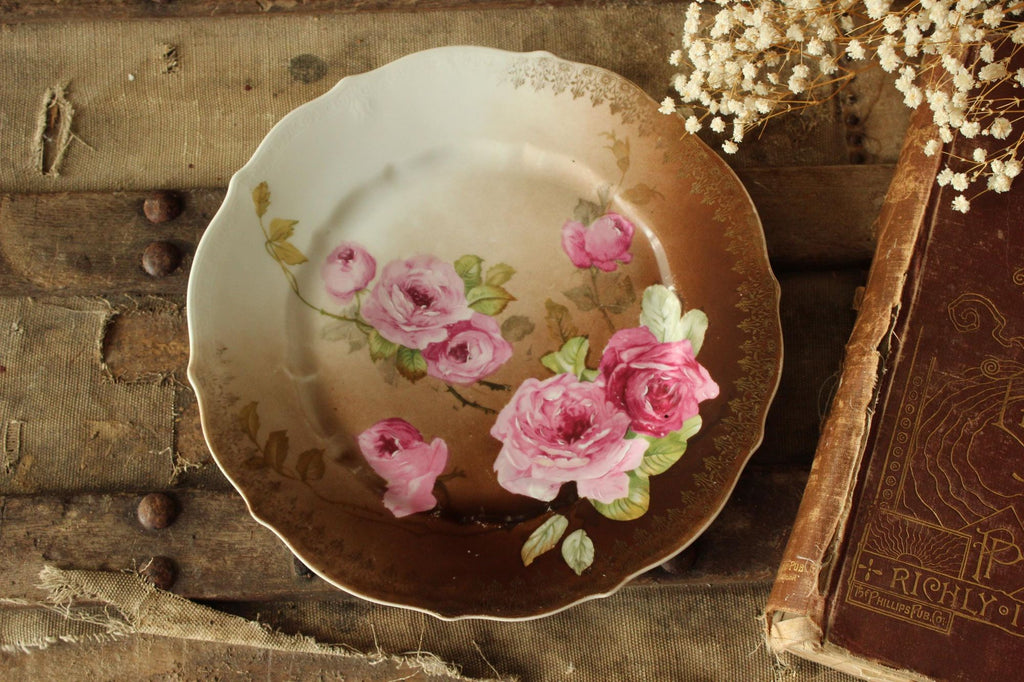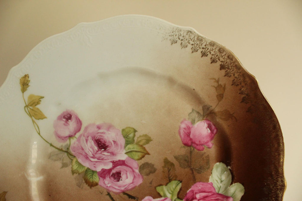 Beautiful vintage / antique collectible plate, dated between 1875 to 1935. Roses in shades of pink and creamy white and greens against an ombre brown background with gold details round the rim. Scalloped edge. The plate measures just about 9.5" in diameter. Marked on the bottom with CT and the eagle mark of Carl Tielsch, Altwasser.