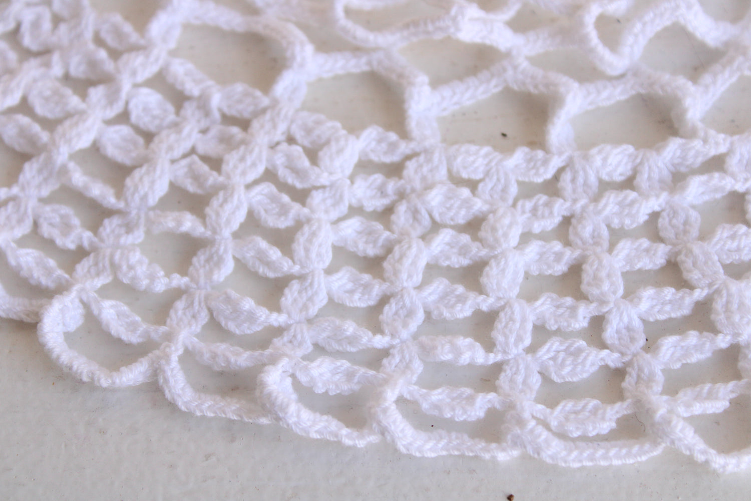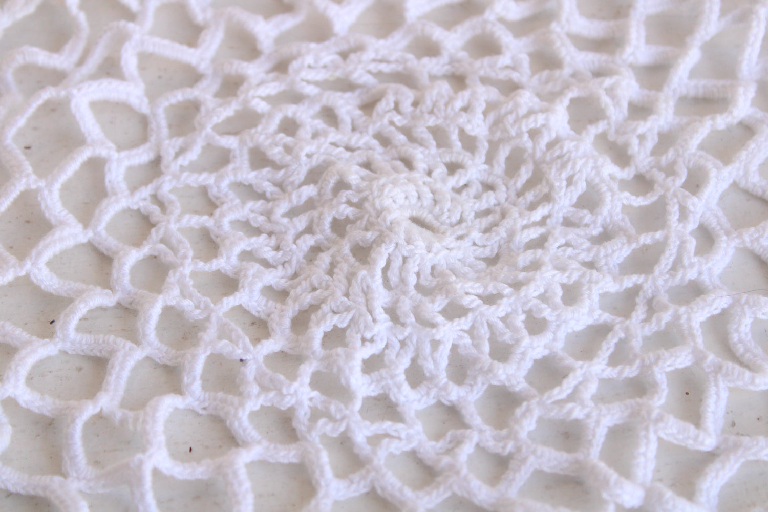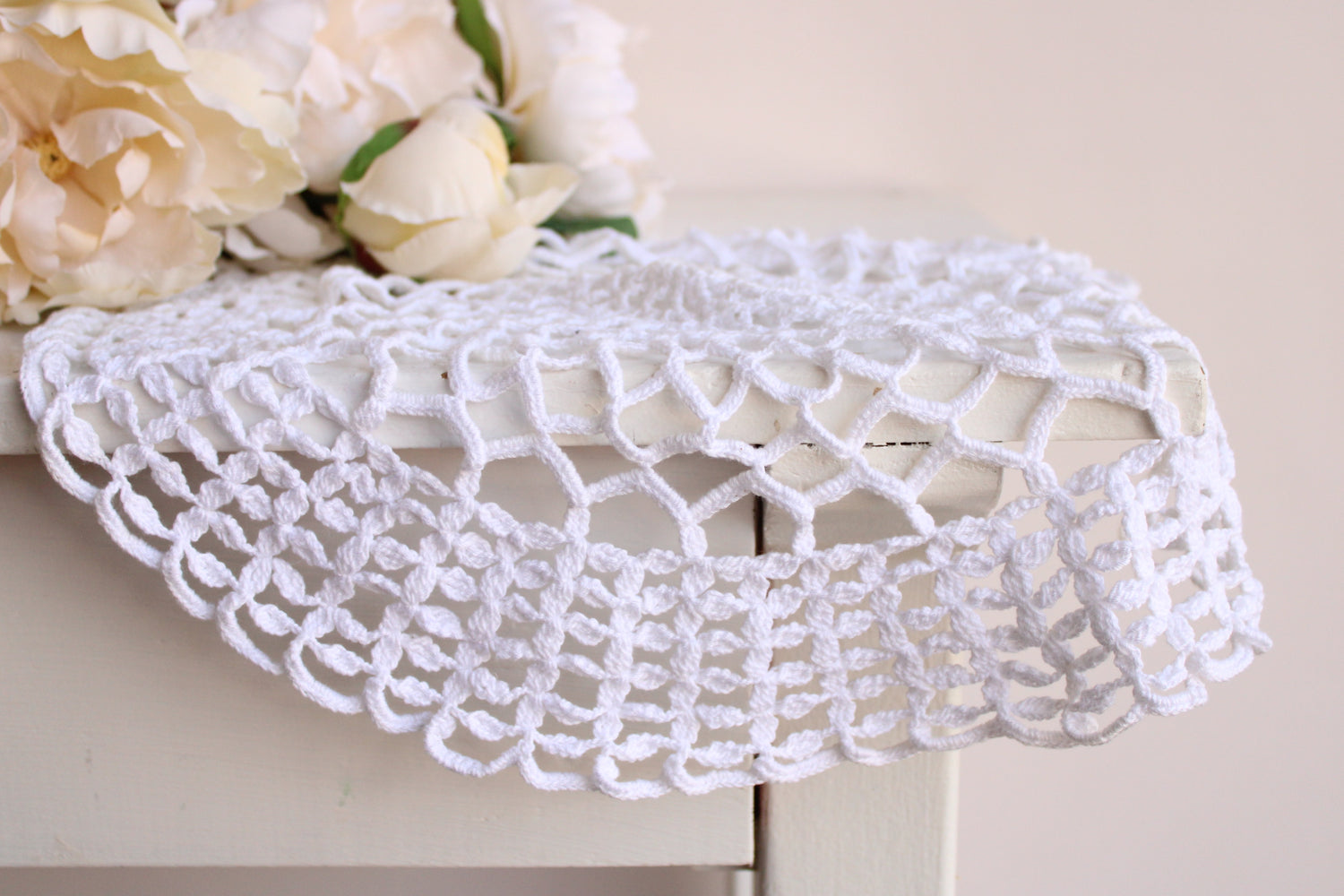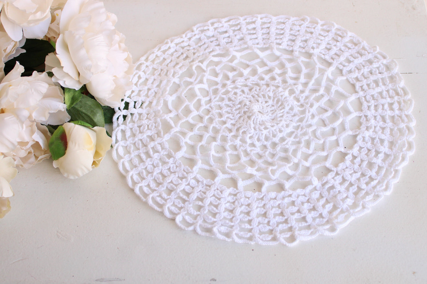 Simple vintage round white crocheted doily. Thicker weave. I believe this is circa 1960s. Looks and feels like a thick cotton or cotton blend.